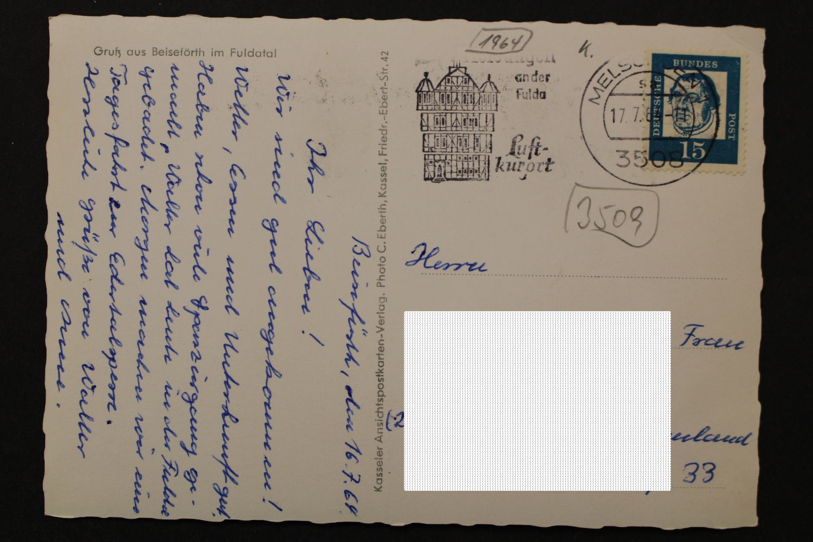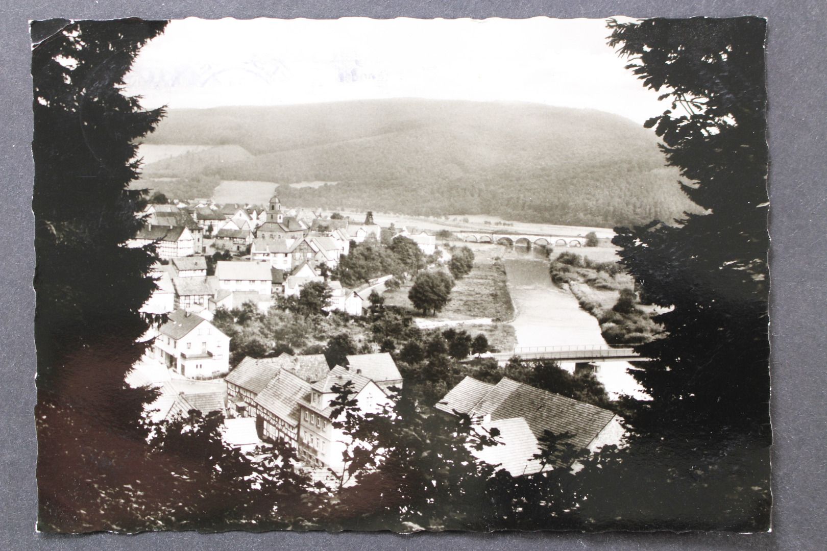Karte gelaufen, etwas bestoßen, leicht fleckig, Eckknick links oben