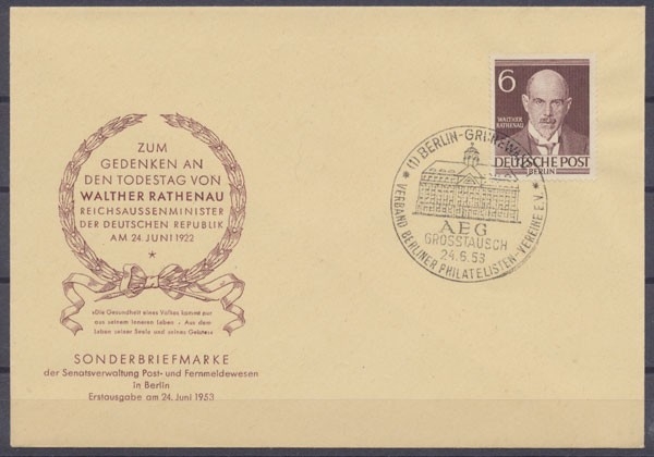 6 Pf. Walther Rathenau, illustrierter Umschlag mit Ersttagssonderstempel Berlin