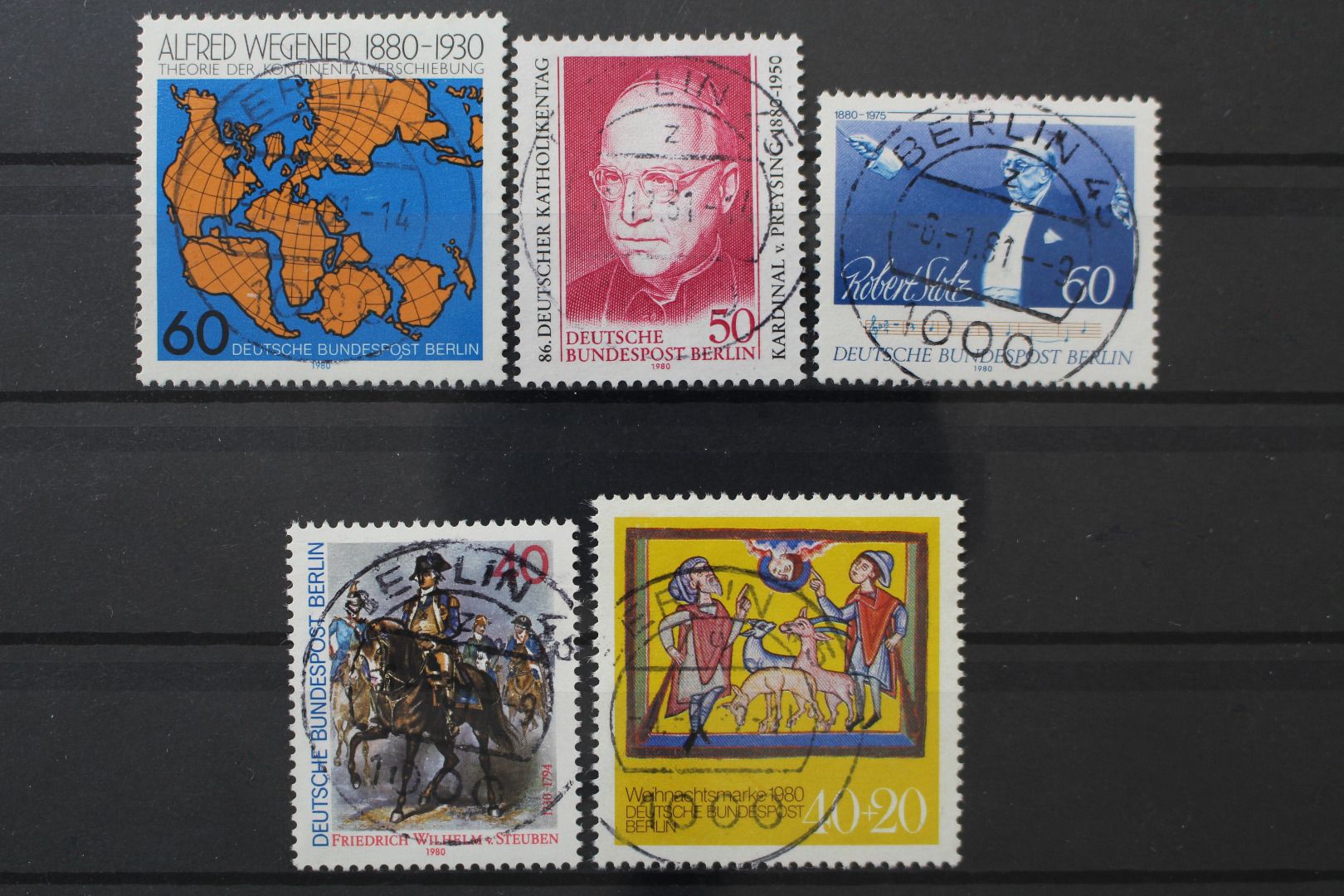 Berlin, MiNr. 616, 624, 627, 628 + 633 zentrisch Berlin 45, gestempelt