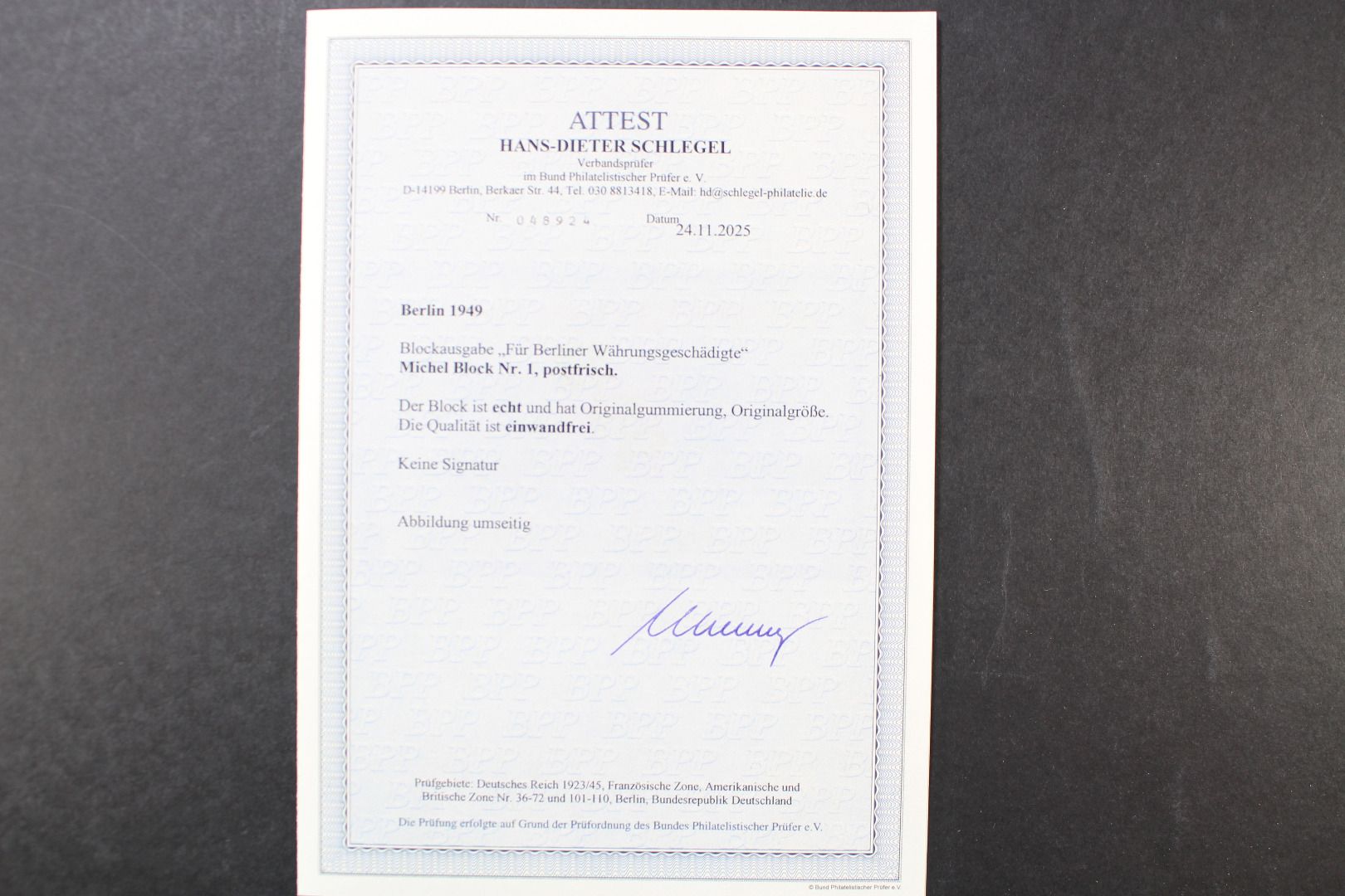 Währungsgeschädigte, Blockausgabe, Fotoattest Schlegel (11/2025)