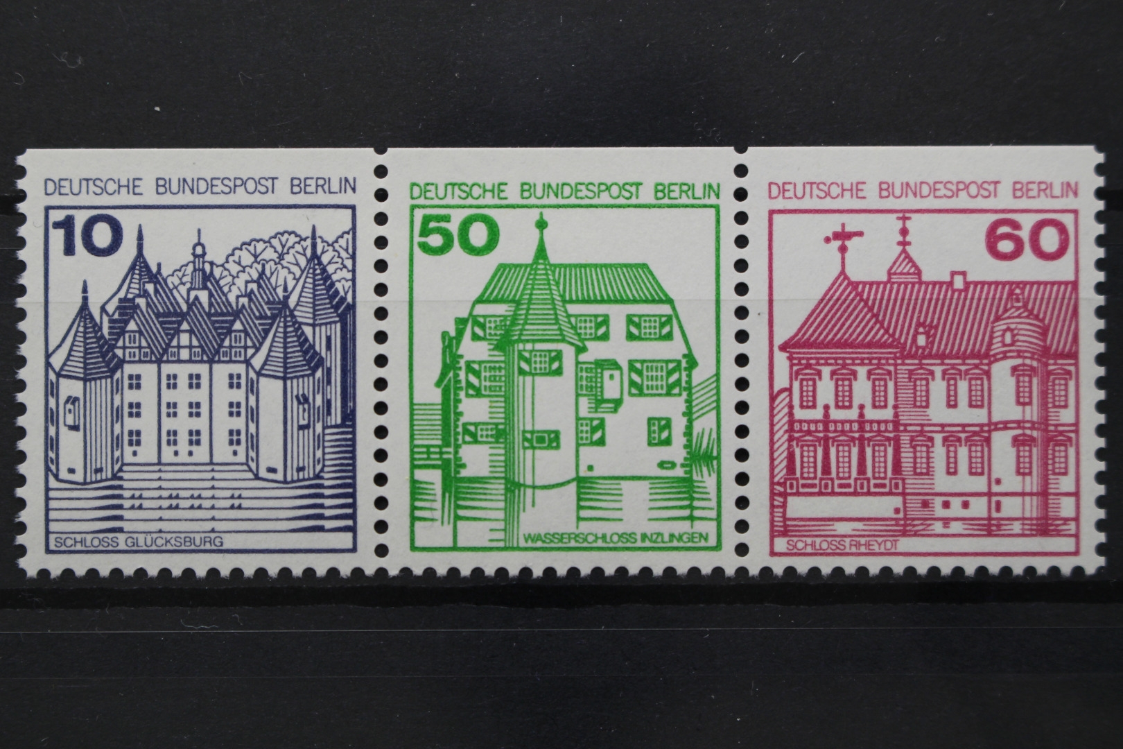10 + 50 + 60 Pf. Burgen und Schlösser, oben geschnitten.