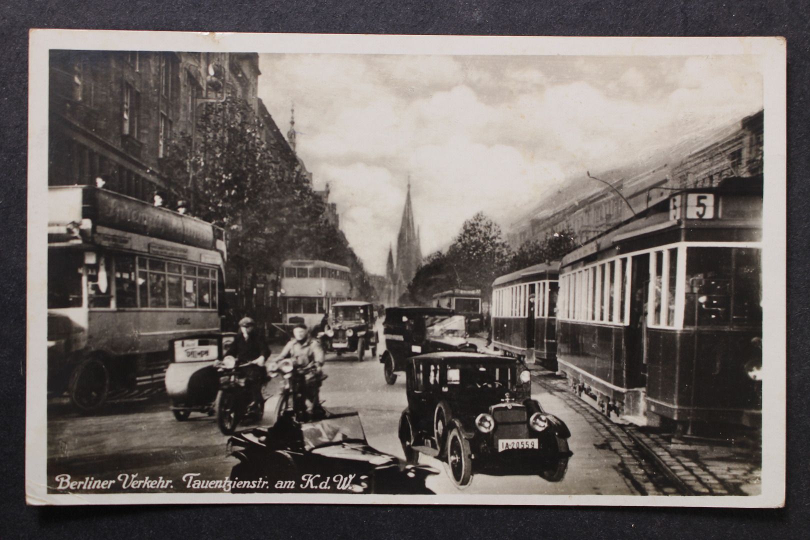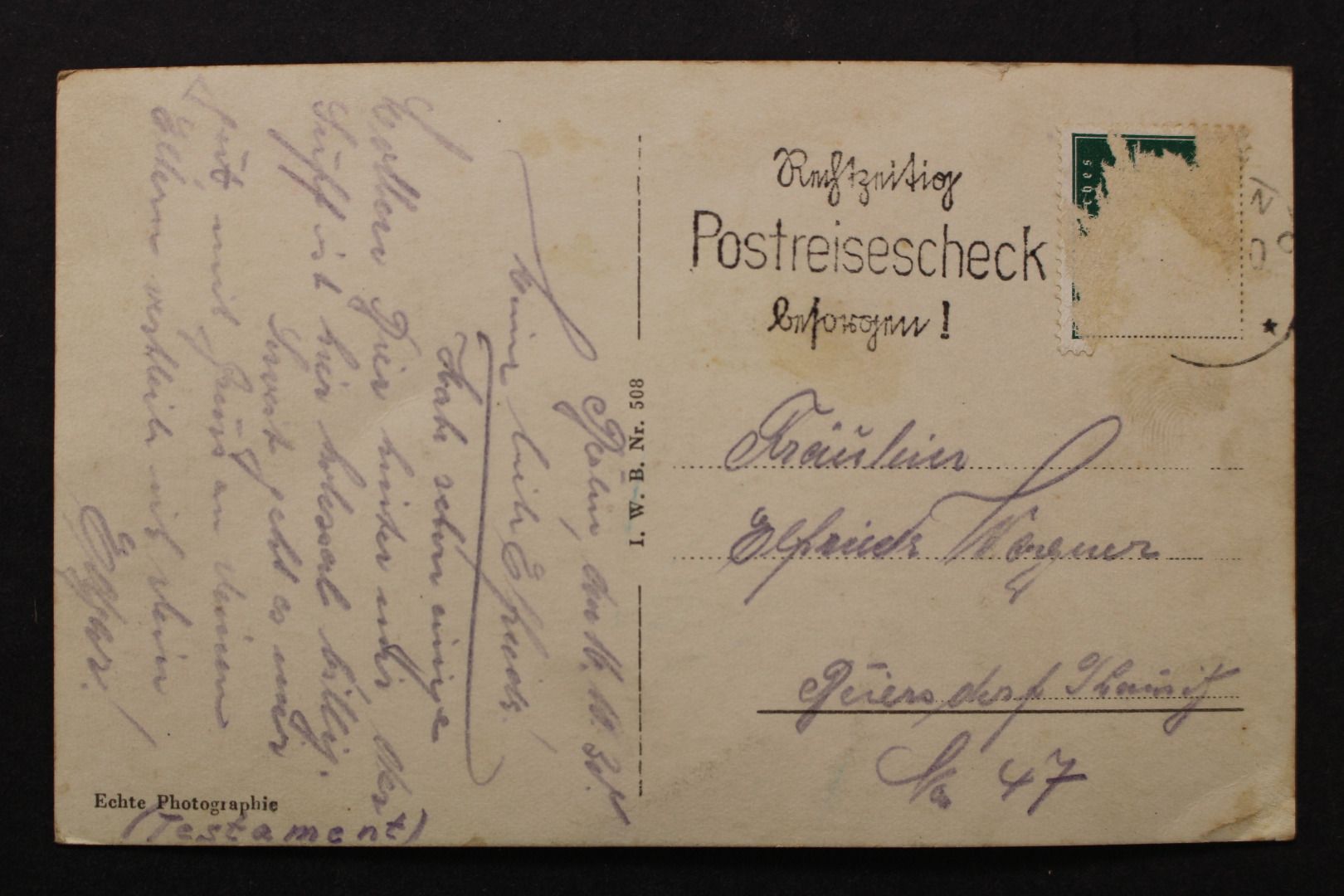 Karte gelaufen, Ecken etwas bestoßen, leicht fleckig, kleiner Eckknick links unten, oben 1 mm Einriss, Marke beschädigt