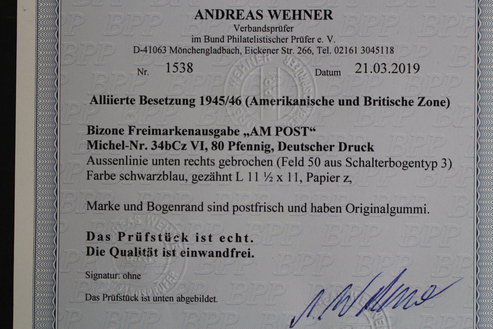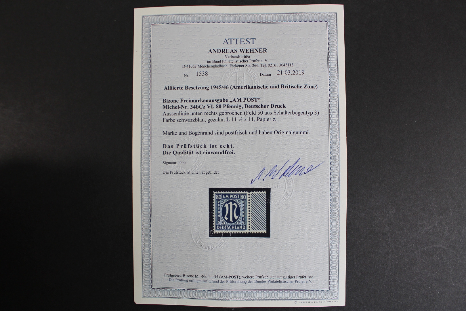 80 Pf. AM-Post, rechter Rand, b-Farbe, mit Plattenfehler: Linie unten rechts gebrochen. Fotoattest Wehner (3/2019) "echt und einwandfrei".