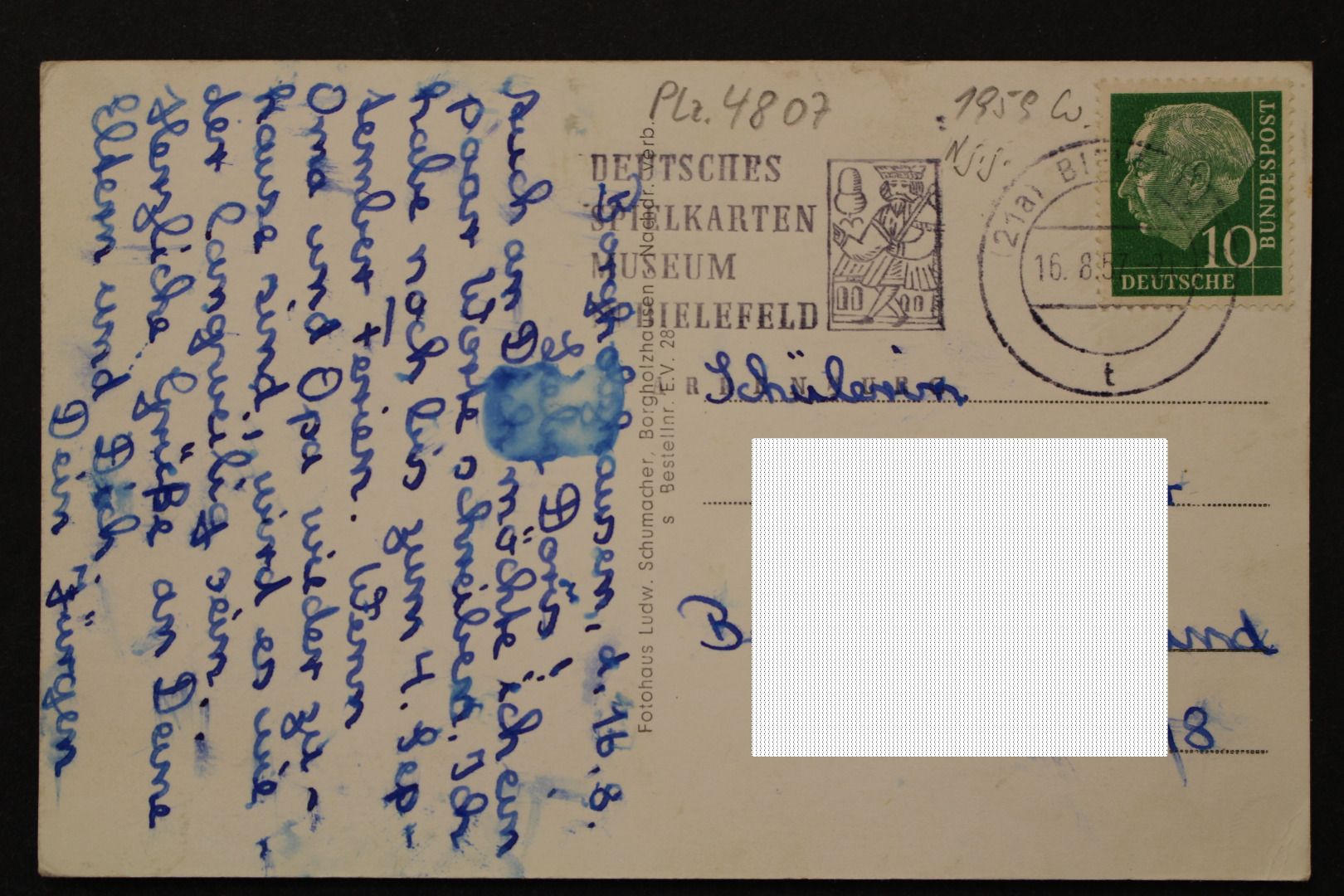 Karte gelaufen, etwas bestoßen, leicht fleckig