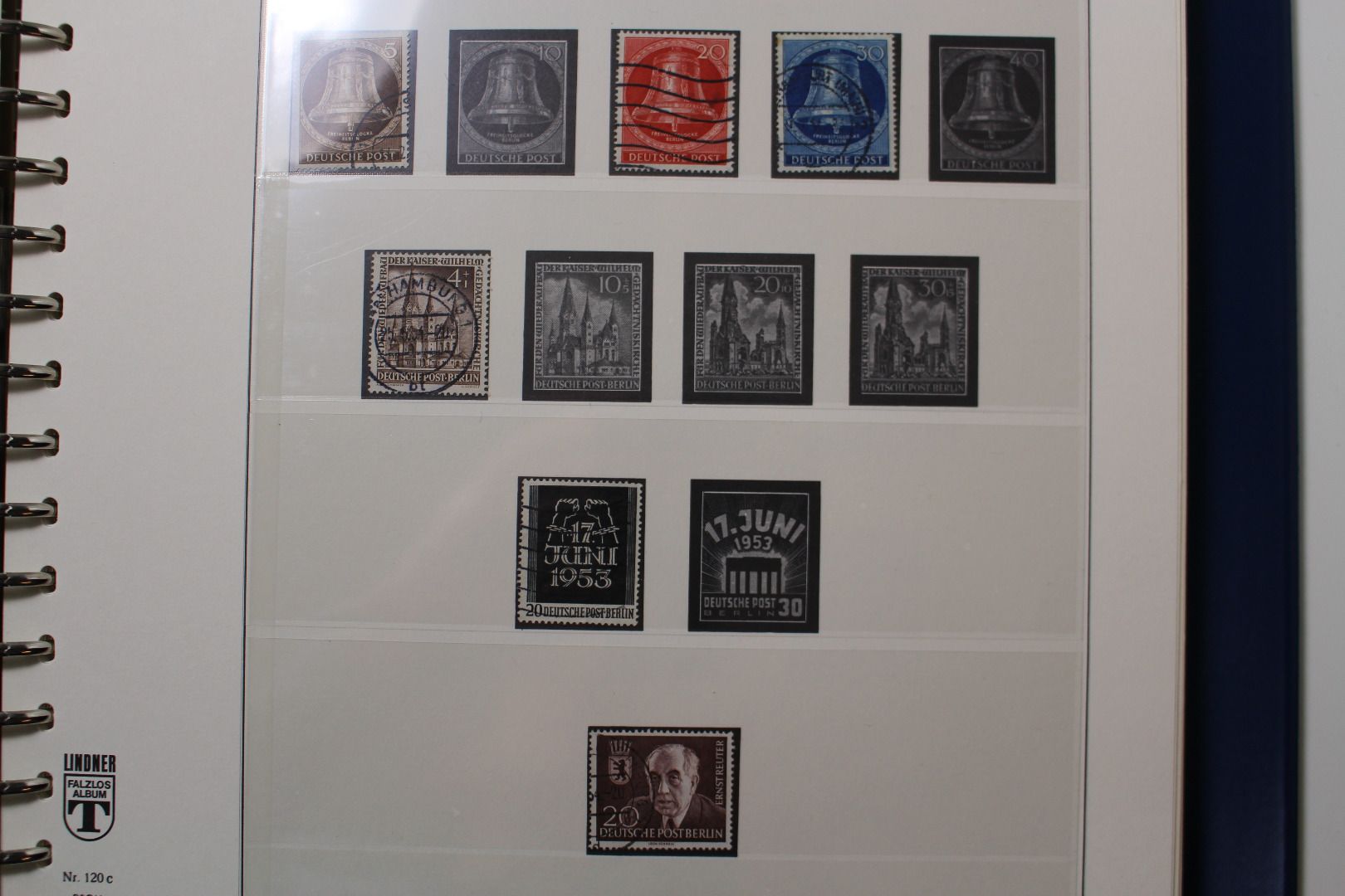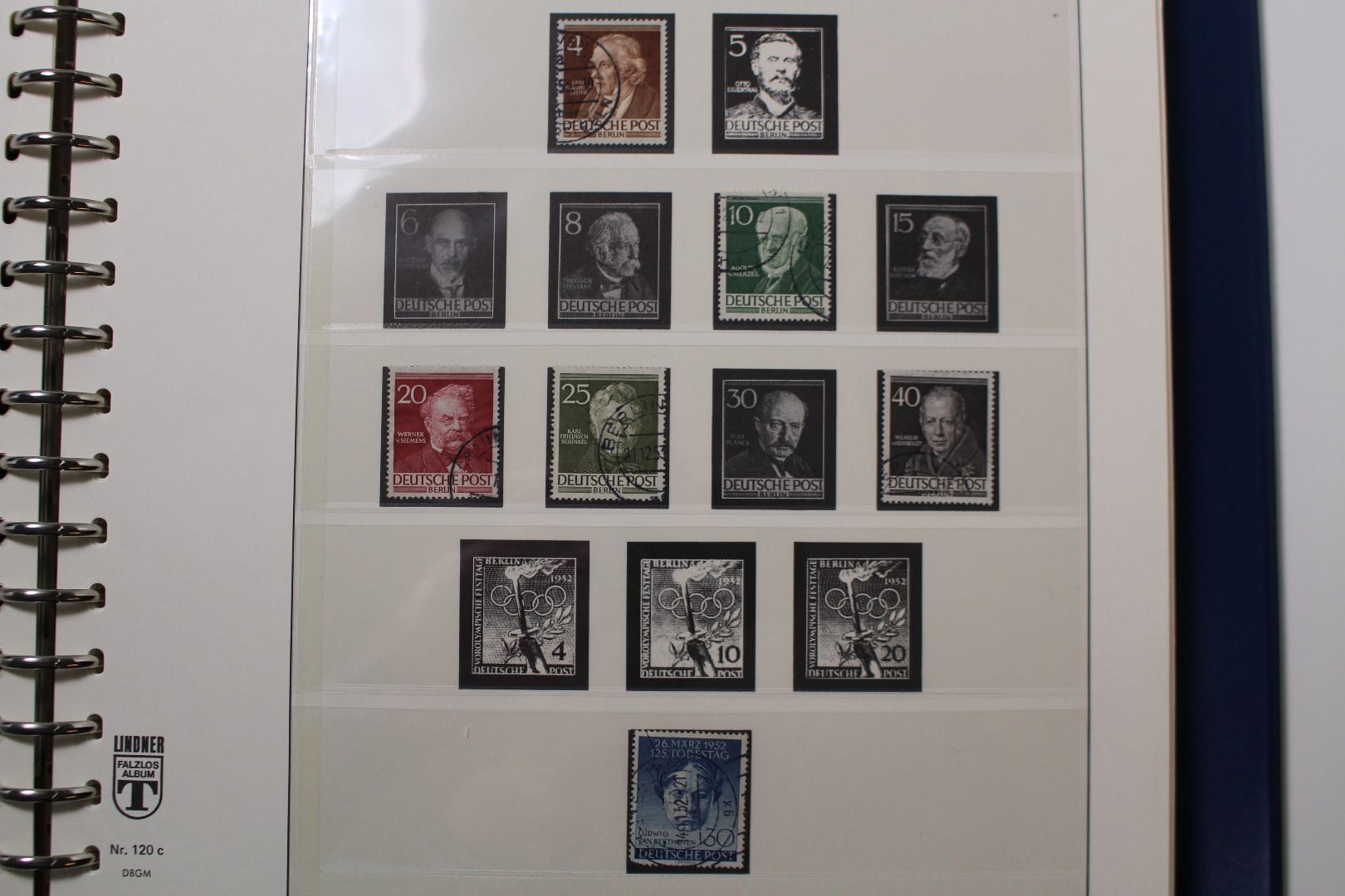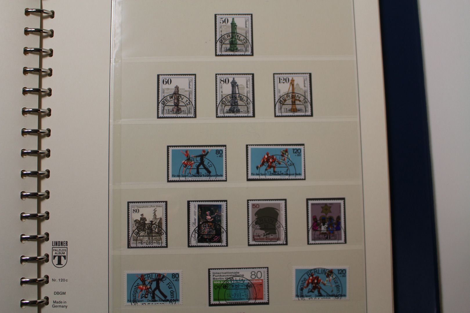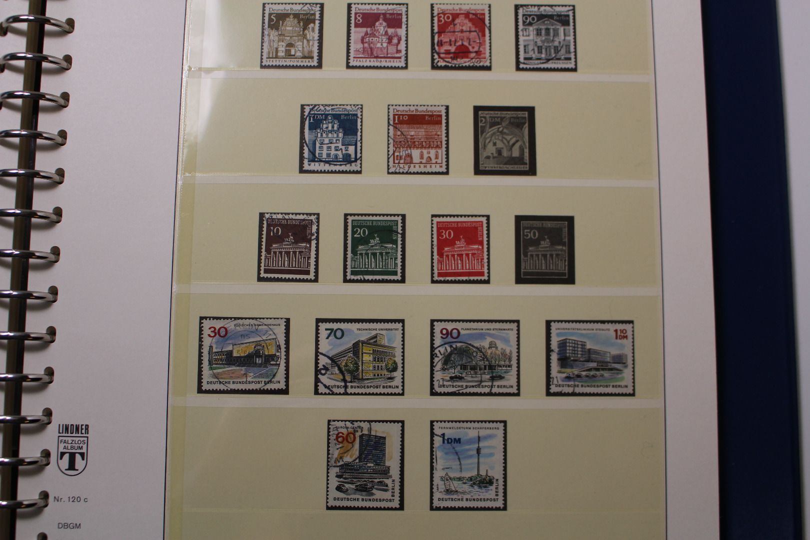 Die Berlin Sammlung in 2 Lindner T Vordruckalben mit einigen besseren Anfangsausgaben, sonst ab Ende der 1950er bis Mitte der 1980er Jahre ganz gut besetzt. Die BRD in 5 Borek Vordruckalben bis zum Jahr 2000. Ab Mitte der 1950er Jahre meist postfrisch umfangreich. Einige Jahre der Borek Vordrucke mit schwarzen Klemmtaschen. Die Qualität ist unterschiedlich.
