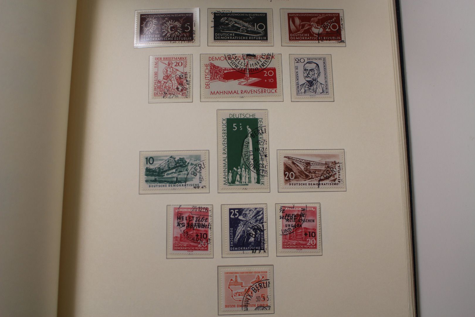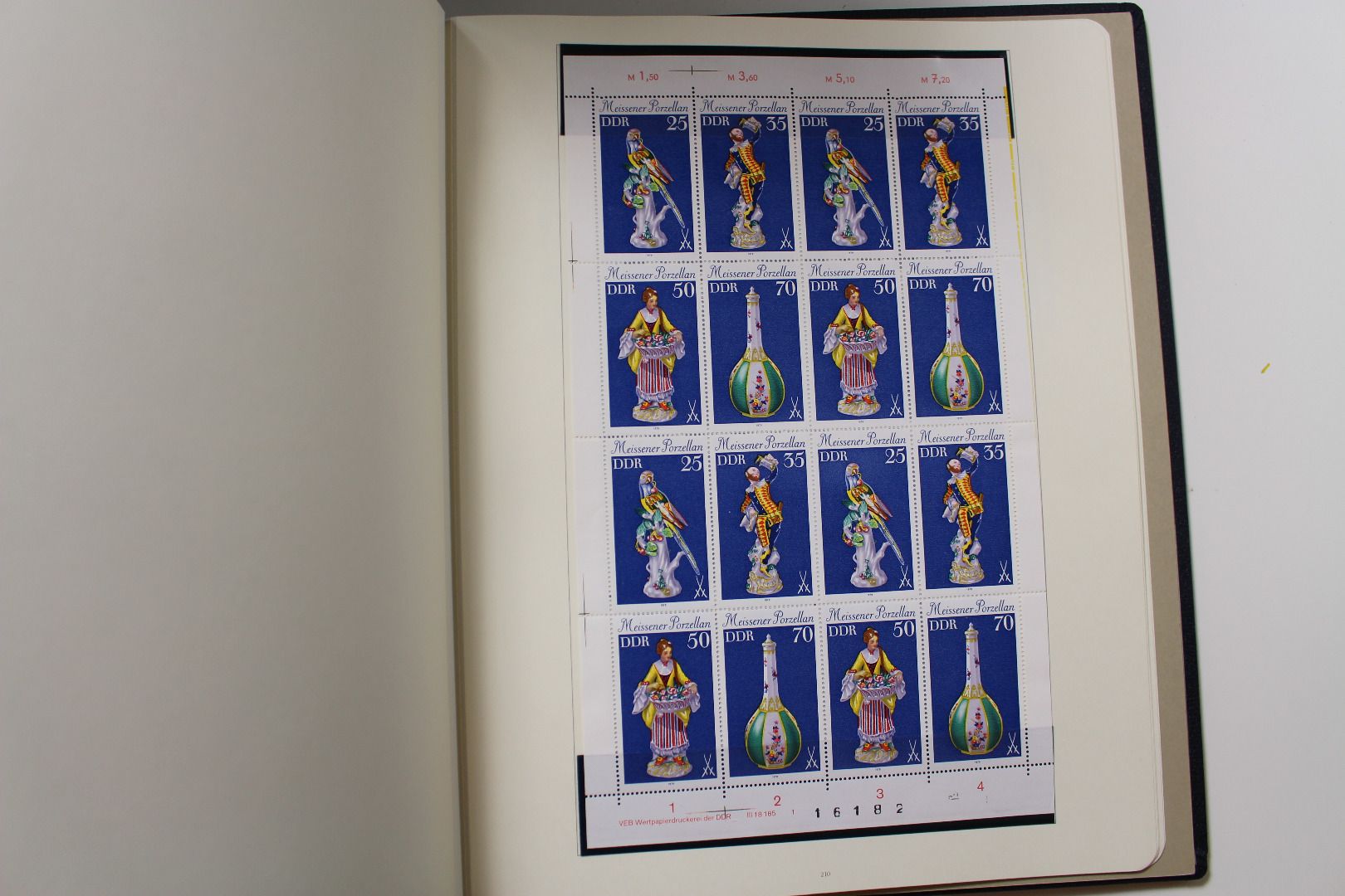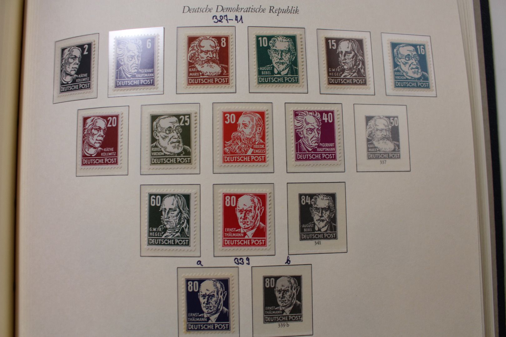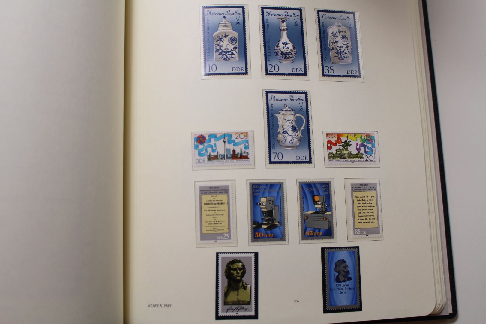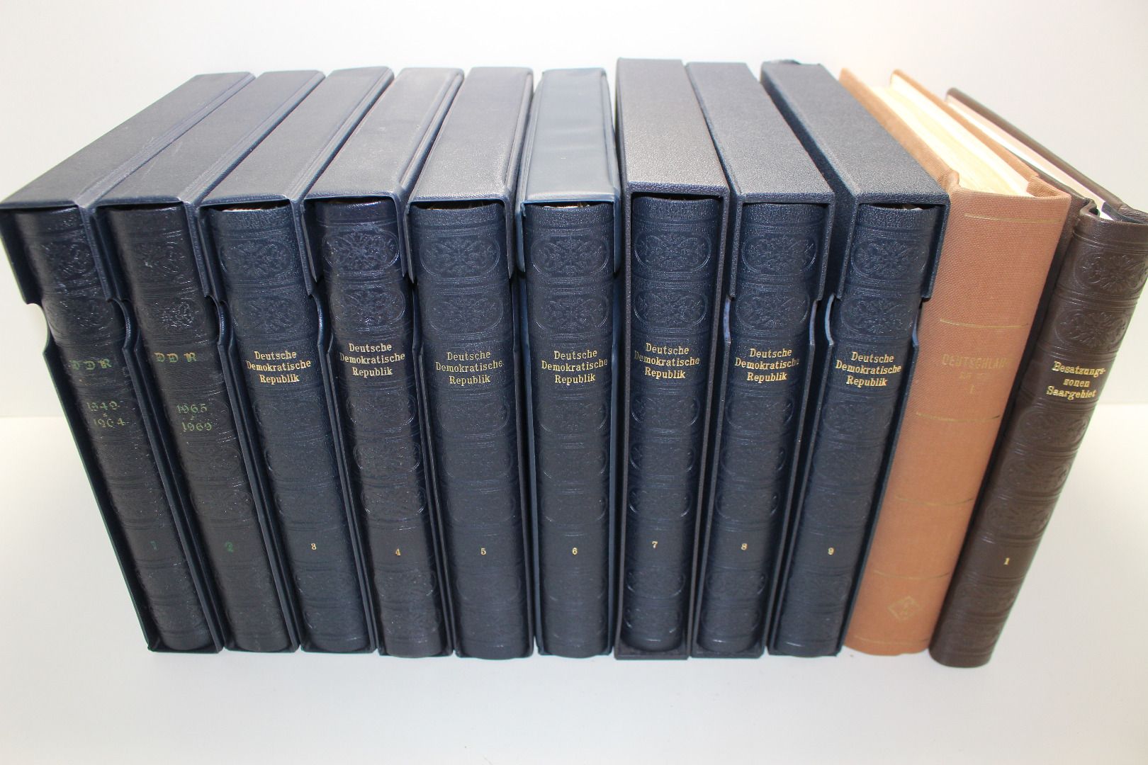DDR von 1949-1990 in 9 Borek Vordruckalben mit vielen Besonderheiten wie die Einzelmarken aus Blockausgaben und Kleinbögen, einigen Zussammendruckbögen, Schwarzdrucken usw. Dazu gibts noch etwas BRD und Berlin sowie Zonen. Die Qualität ist unterschiedlich.