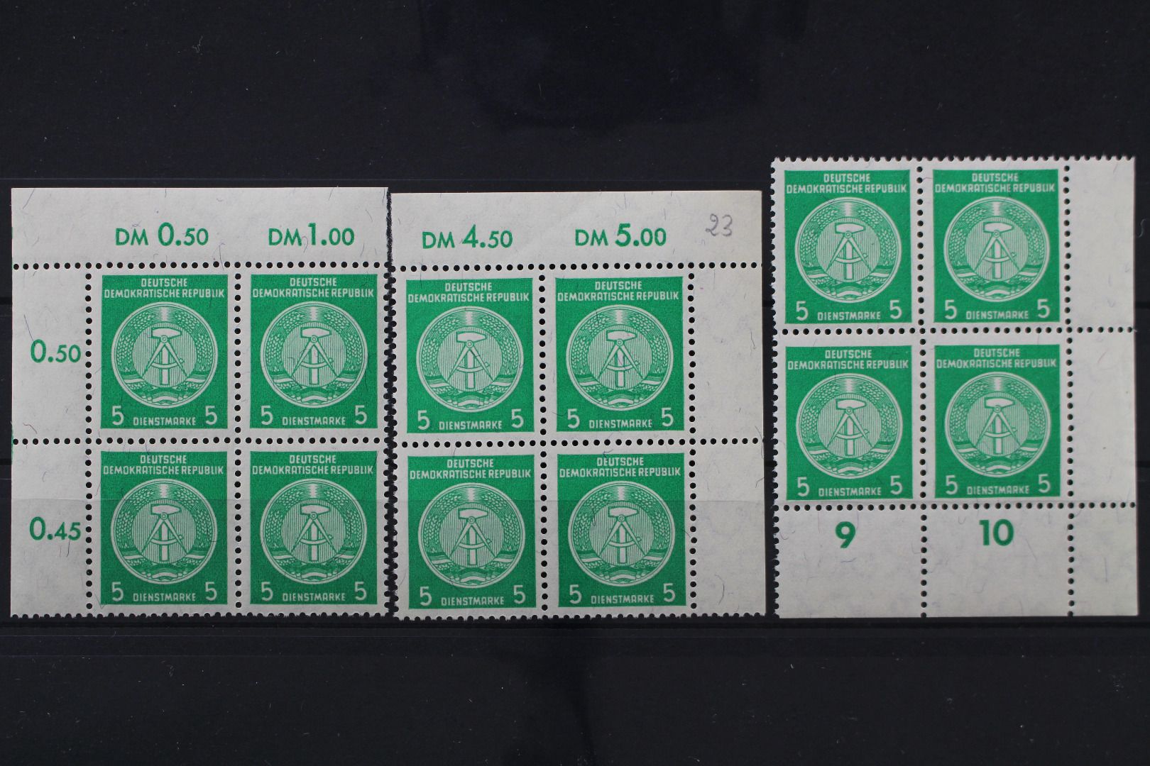 DDR Dienst A, MiNr. 34 A, Viererblöcke Ecke 1, 2,4, postfrisch