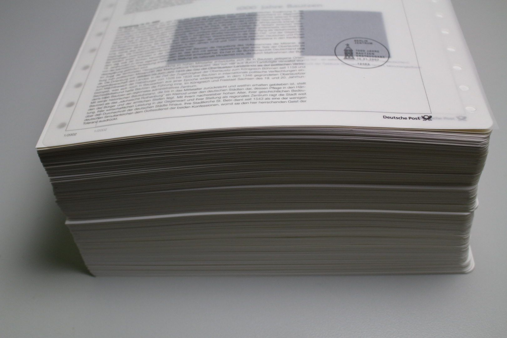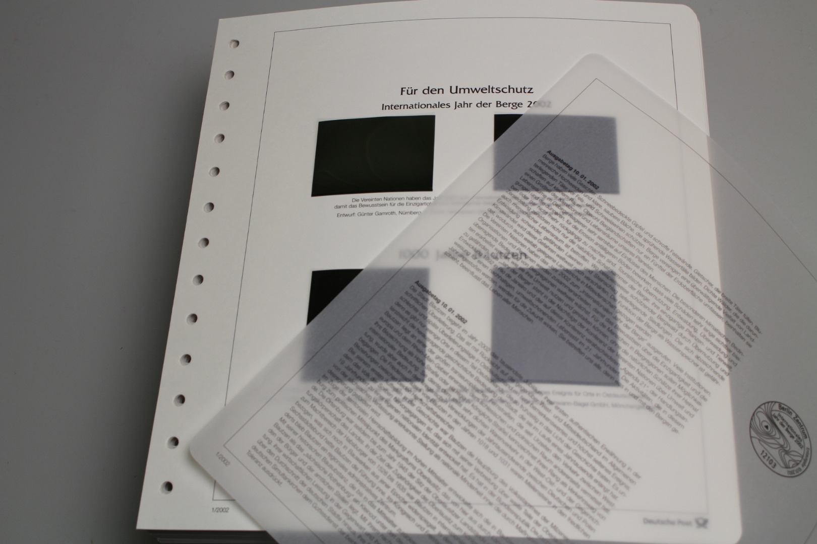 Kompletter Vordrucksatz für postfrische und gestempelte Eckrandmarken, mit schwarzen Klemmtaschen und Textblättern, ohne Ringbinder. Ohne die selbstklebenden Ausgaben. Gute gebrauchte Erhaltung.
