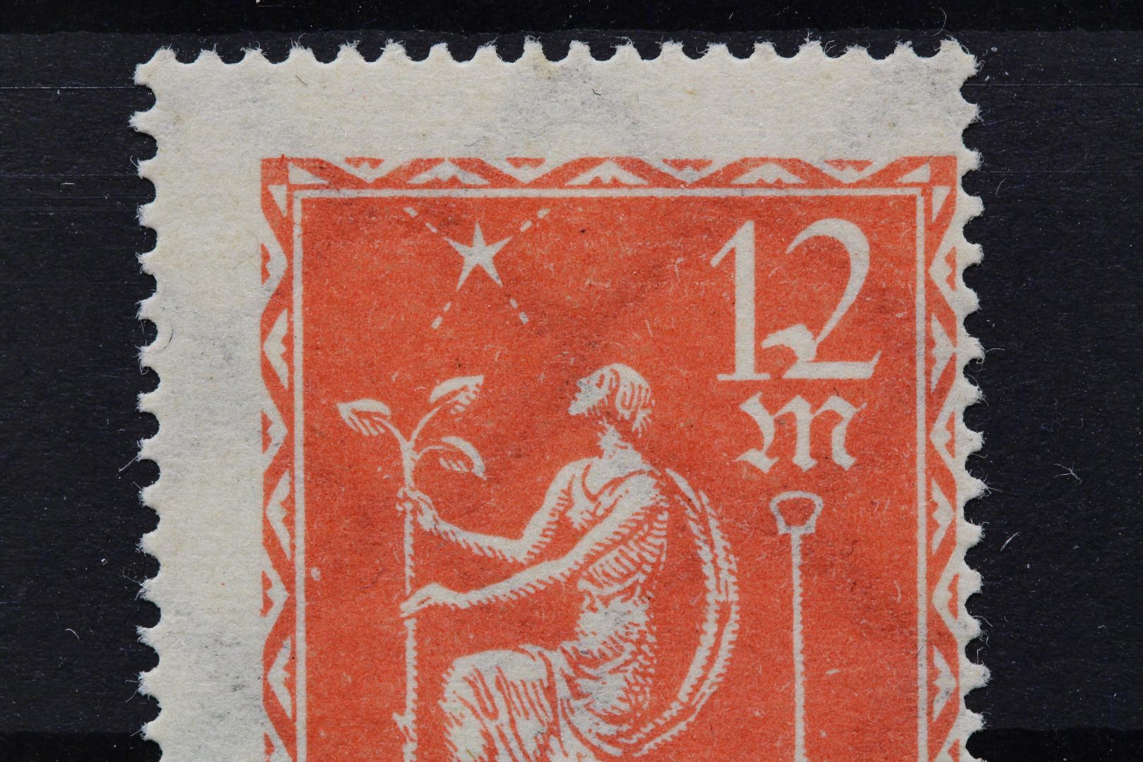 12 M Altershilfe, Plattenfehler: Haken am Fuß der "2" der Wertangabe, geprüft Infla-Berlin