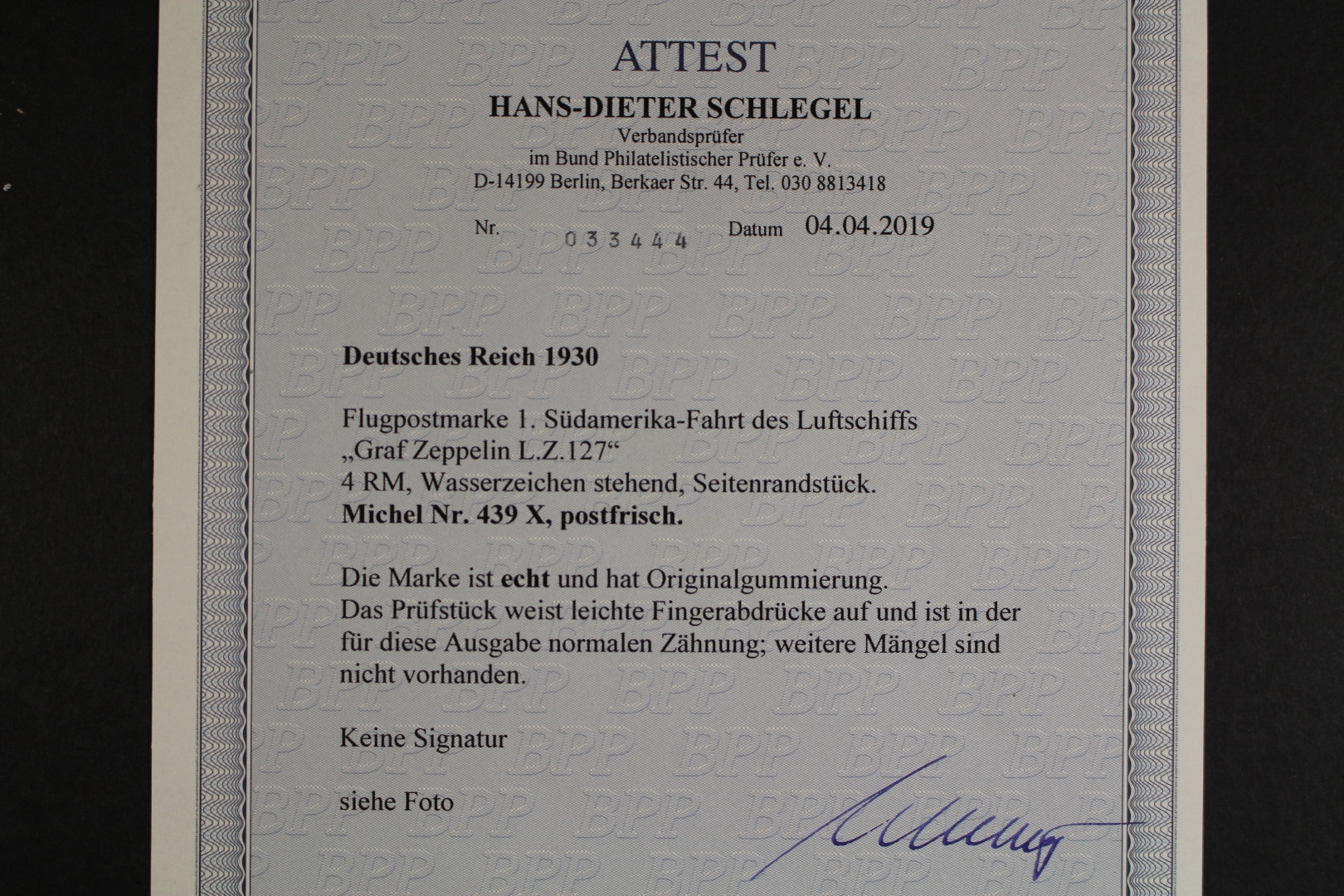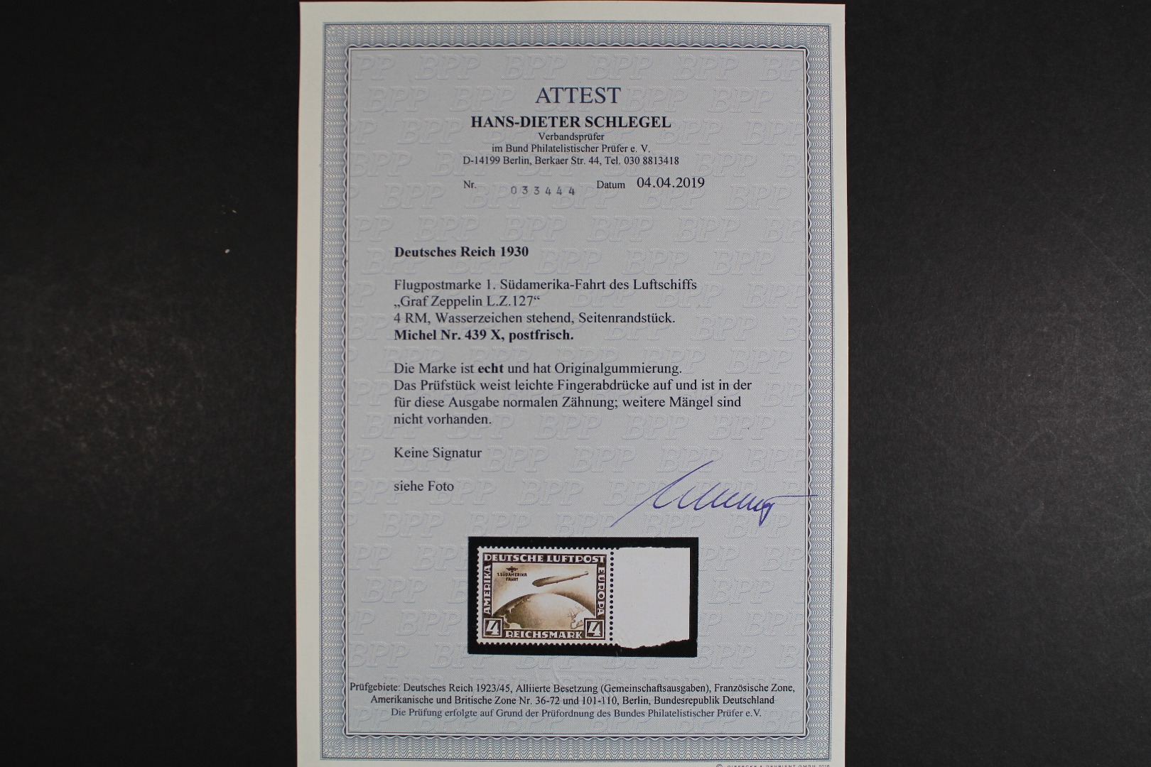 4 RM Südamerikafahrt, Wasserzeichen stehend, rechter Rand. Einige Fingerspuren auf der Gummierung. Fotoattest Schlegel (4/2019).
