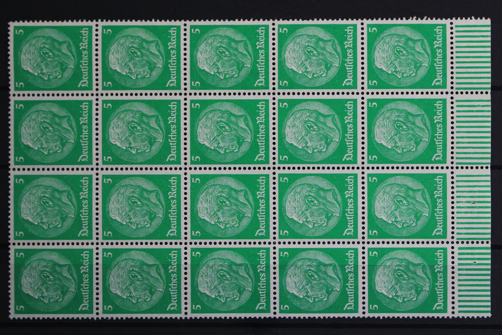 5 Pf. Hindenburg. Bei den Ausgaben 512-528 wirken Einheiten aufgrund der Papierbeschaffenheit oft wie angefaltet.