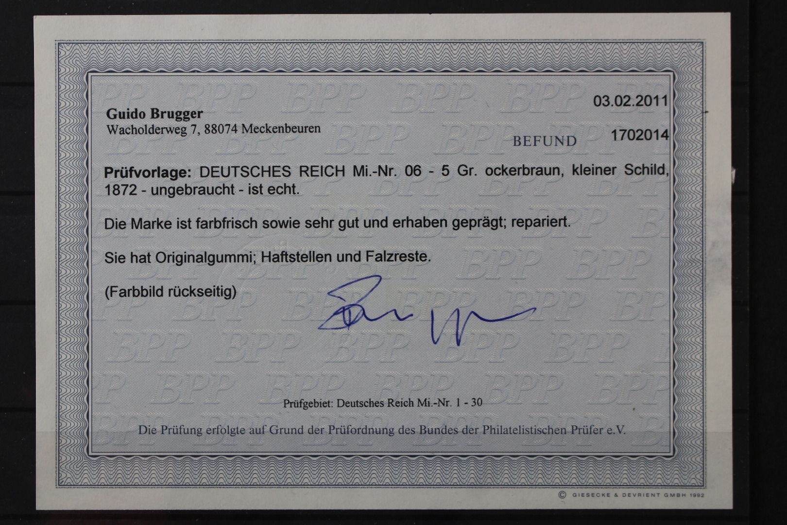 5 Groschen Brustschild, Gummianhaftungen und Falzrest, repariert, Fotobefund Brugger (2/2011). Befund rückseitig beschädigt