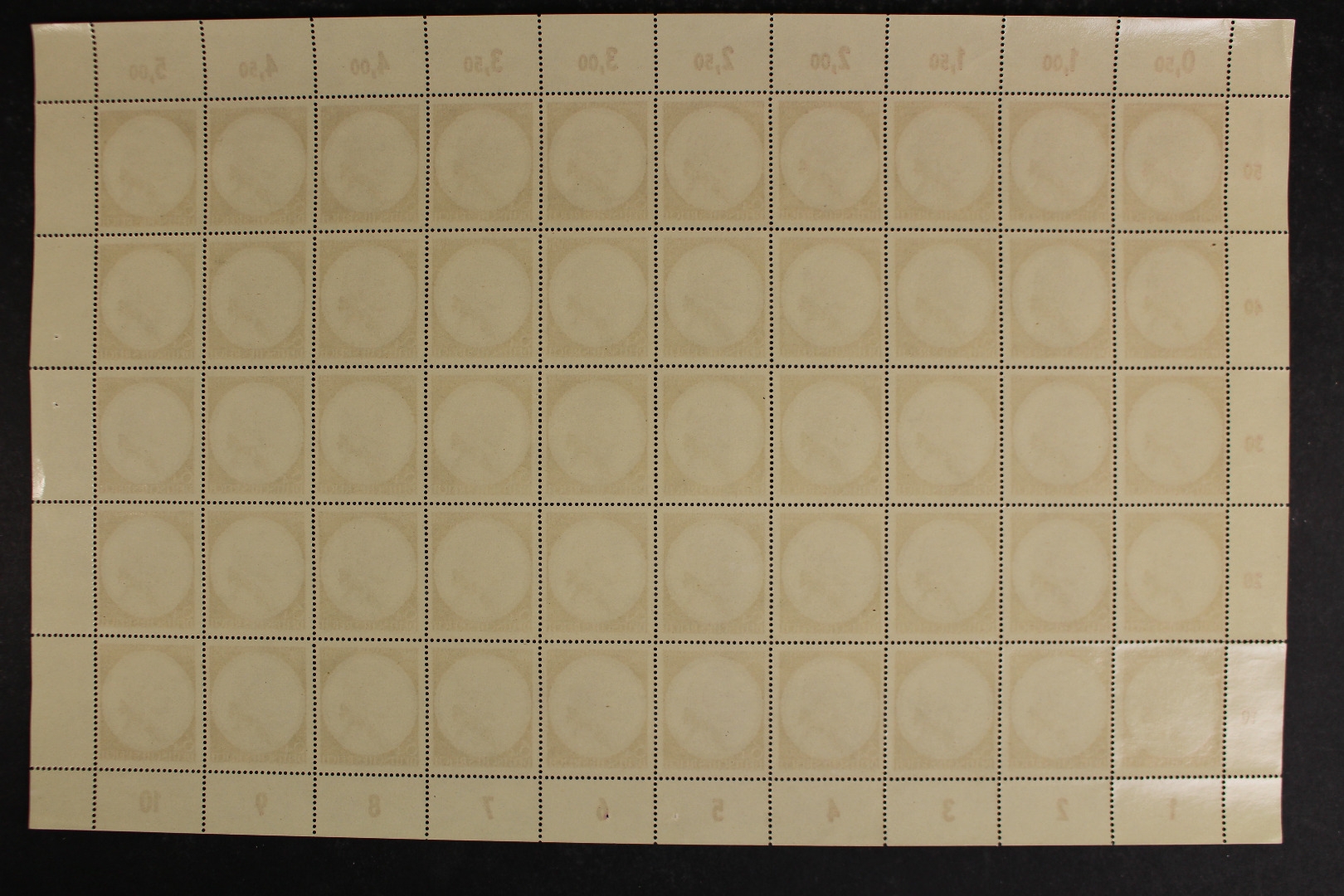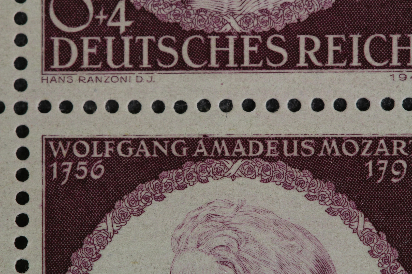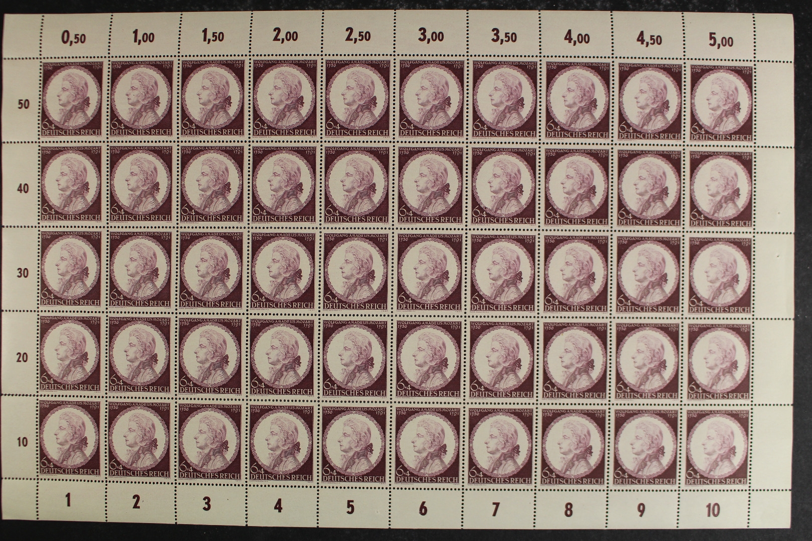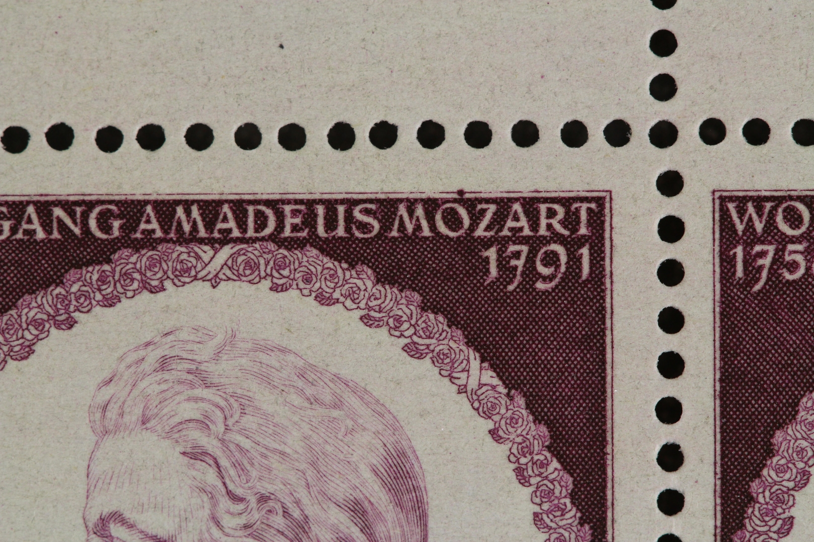 Mozart, incl. beider Plattenfehler (Feld 4 und 35). Links bis zu einer Marke angetrennt, Ränder teils angetrennt.