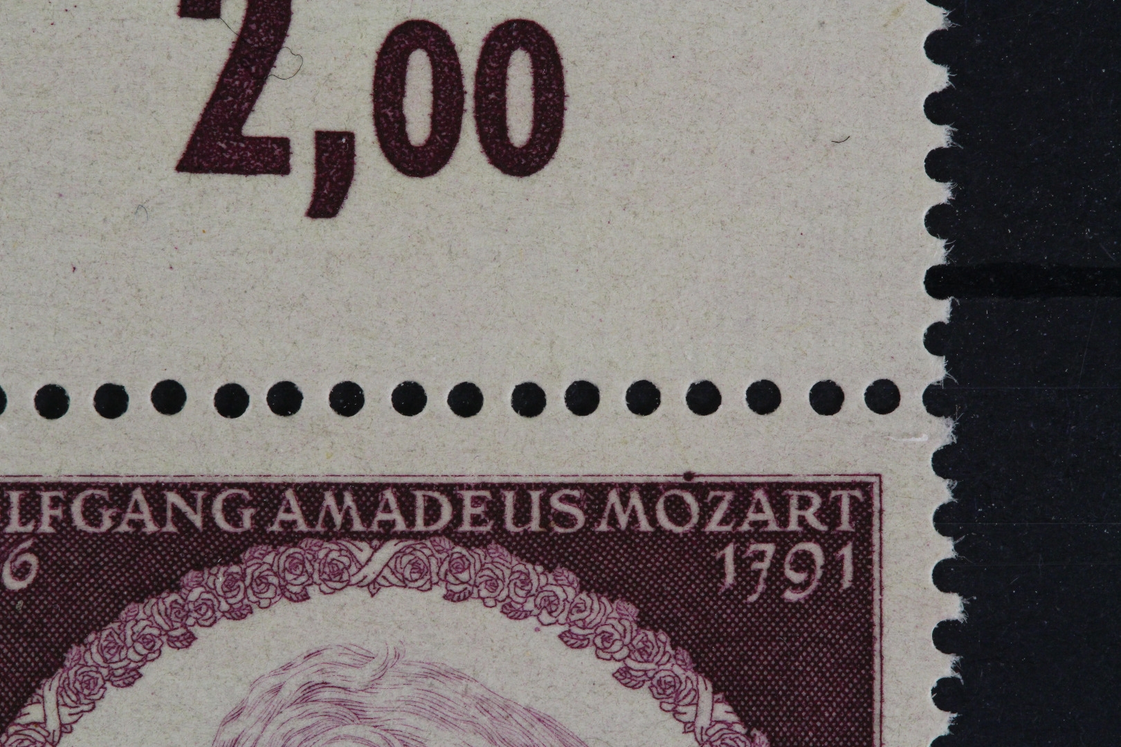 Mozart, Plattenfehler: Punkt im Oberrand über "OZ" in "Mozart". Im Rand links waagerecht etwas angetrennt.