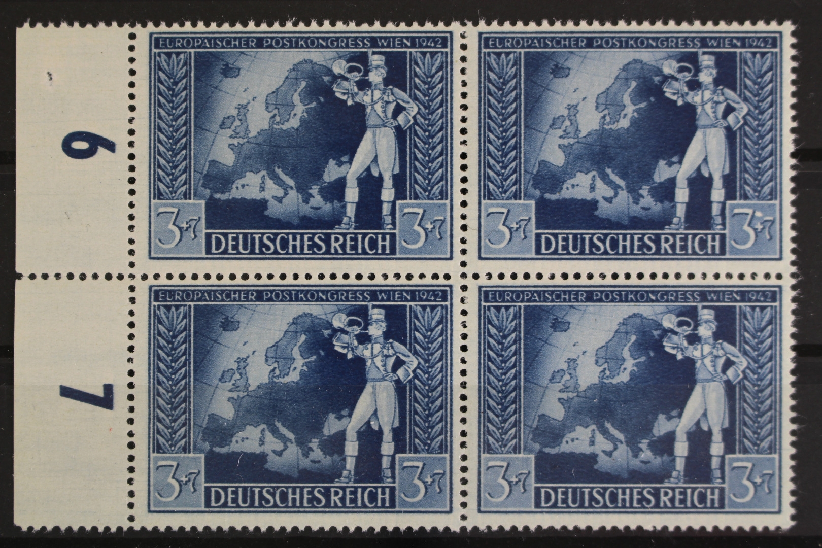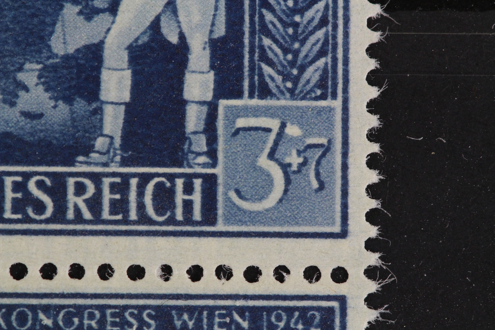 3 Pf. Postkongreß, Plattenfehler: heller Fleck rechts am Kopf der rechten Wertziffer "3". Rand angetrennt.