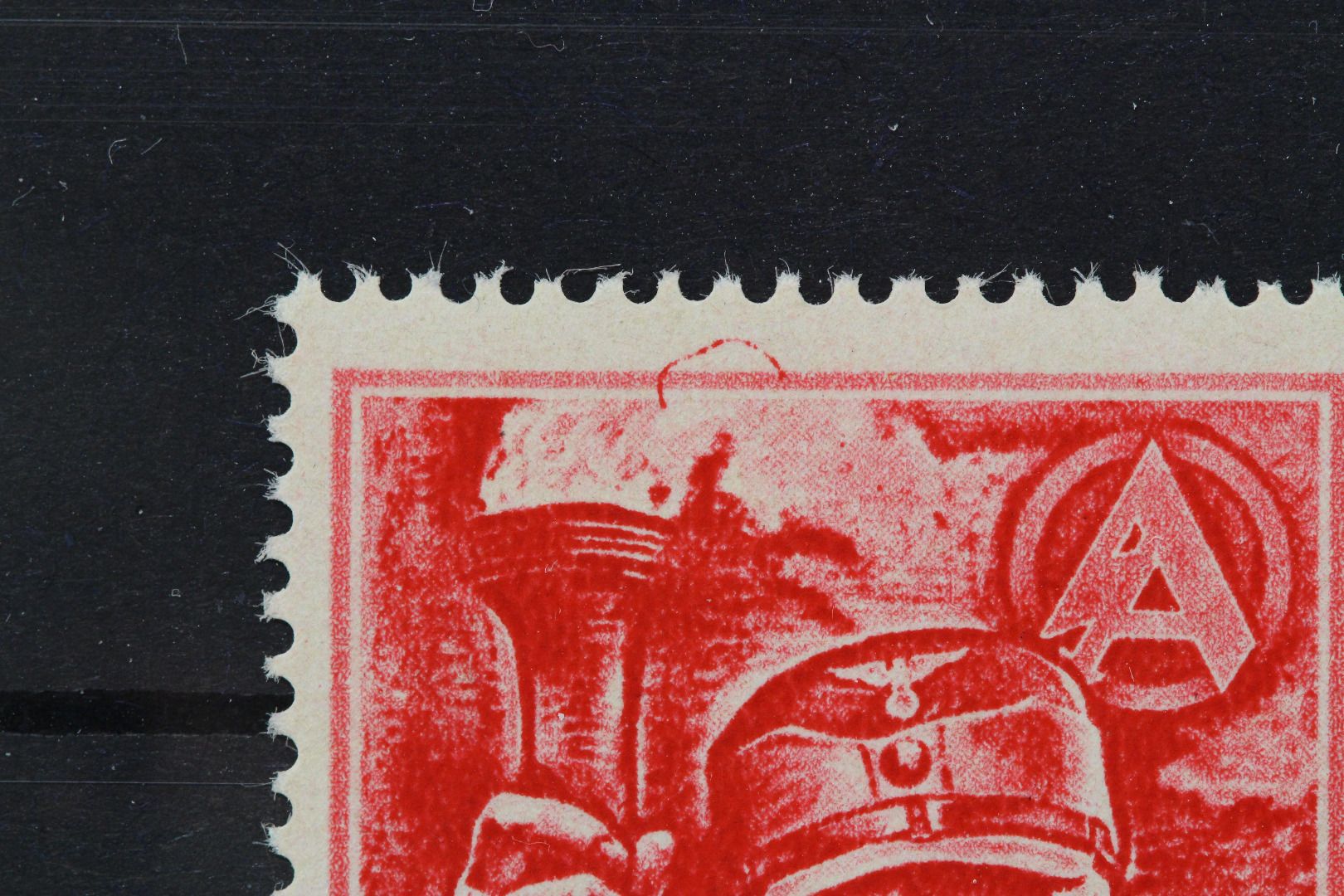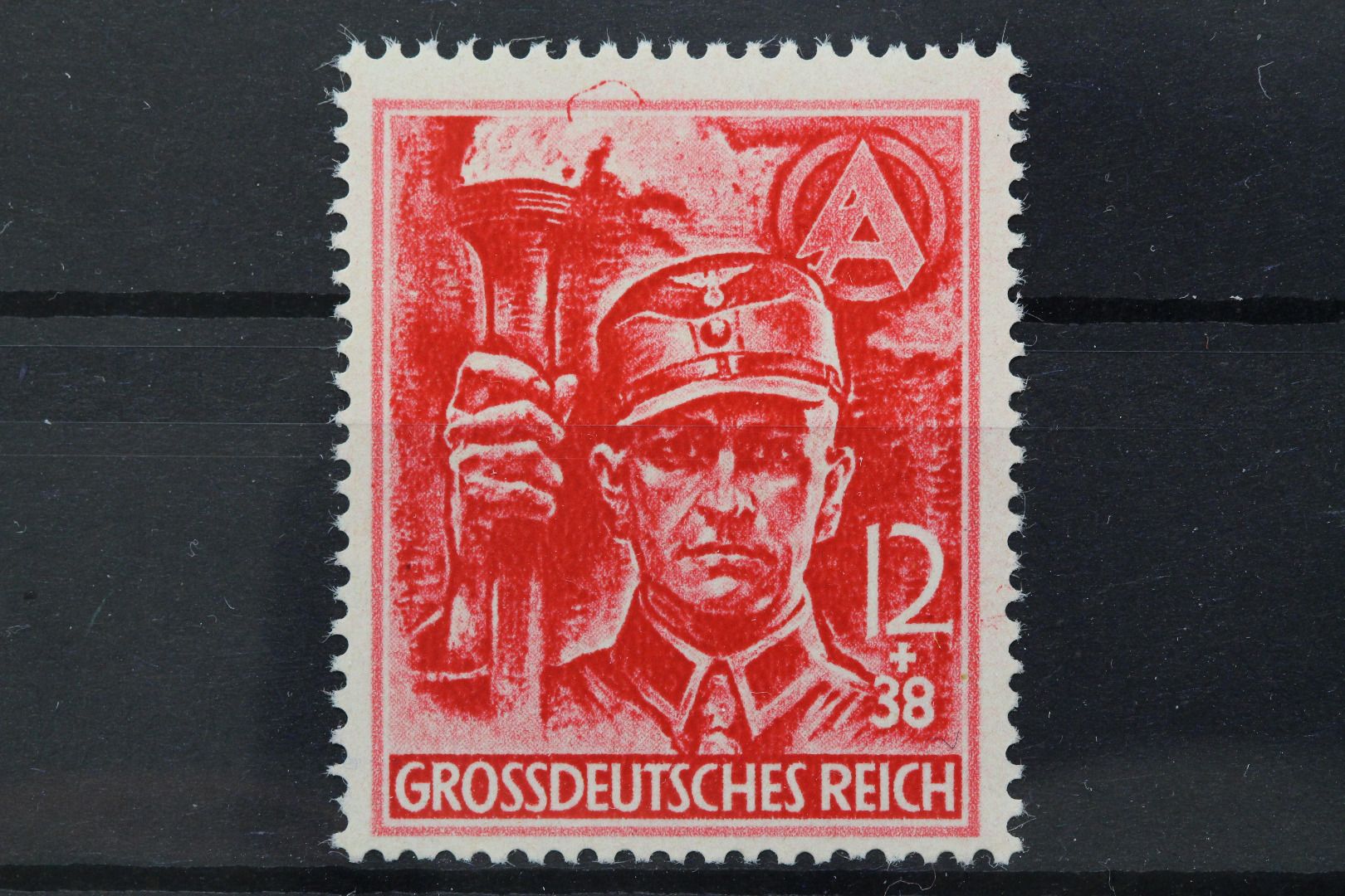 12 Pf. SA-Mann mit Plattenfehler: Farbstrich im Markenoberrand.