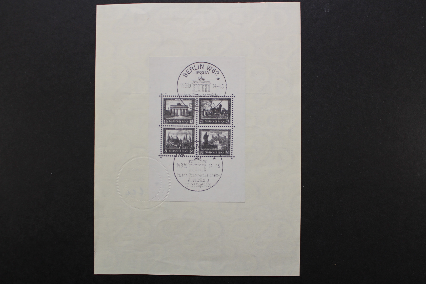 IPOSTA-Blockausgabe von 1930, schöner Block in Originalgröße, gestempelt mit dem Sonderstempel der Messe (14.9.30). Gem. dem Fotoattest von Peschl aus dem Jahr 1979 ist der Block in vorzüglichem Zustand. Das ist auch noch heute so. An allen 4 Ecken die üblichen Papierschattierungen der ehemaligen Falzstellen. Der Block ist im Blockrand und auf der 50 Pf Marke zusätzlich geprüft Peschl. Einwandfreie gute Erhaltung. Das Fotoattest ist oben und unten beschnitten.