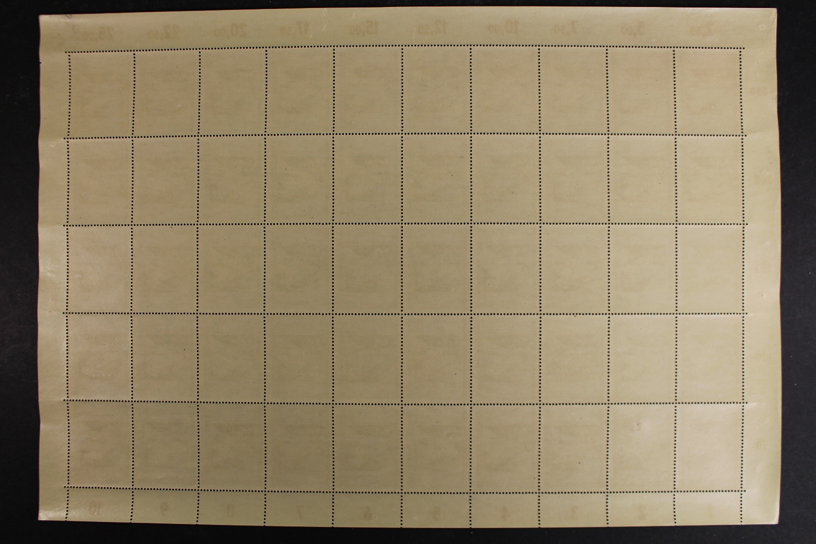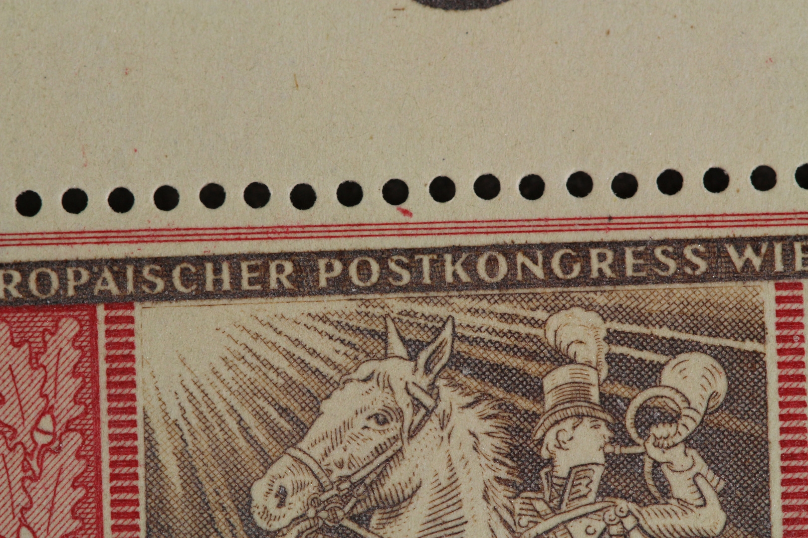 12 Pf. Postkongreß, Schantl- Plattenfehler: roter Strich am Bildrand. Rand oben kleiner Einriss, teils leicht angefaltet. Zwei Marken (Feld 6 und 45) Gummifehler.