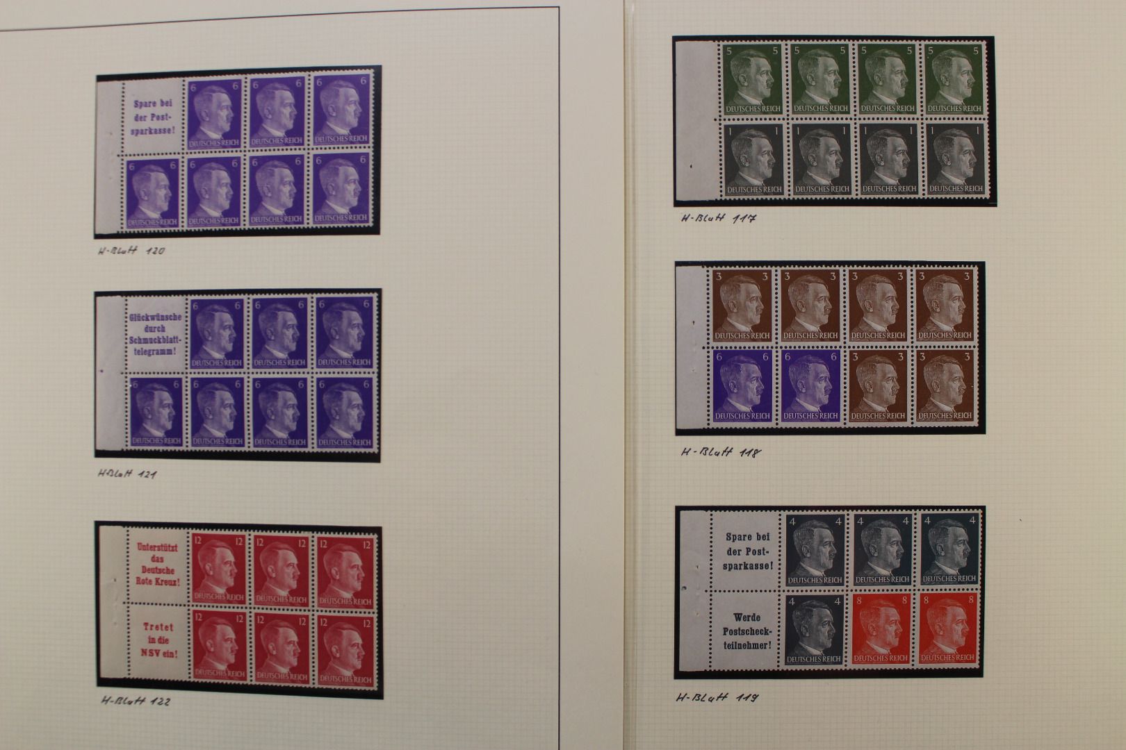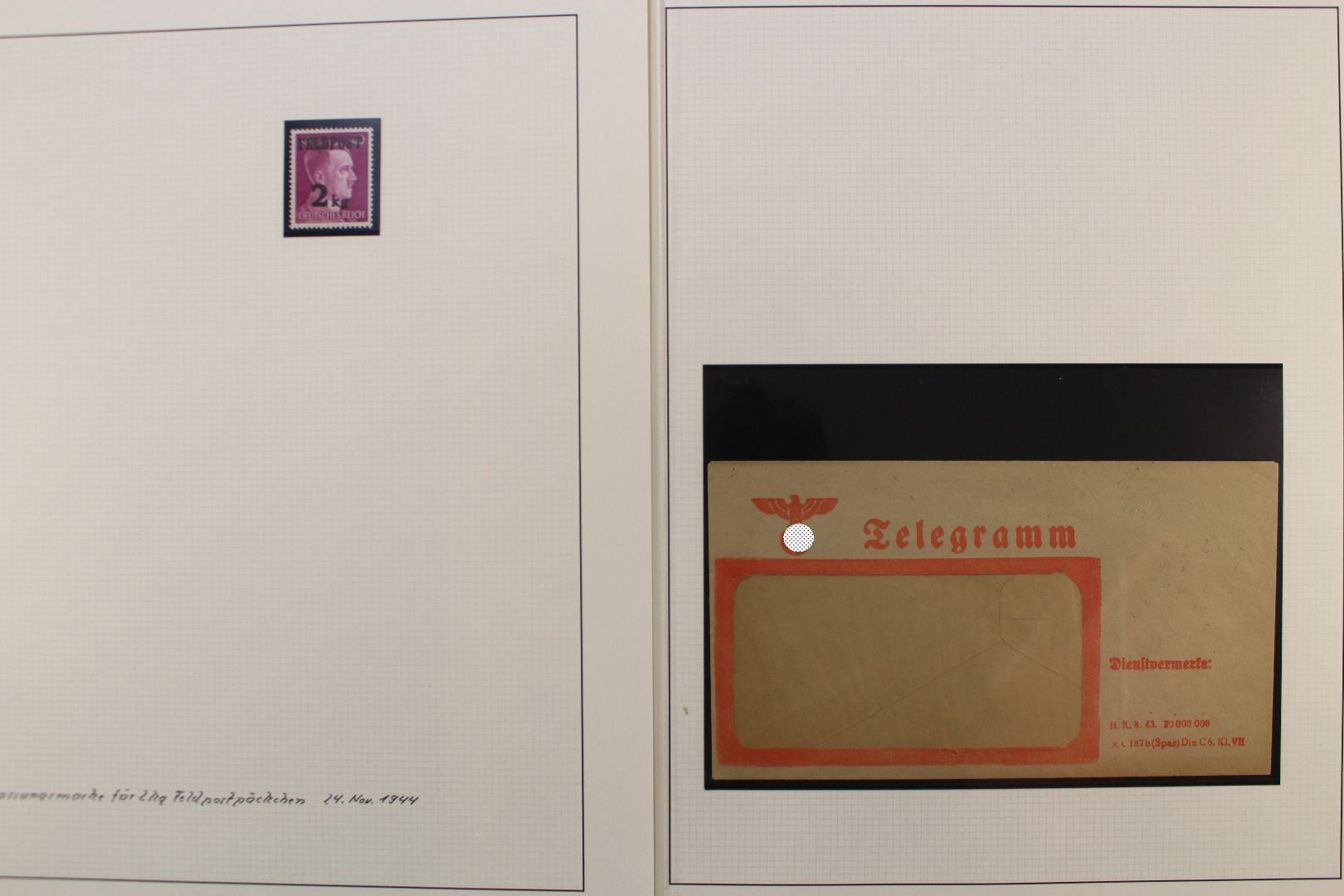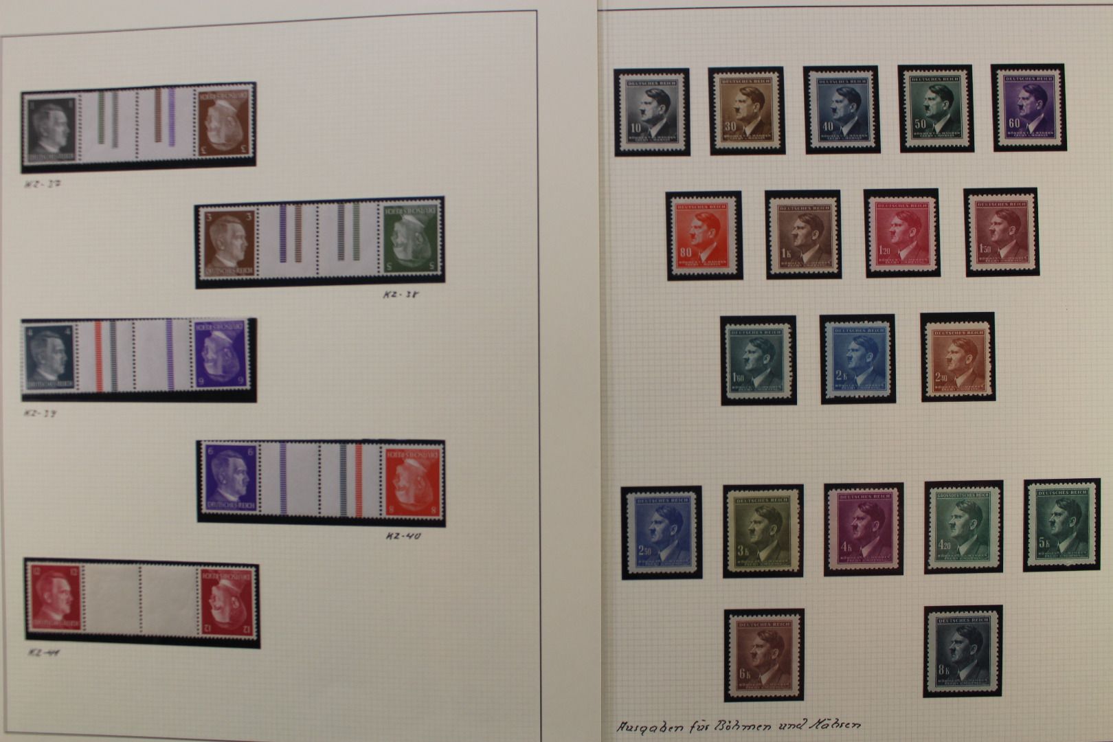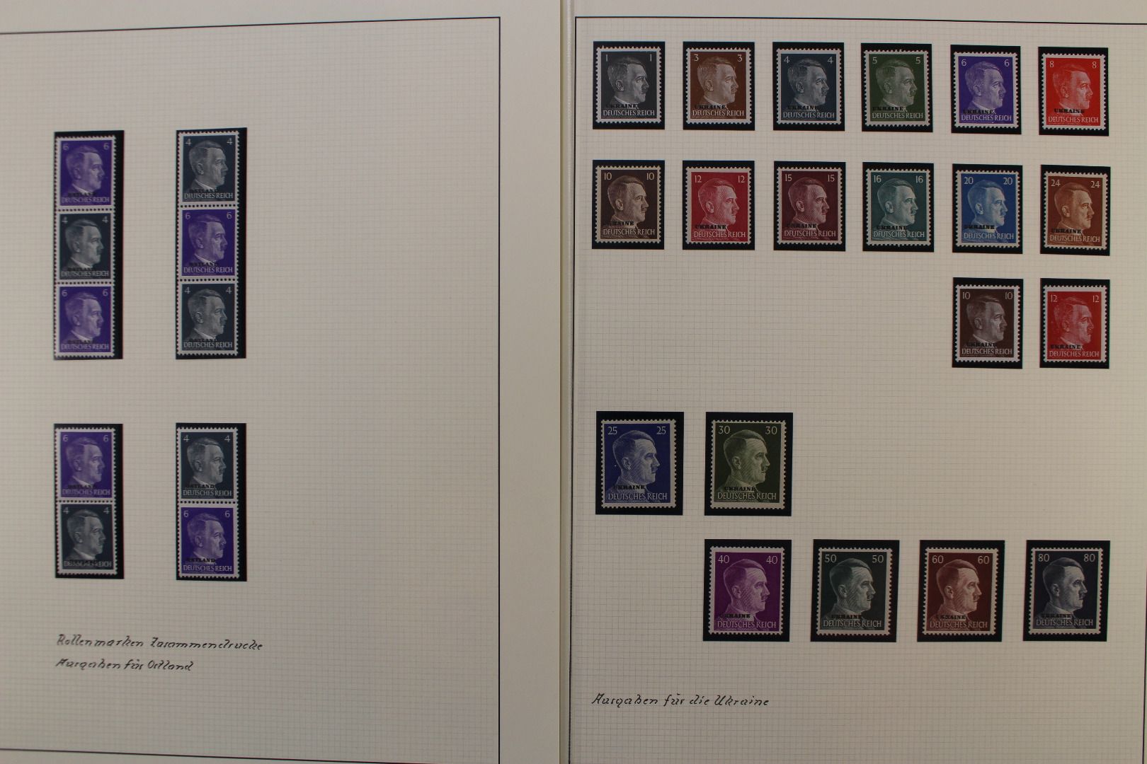 Gesammelt wurden die Hitlermarken aus dem Deutschen Reich, Böhmen & Mähren und Generalgouvernement. Interessant sind einige Zusammendrucke, Heftchenblätter und ein Markenheftchen sowie 3 Telegrammumschläge. Überwiegend gute postfrische Erhaltung. Einige wenige Marken wohl etwas unterschiedlich. Untergebracht in einem Lindner-Kassettenbinder mit Kunststoffhüllen und selbstgestalteten Blankoblättern.