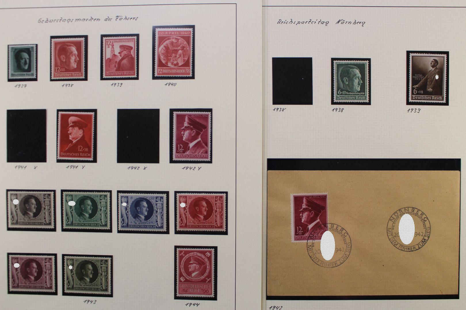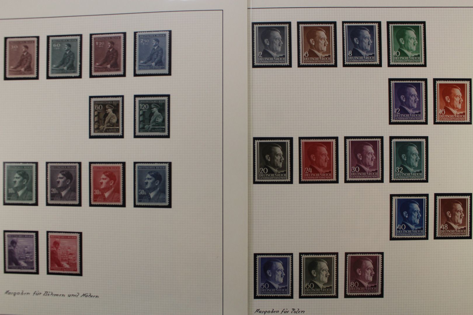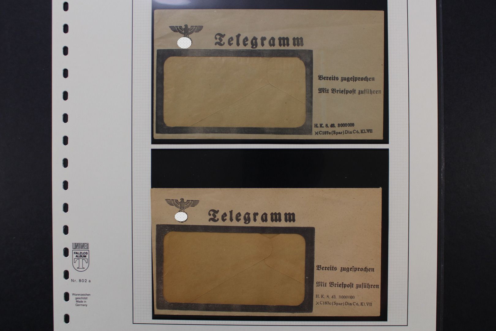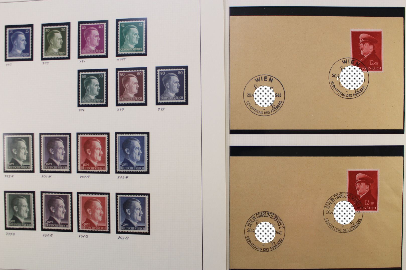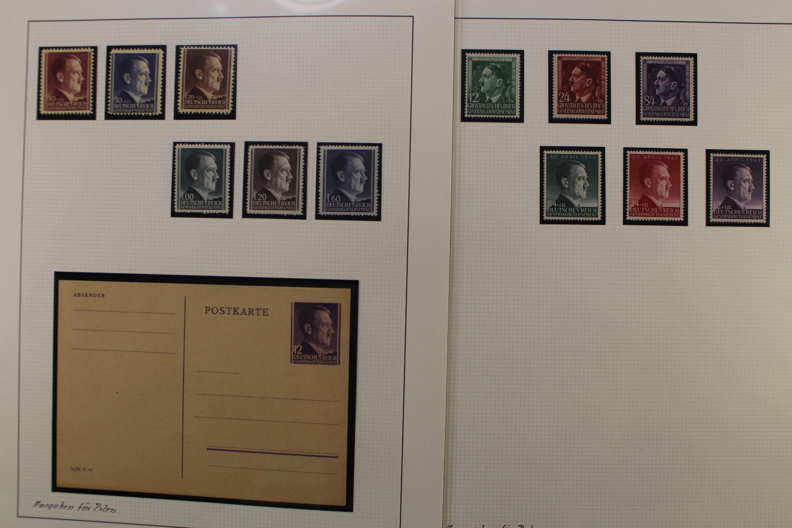Gesammelt wurden die Hitlermarken aus dem Deutschen Reich, Böhmen & Mähren und Generalgouvernement. Interessant sind einige Zusammendrucke, Heftchenblätter und ein Markenheftchen sowie 3 Telegrammumschläge. Überwiegend gute postfrische Erhaltung. Einige wenige Marken wohl etwas unterschiedlich. Untergebracht in einem Lindner-Kassettenbinder mit Kunststoffhüllen und selbstgestalteten Blankoblättern.