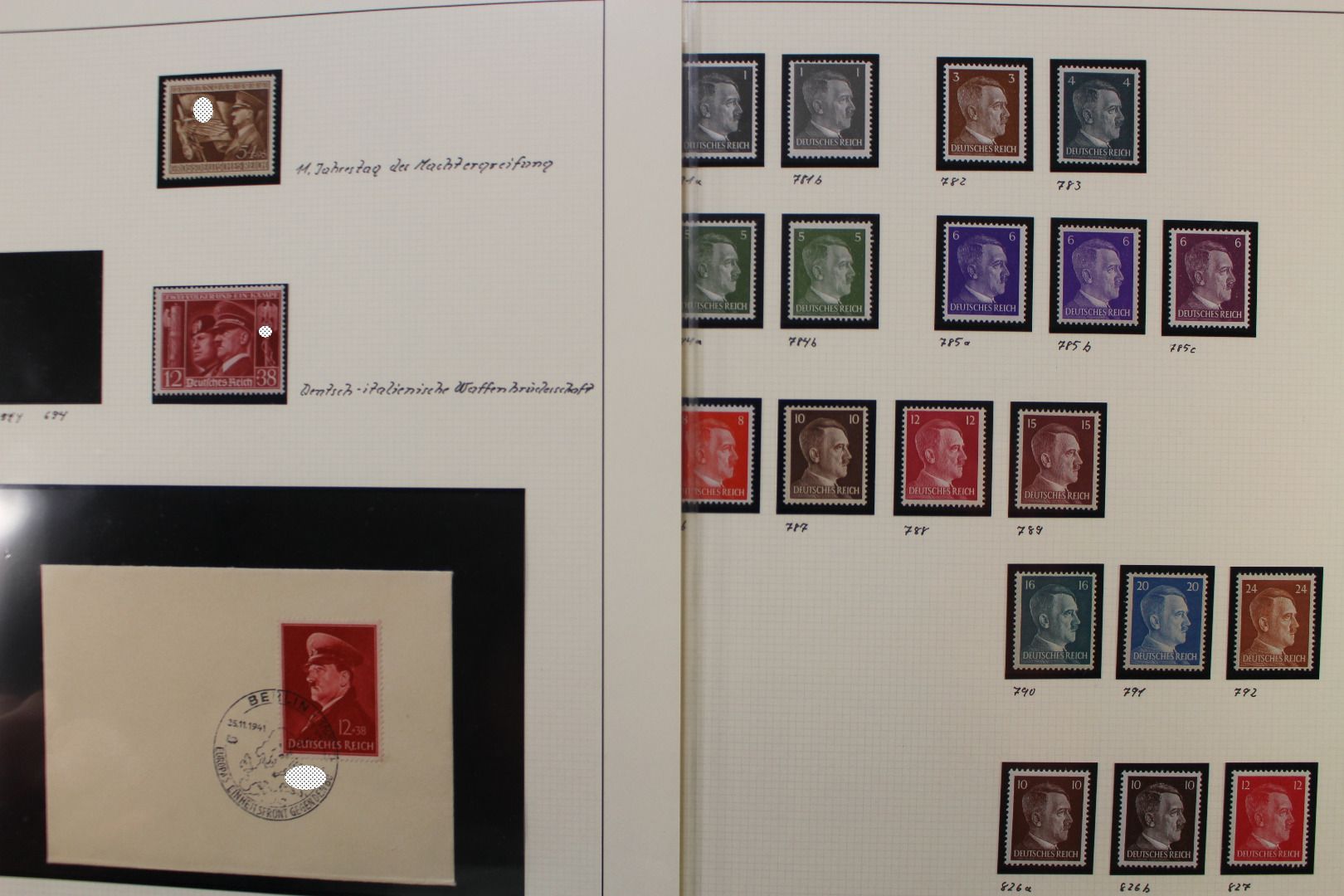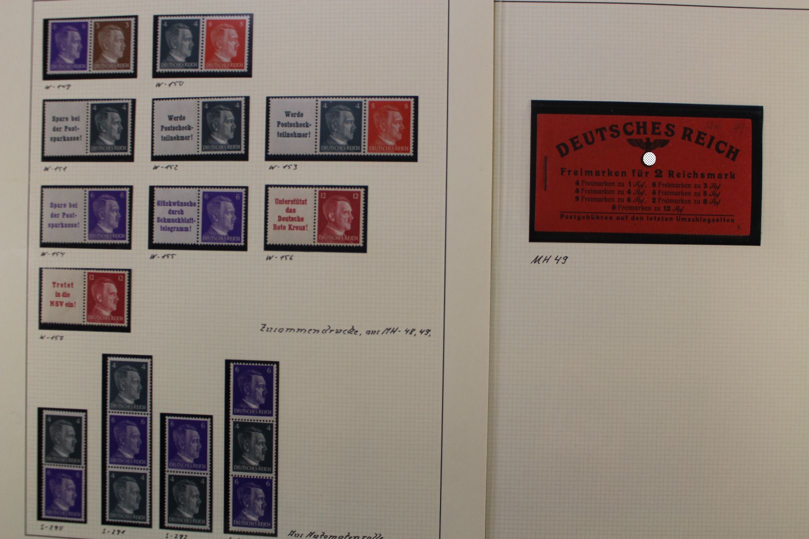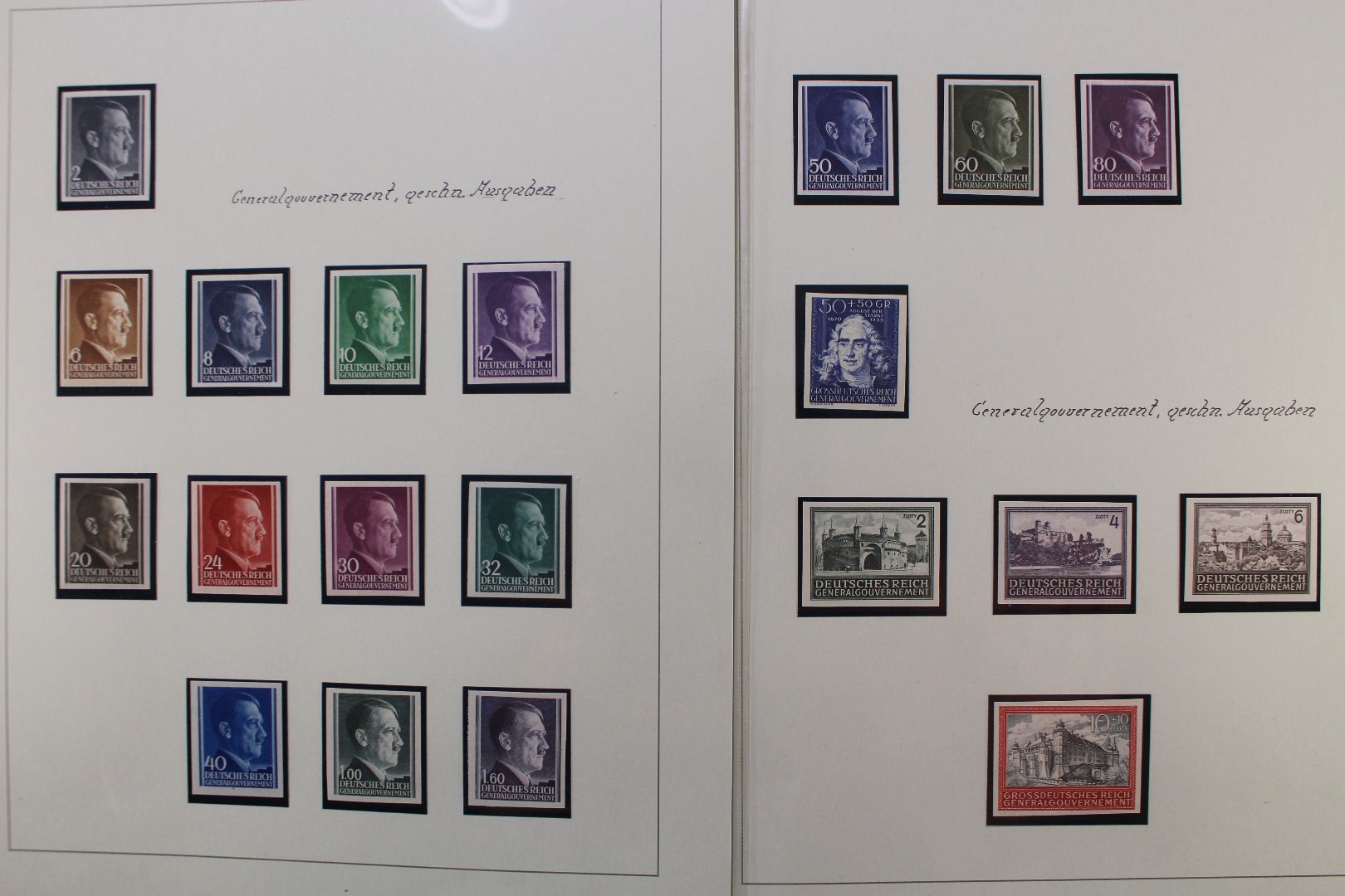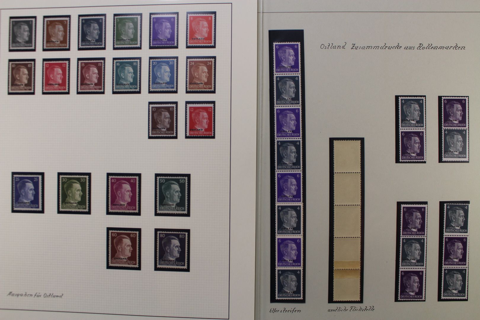 Gesammelt wurden die Hitlermarken aus dem Deutschen Reich, Böhmen & Mähren und Generalgouvernement. Interessant sind einige Zusammendrucke, Heftchenblätter und ein Markenheftchen sowie 3 Telegrammumschläge. Überwiegend gute postfrische Erhaltung. Einige wenige Marken wohl etwas unterschiedlich. Untergebracht in einem Lindner-Kassettenbinder mit Kunststoffhüllen und selbstgestalteten Blankoblättern.