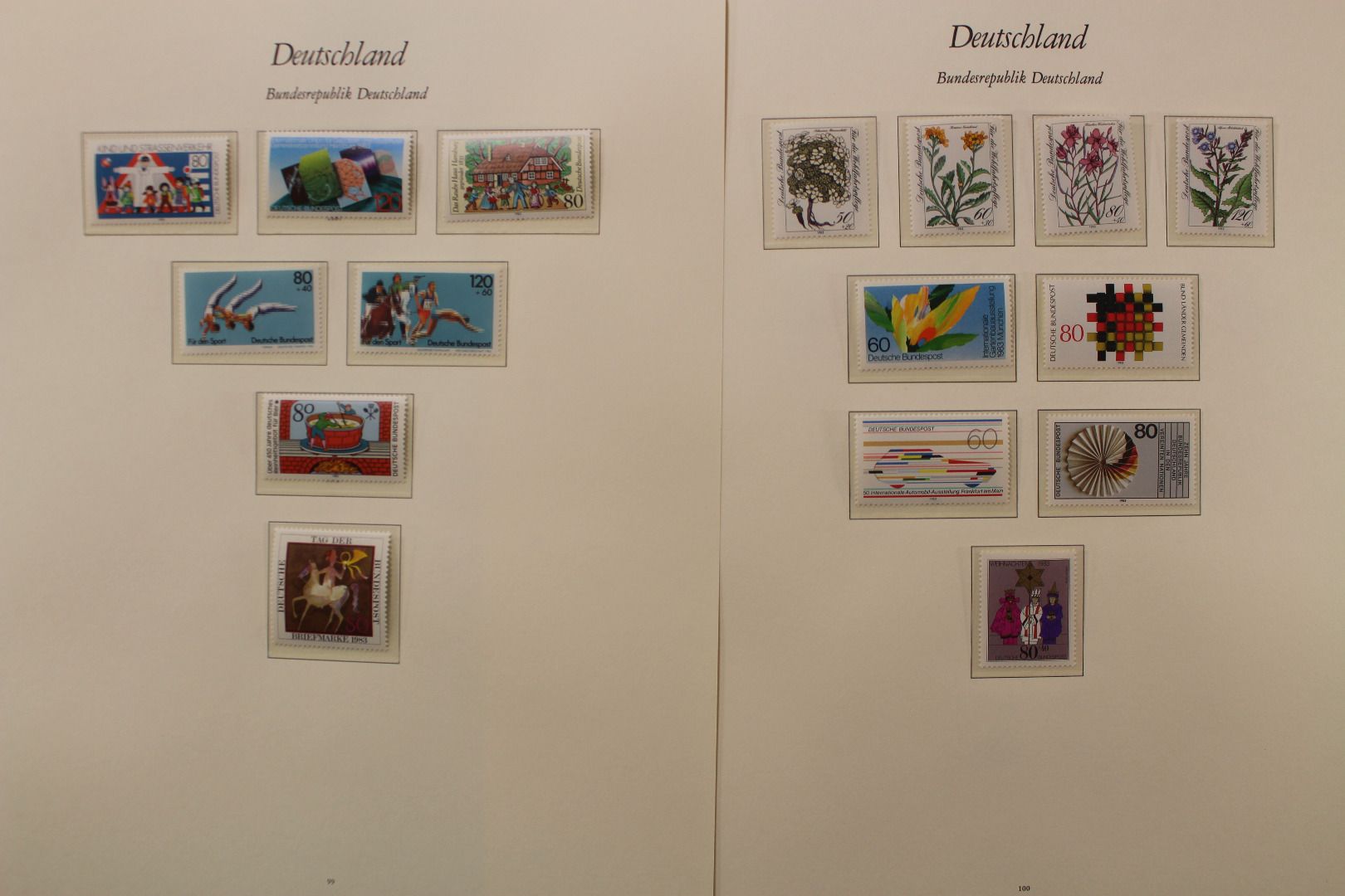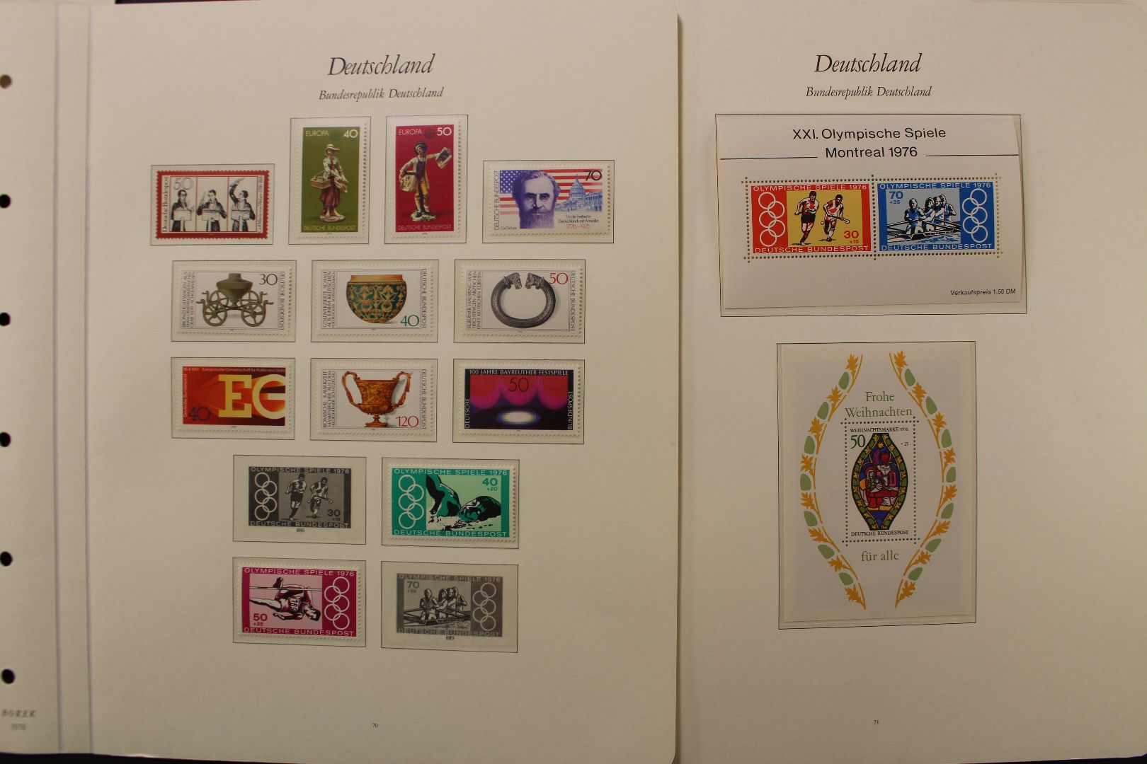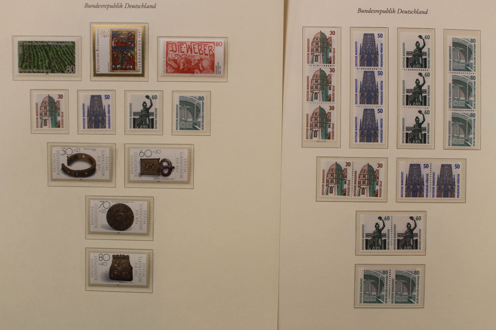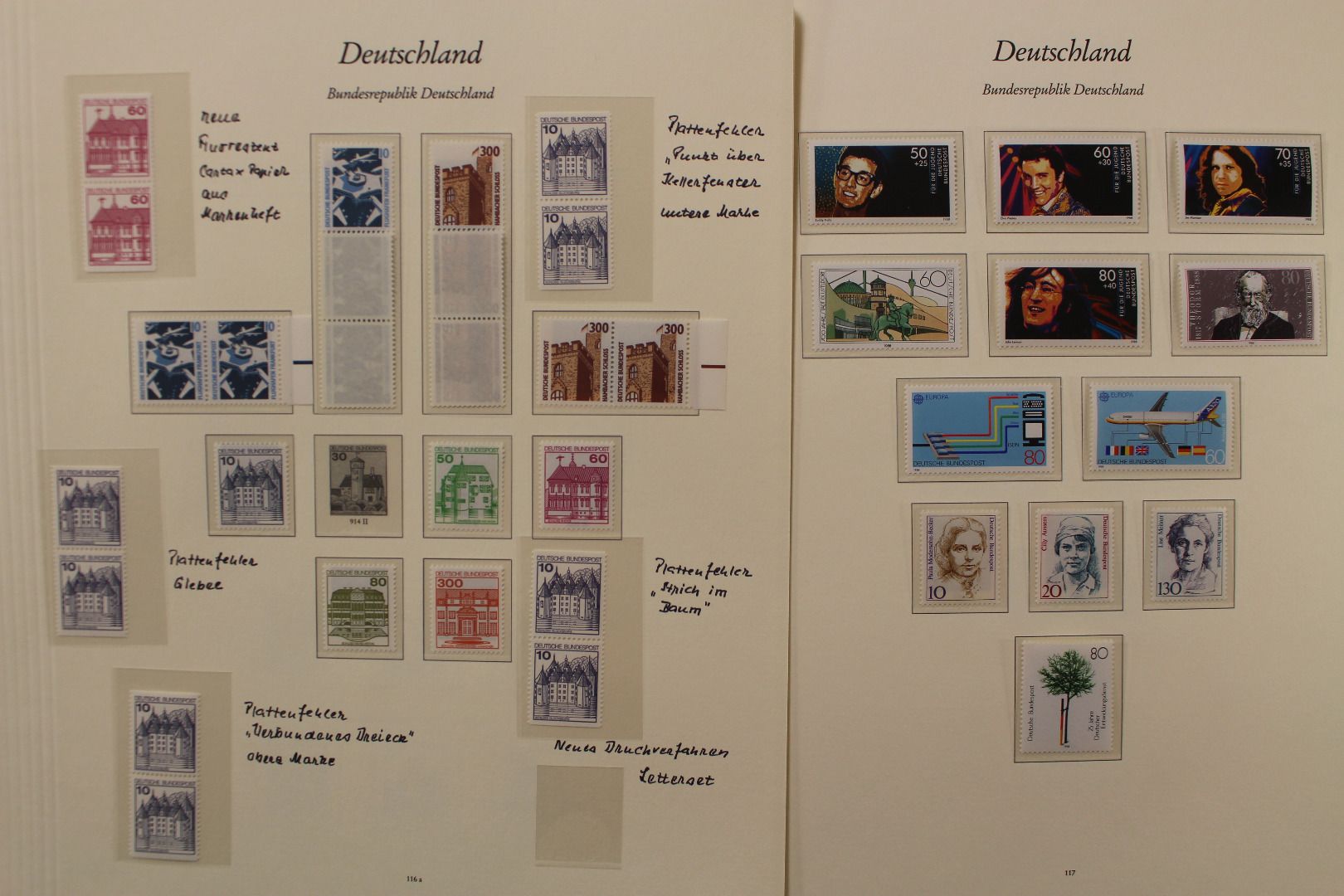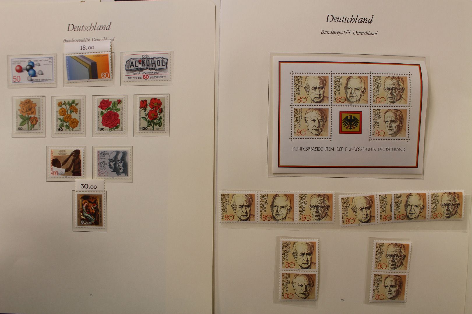 In den Hauptnummern ohne Posthorn und Heuss komplett. Bis 1955 unterschiedliche Qualität in ungebraucht bzw. postfrisch. Es sind auch einige nachgummierte bzw. entfalzte Marken enthalten, viel aber postfrisch. Nach 1960 wohl meist postfrische Sammlung mit etlichen Besonderheiten wie z.B. viele Blockeinzelmarken, C/D Werte aus Heftchen, Zusammendrucke ab 1977, Gummierungsbesonderheiten bei den Dauerserien, 5er Streifen mit Zählnummern usw. Untergebracht in 2 alten Borek Vordruckalben.