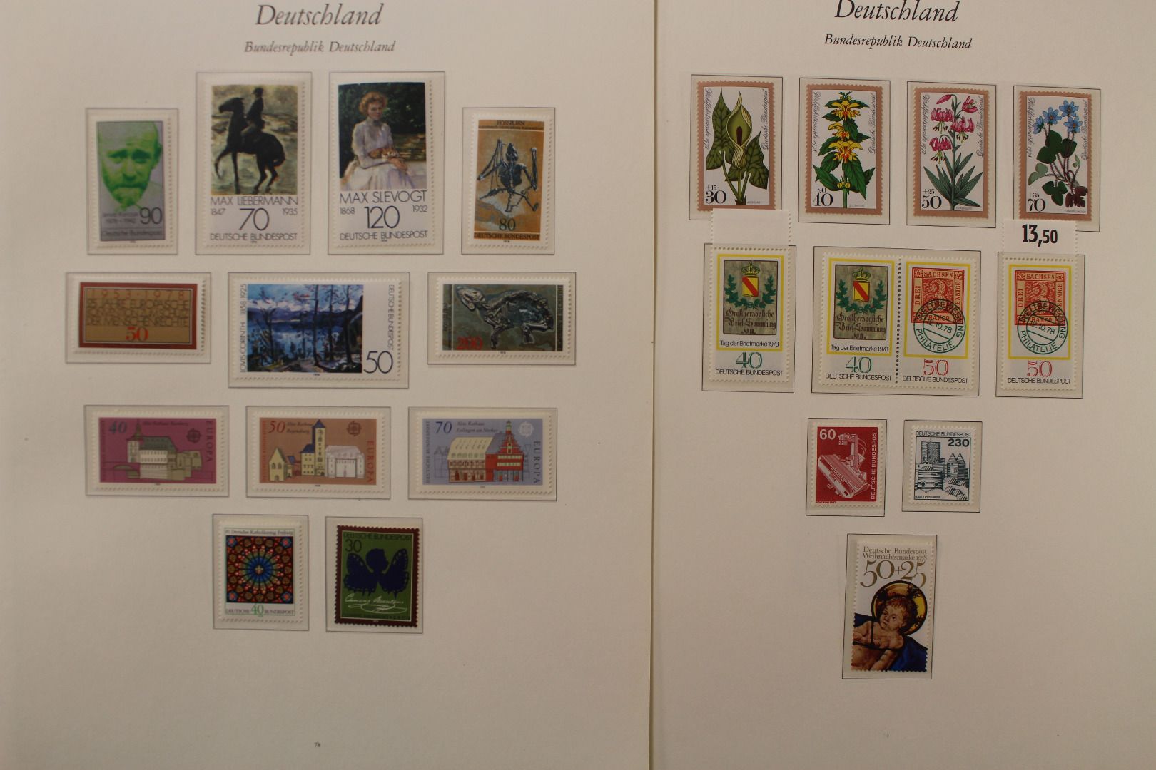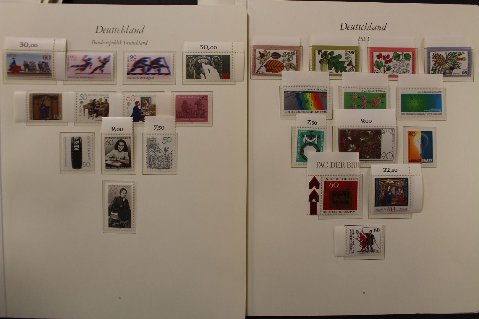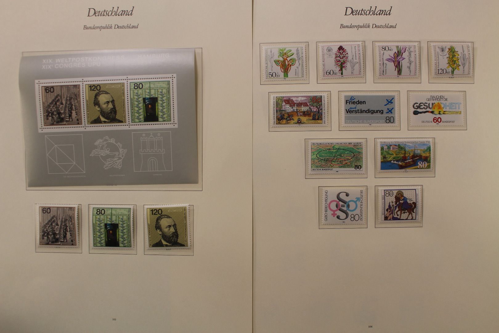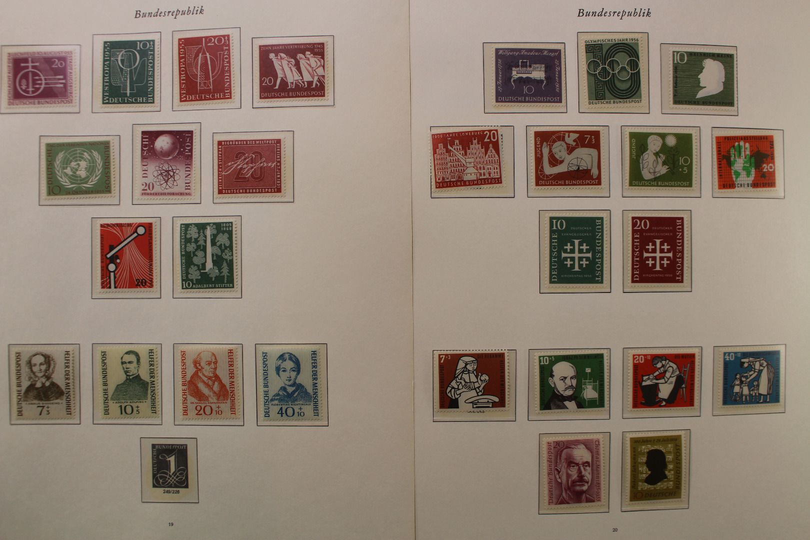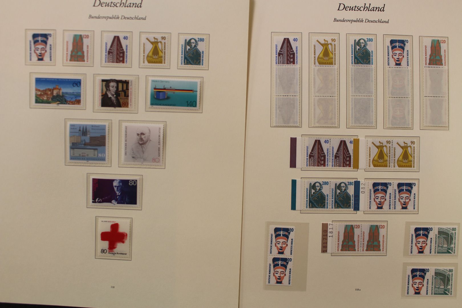 In den Hauptnummern ohne Posthorn und Heuss komplett. Bis 1955 unterschiedliche Qualität in ungebraucht bzw. postfrisch. Es sind auch einige nachgummierte bzw. entfalzte Marken enthalten, viel aber postfrisch. Nach 1960 wohl meist postfrische Sammlung mit etlichen Besonderheiten wie z.B. viele Blockeinzelmarken, C/D Werte aus Heftchen, Zusammendrucke ab 1977, Gummierungsbesonderheiten bei den Dauerserien, 5er Streifen mit Zählnummern usw. Untergebracht in 2 alten Borek Vordruckalben.