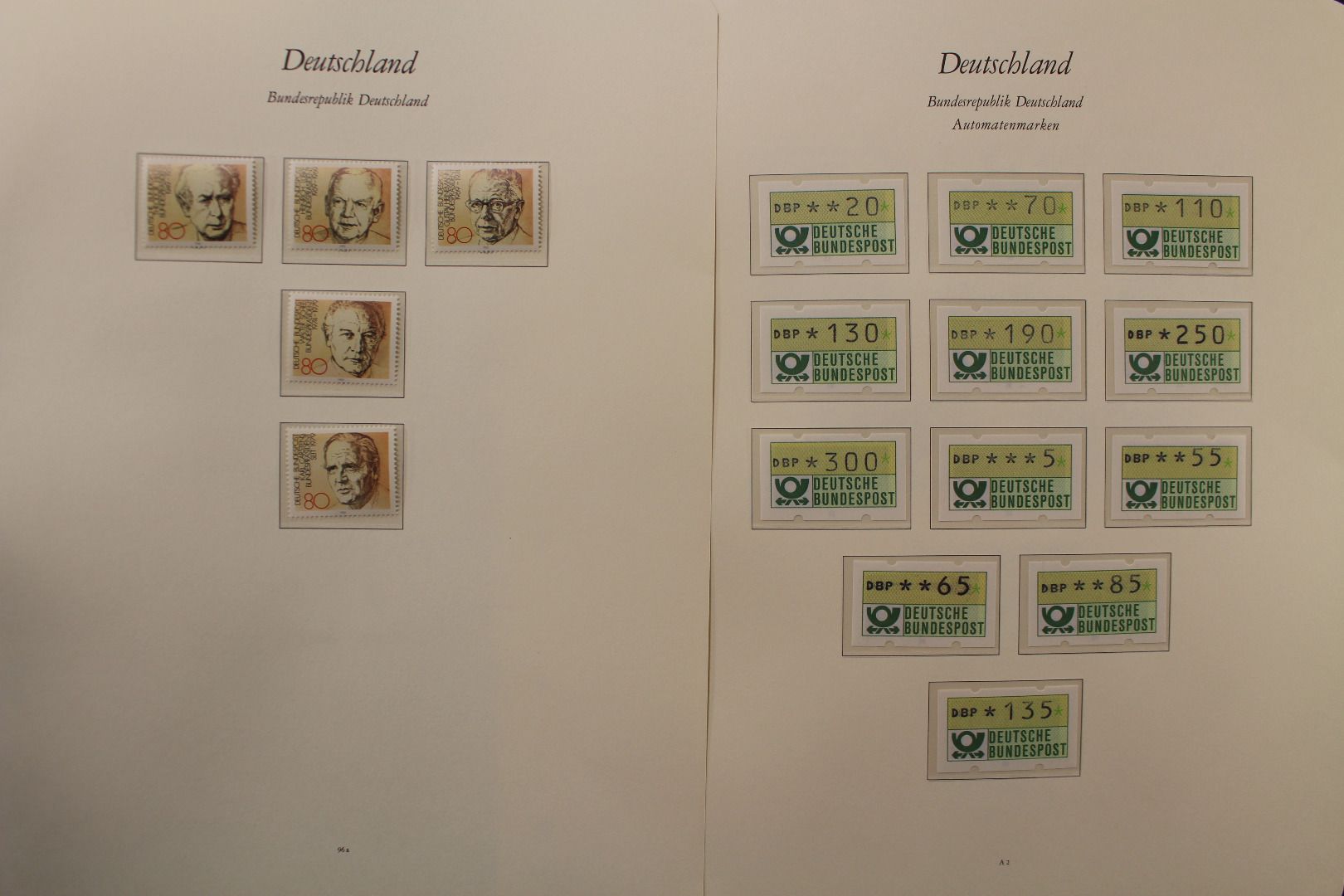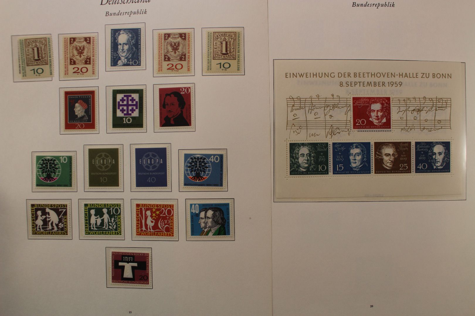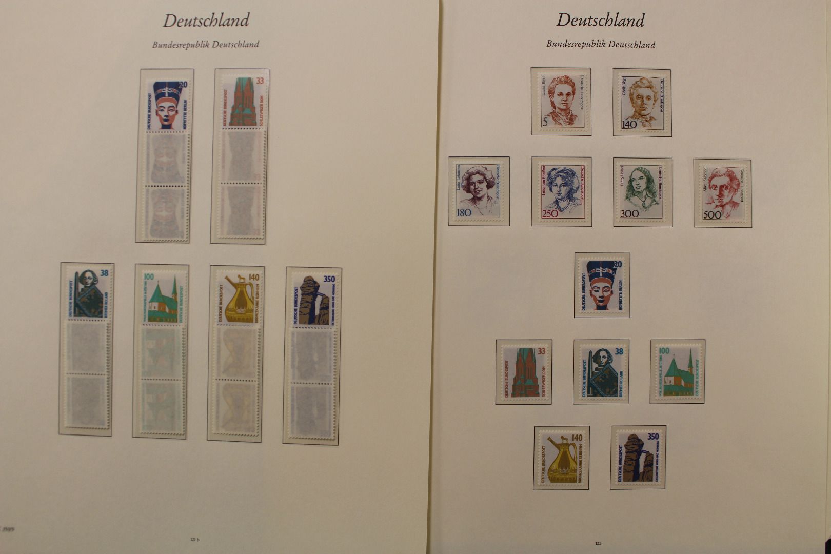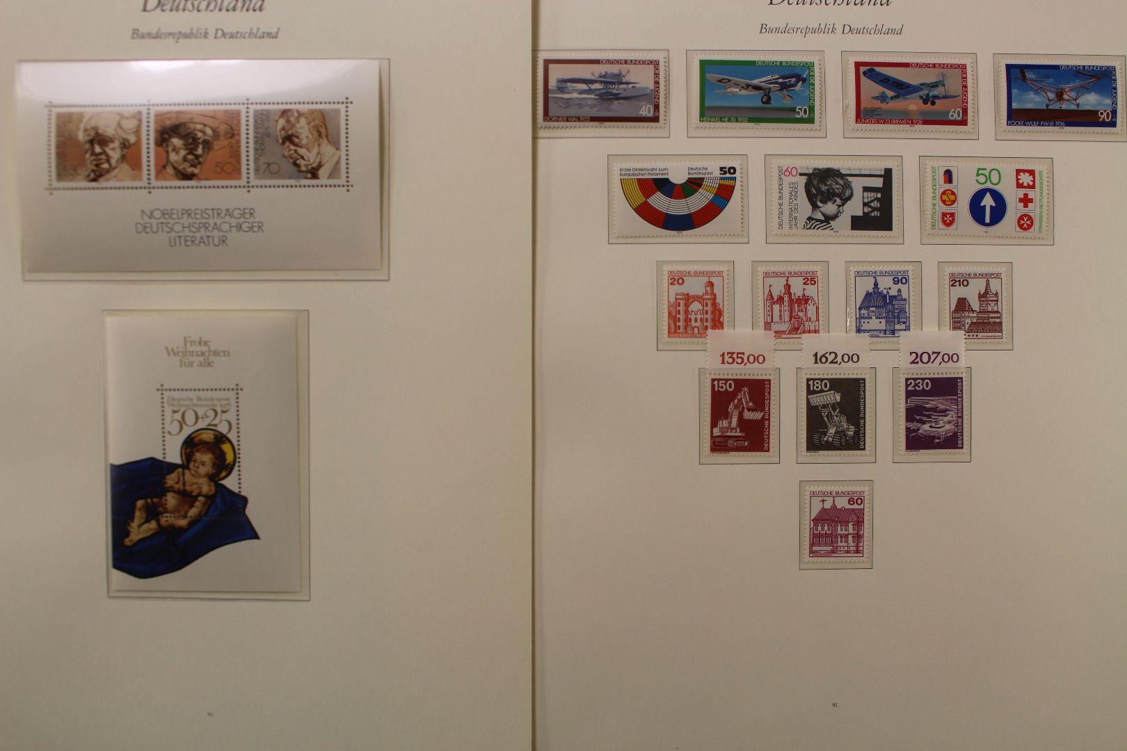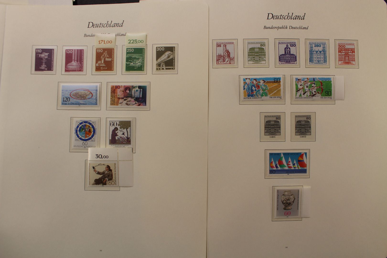 In den Hauptnummern ohne Posthorn und Heuss komplett. Bis 1955 unterschiedliche Qualität in ungebraucht bzw. postfrisch. Es sind auch einige nachgummierte bzw. entfalzte Marken enthalten, viel aber postfrisch. Nach 1960 wohl meist postfrische Sammlung mit etlichen Besonderheiten wie z.B. viele Blockeinzelmarken, C/D Werte aus Heftchen, Zusammendrucke ab 1977, Gummierungsbesonderheiten bei den Dauerserien, 5er Streifen mit Zählnummern usw. Untergebracht in 2 alten Borek Vordruckalben.