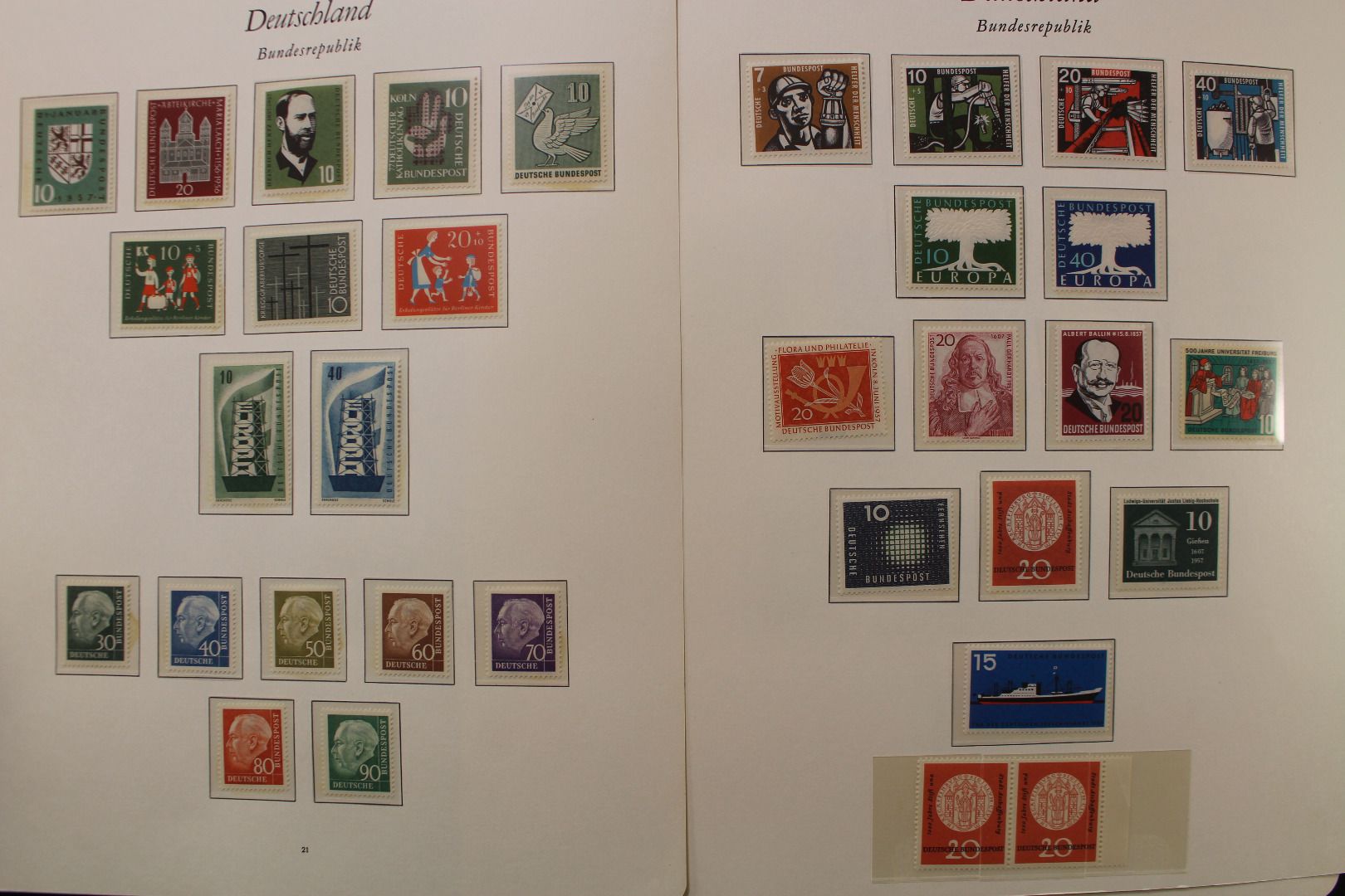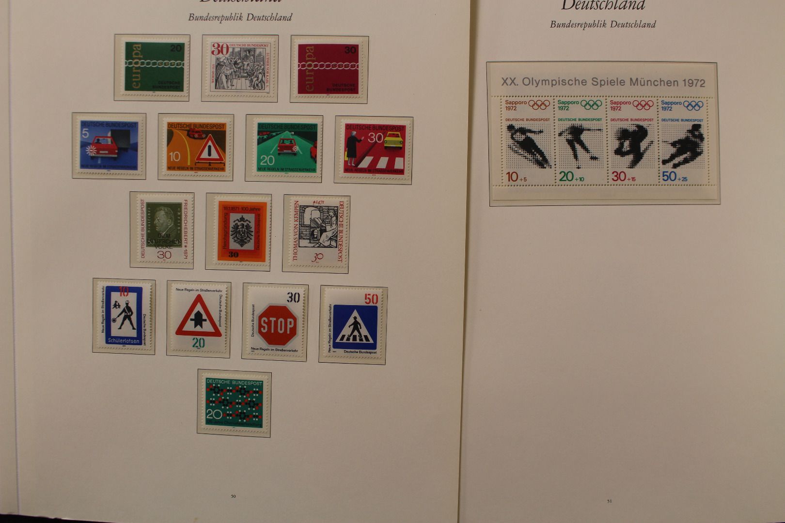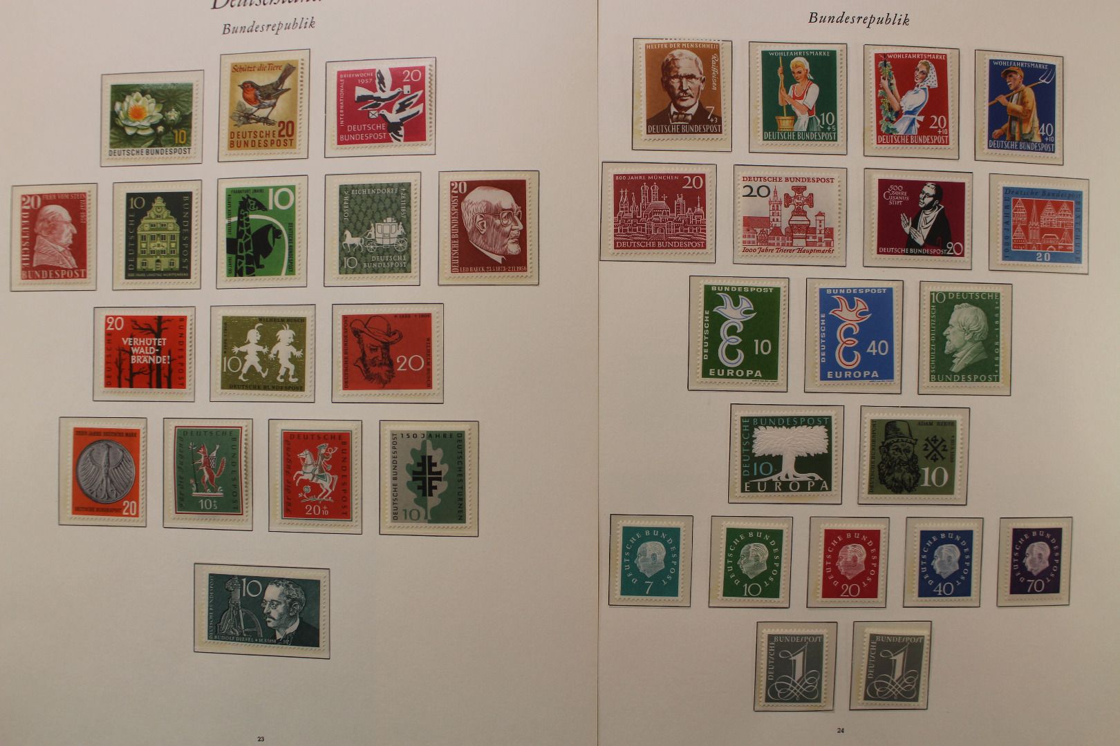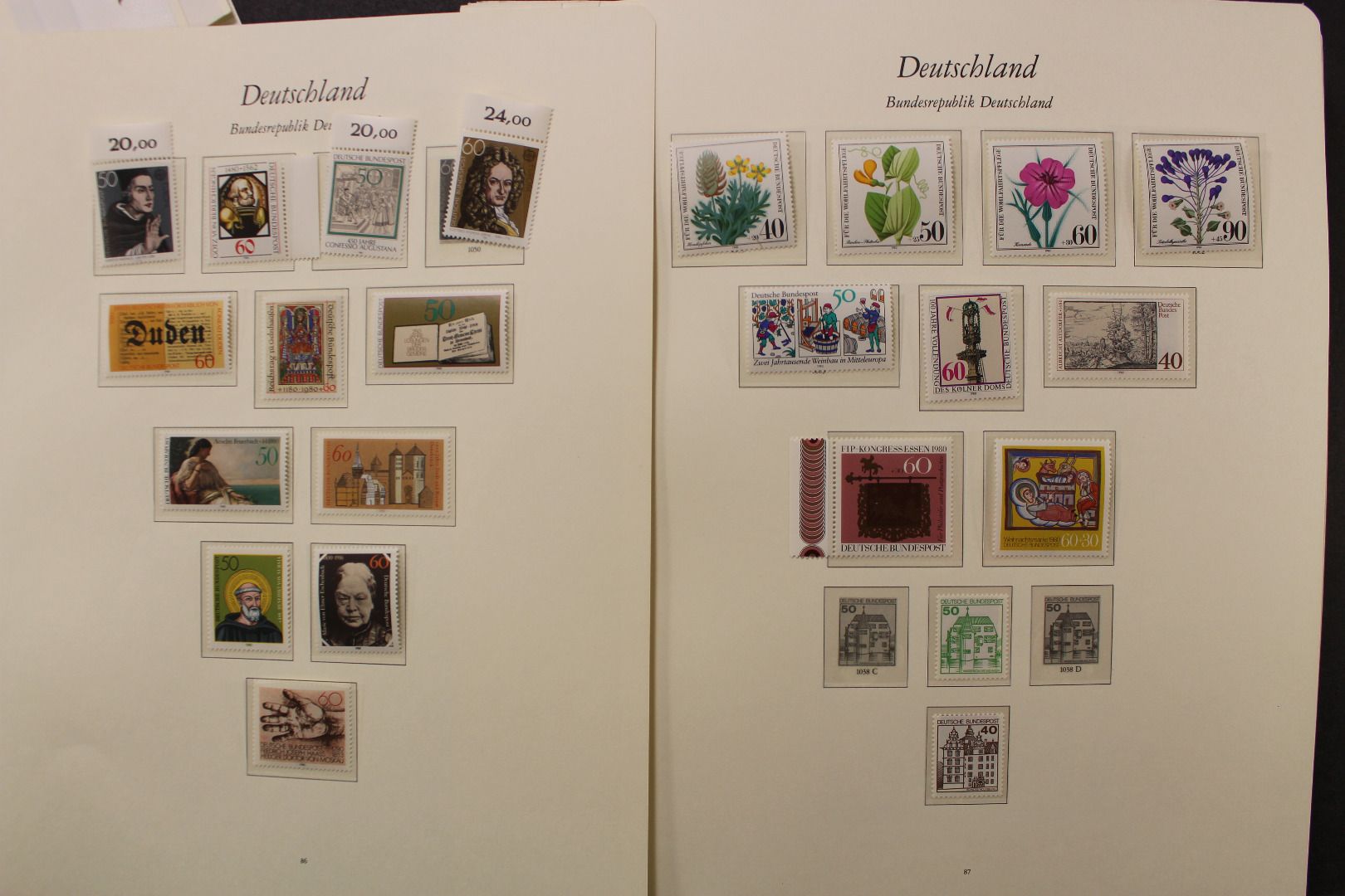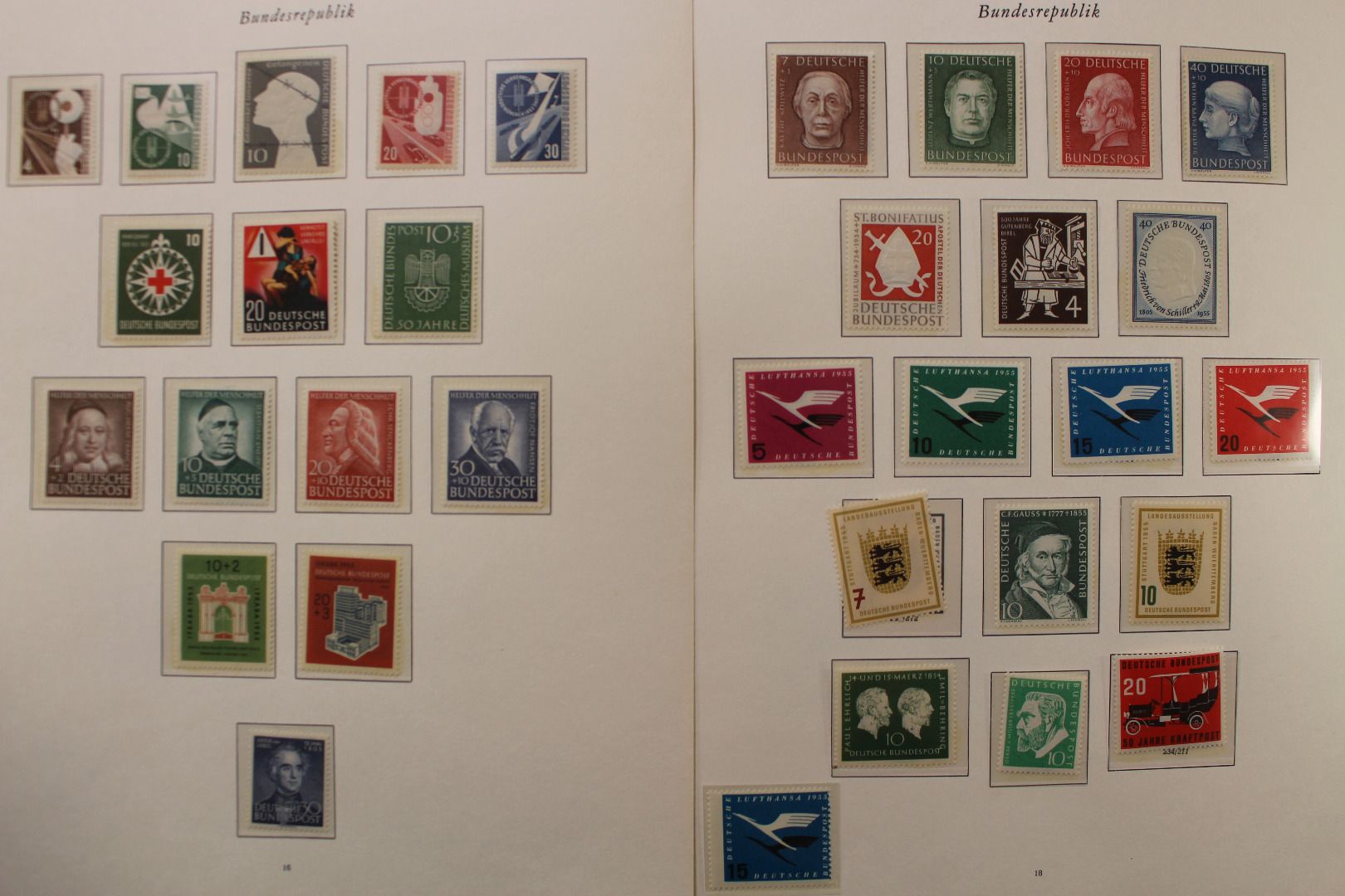 In den Hauptnummern ohne Posthorn und Heuss komplett. Bis 1955 unterschiedliche Qualität in ungebraucht bzw. postfrisch. Es sind auch einige nachgummierte bzw. entfalzte Marken enthalten, viel aber postfrisch. Nach 1960 wohl meist postfrische Sammlung mit etlichen Besonderheiten wie z.B. viele Blockeinzelmarken, C/D Werte aus Heftchen, Zusammendrucke ab 1977, Gummierungsbesonderheiten bei den Dauerserien, 5er Streifen mit Zählnummern usw. Untergebracht in 2 alten Borek Vordruckalben.