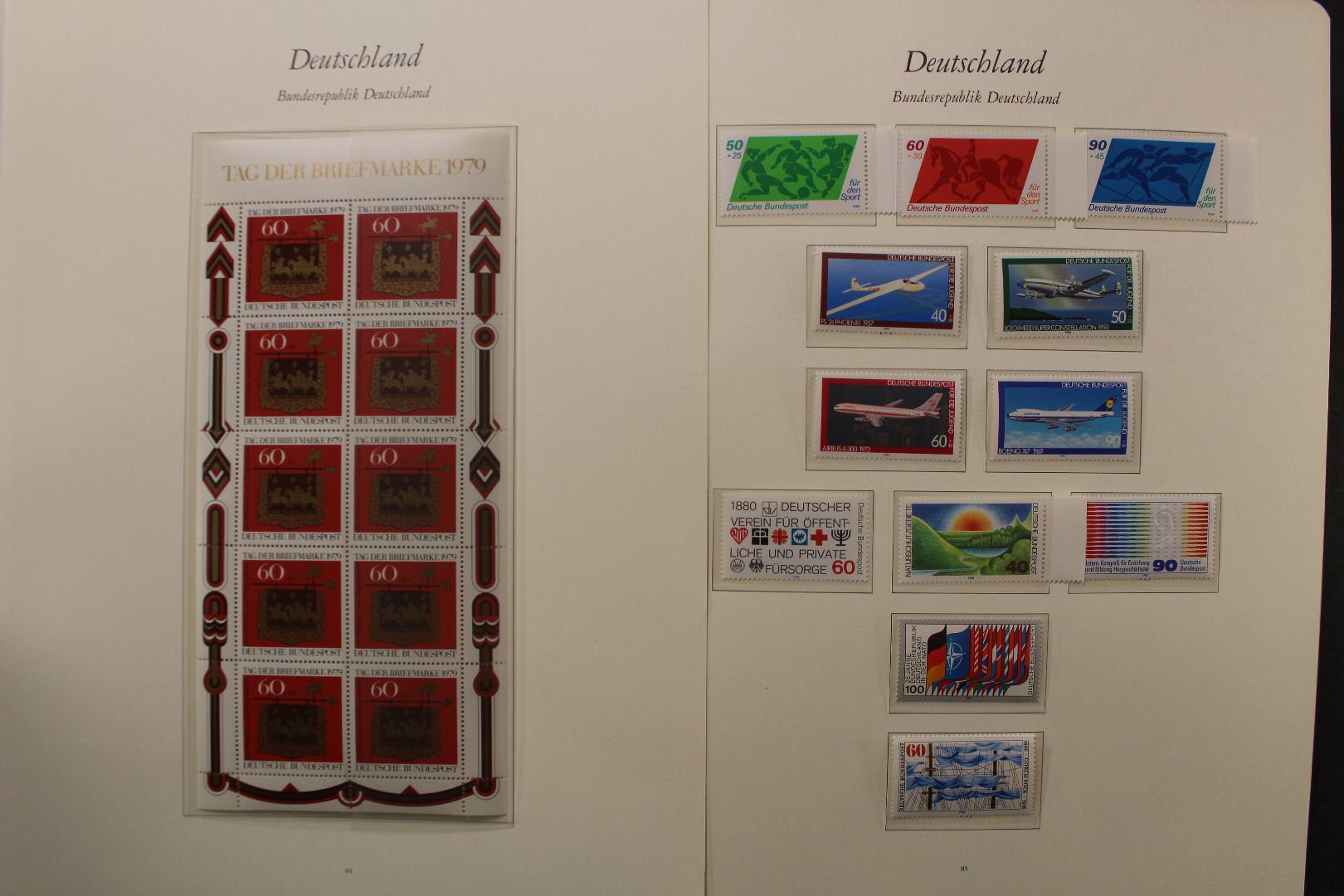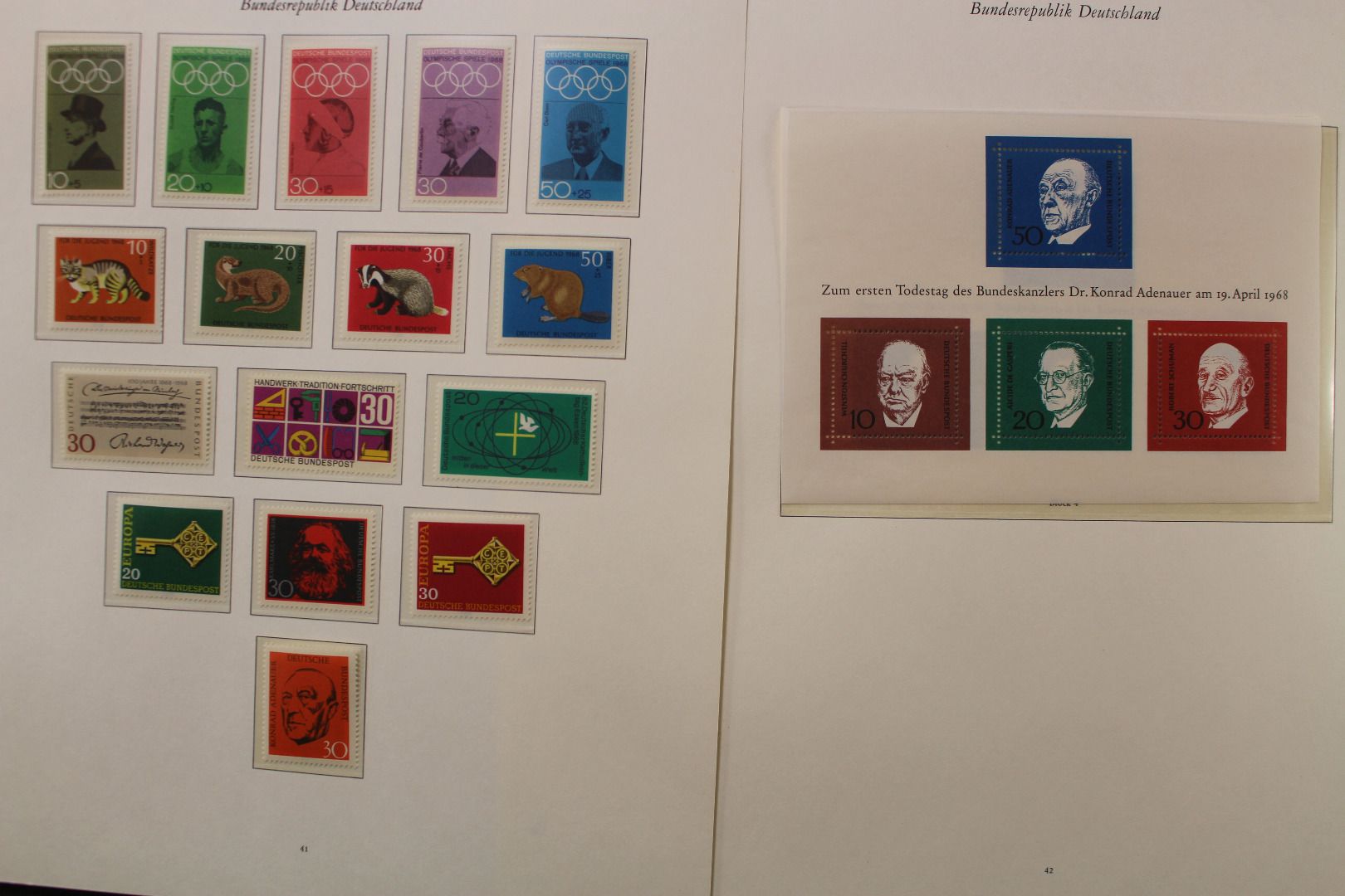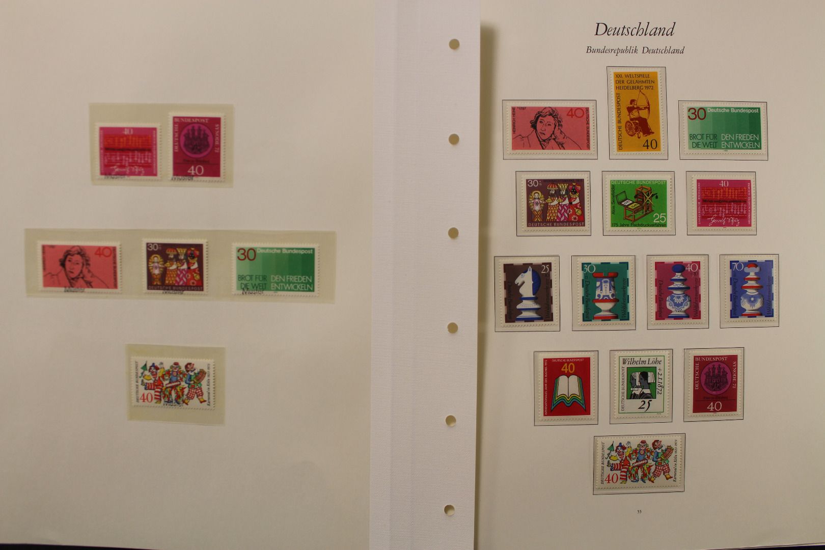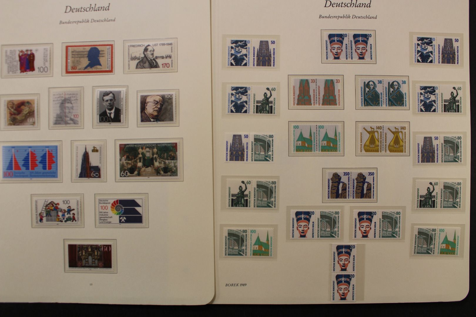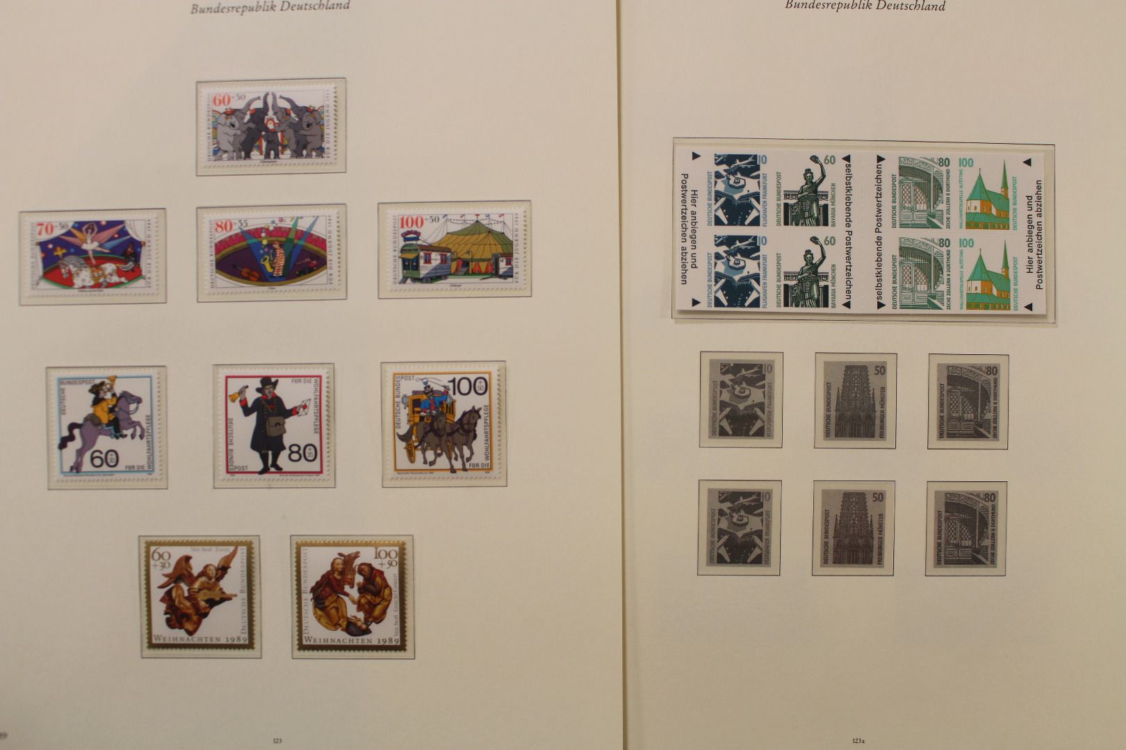 In den Hauptnummern ohne Posthorn und Heuss komplett. Bis 1955 unterschiedliche Qualität in ungebraucht bzw. postfrisch. Es sind auch einige nachgummierte bzw. entfalzte Marken enthalten, viel aber postfrisch. Nach 1960 wohl meist postfrische Sammlung mit etlichen Besonderheiten wie z.B. viele Blockeinzelmarken, C/D Werte aus Heftchen, Zusammendrucke ab 1977, Gummierungsbesonderheiten bei den Dauerserien, 5er Streifen mit Zählnummern usw. Untergebracht in 2 alten Borek Vordruckalben.