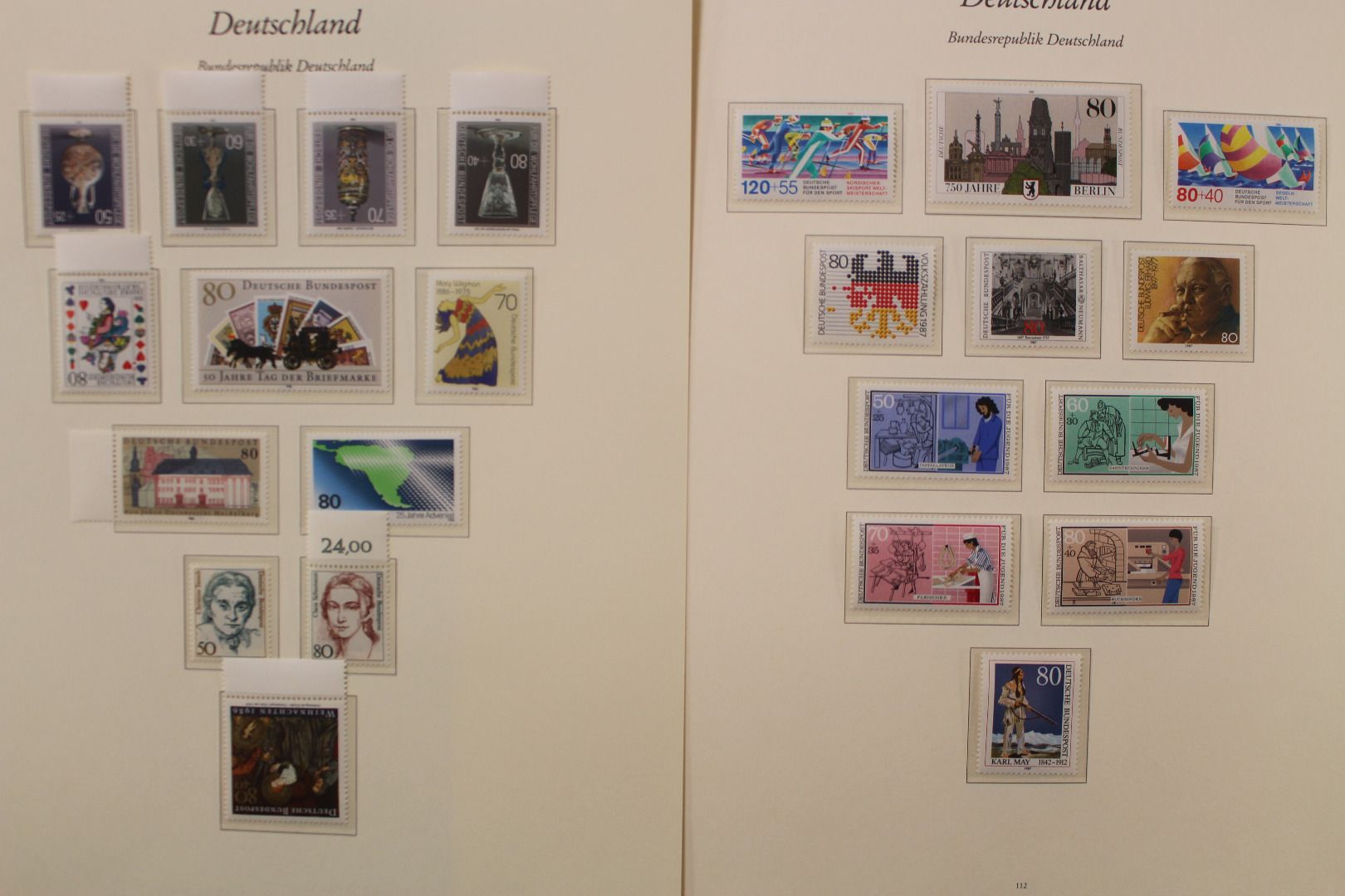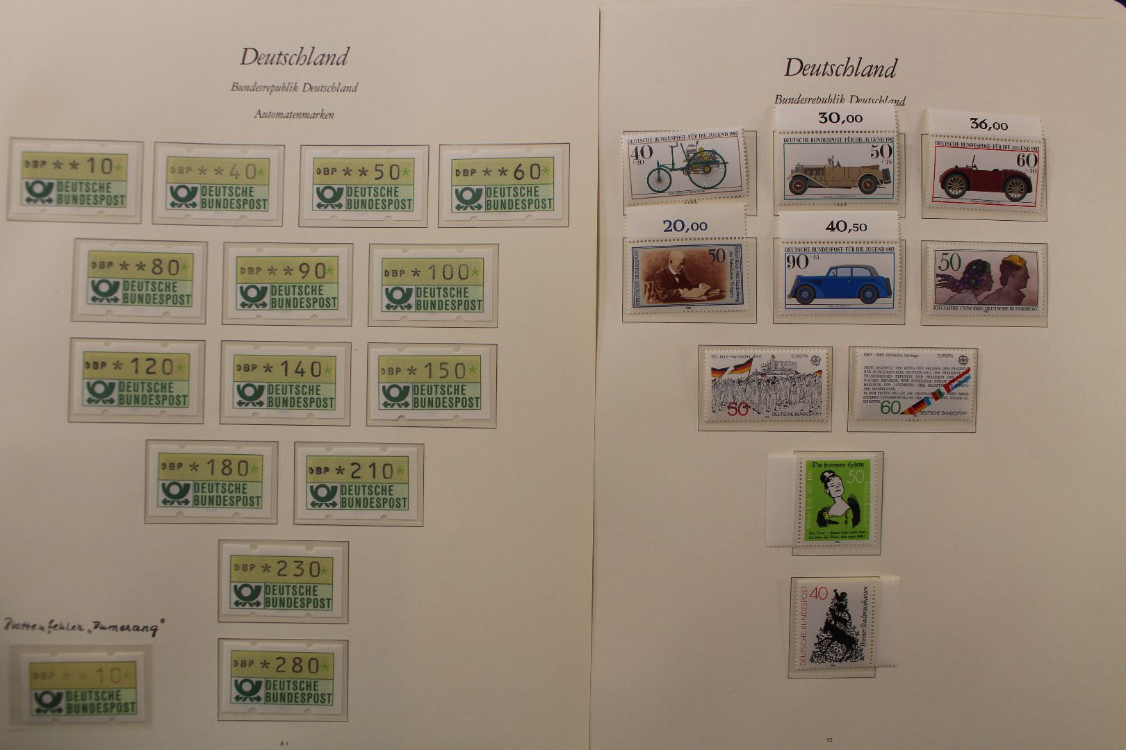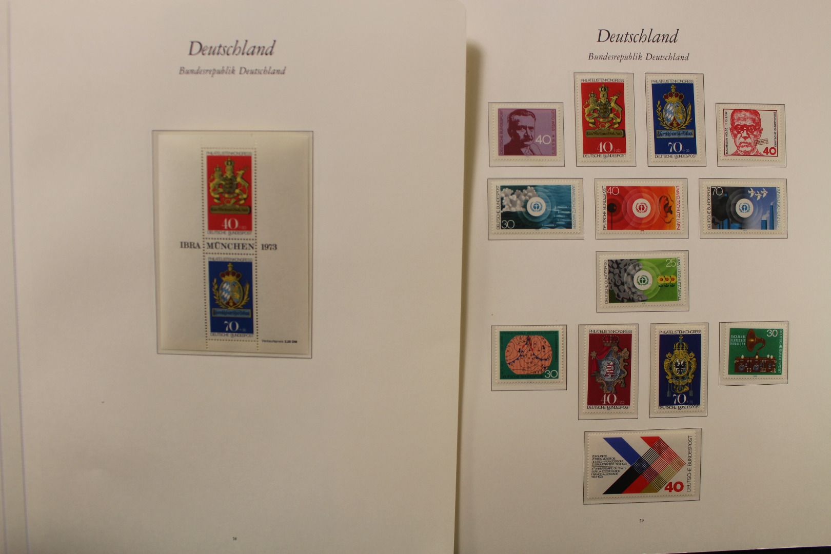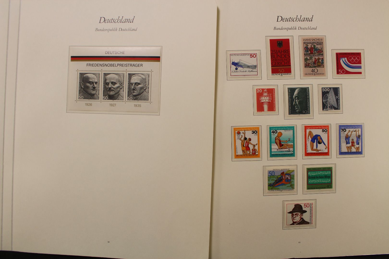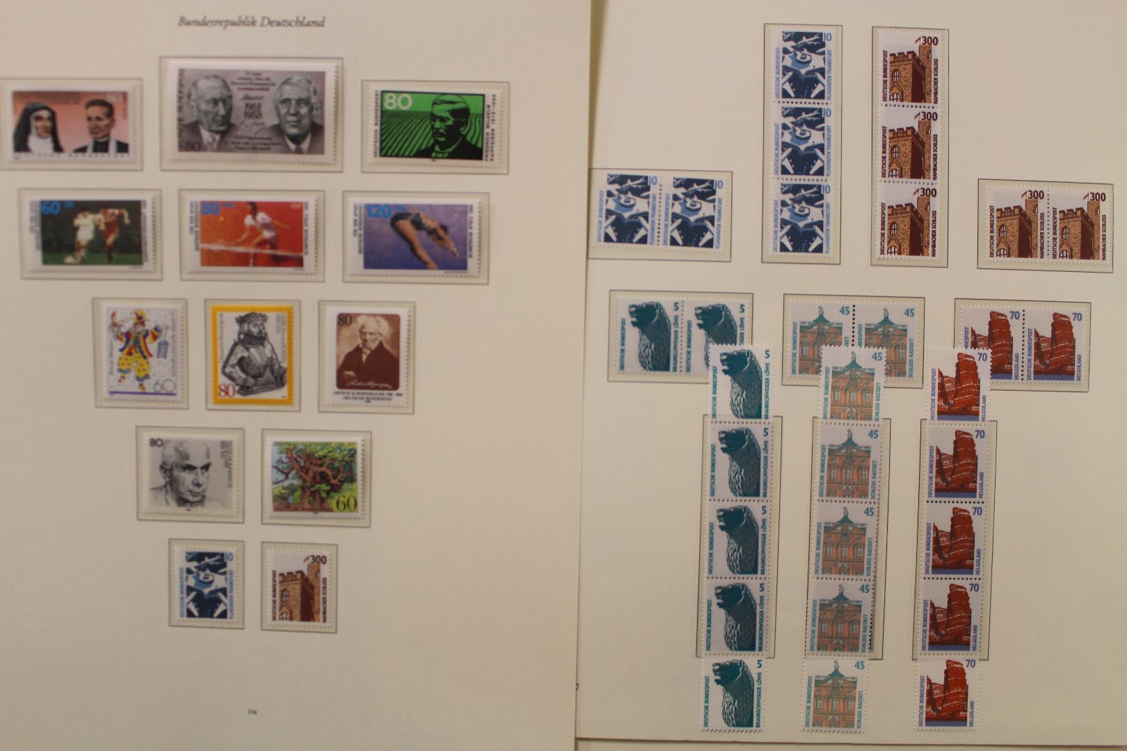 In den Hauptnummern ohne Posthorn und Heuss komplett. Bis 1955 unterschiedliche Qualität in ungebraucht bzw. postfrisch. Es sind auch einige nachgummierte bzw. entfalzte Marken enthalten, viel aber postfrisch. Nach 1960 wohl meist postfrische Sammlung mit etlichen Besonderheiten wie z.B. viele Blockeinzelmarken, C/D Werte aus Heftchen, Zusammendrucke ab 1977, Gummierungsbesonderheiten bei den Dauerserien, 5er Streifen mit Zählnummern usw. Untergebracht in 2 alten Borek Vordruckalben.