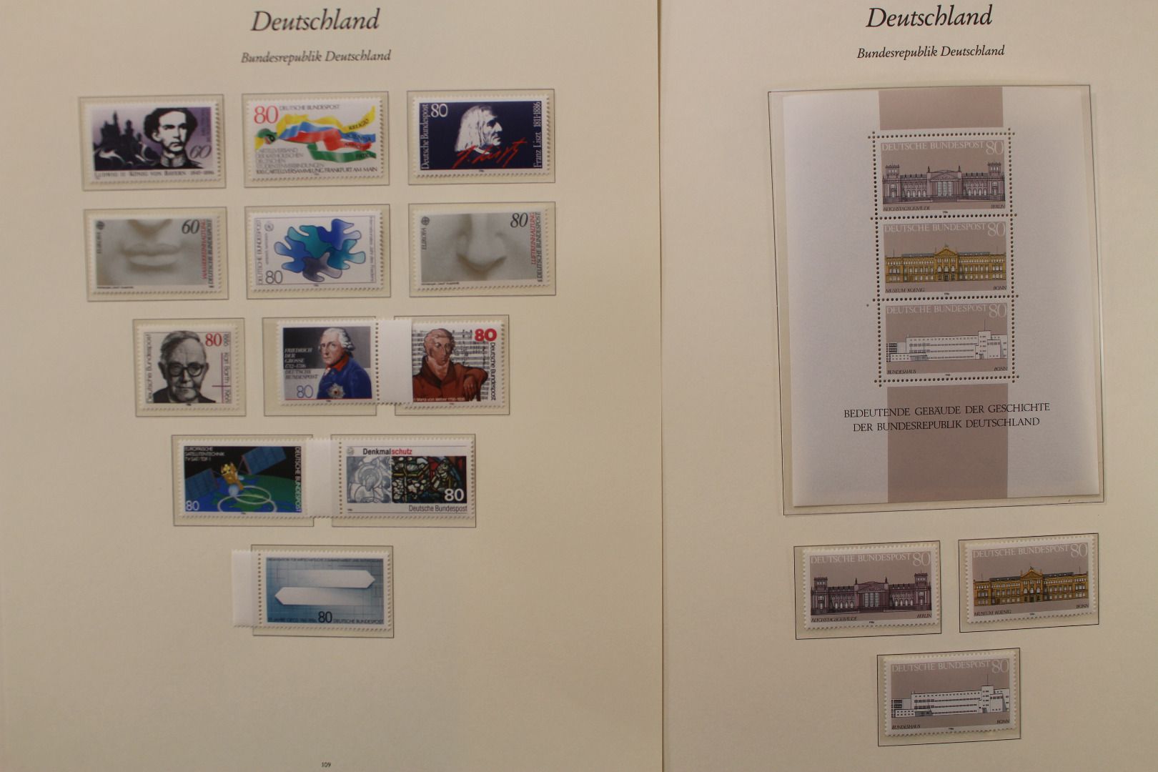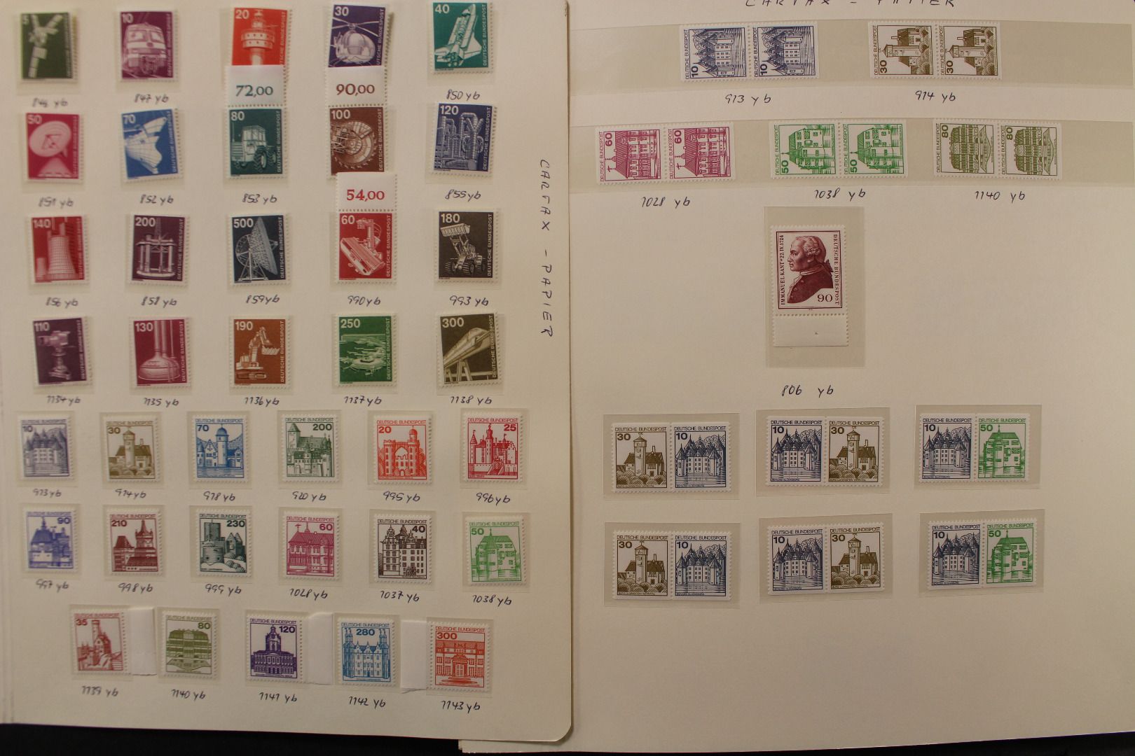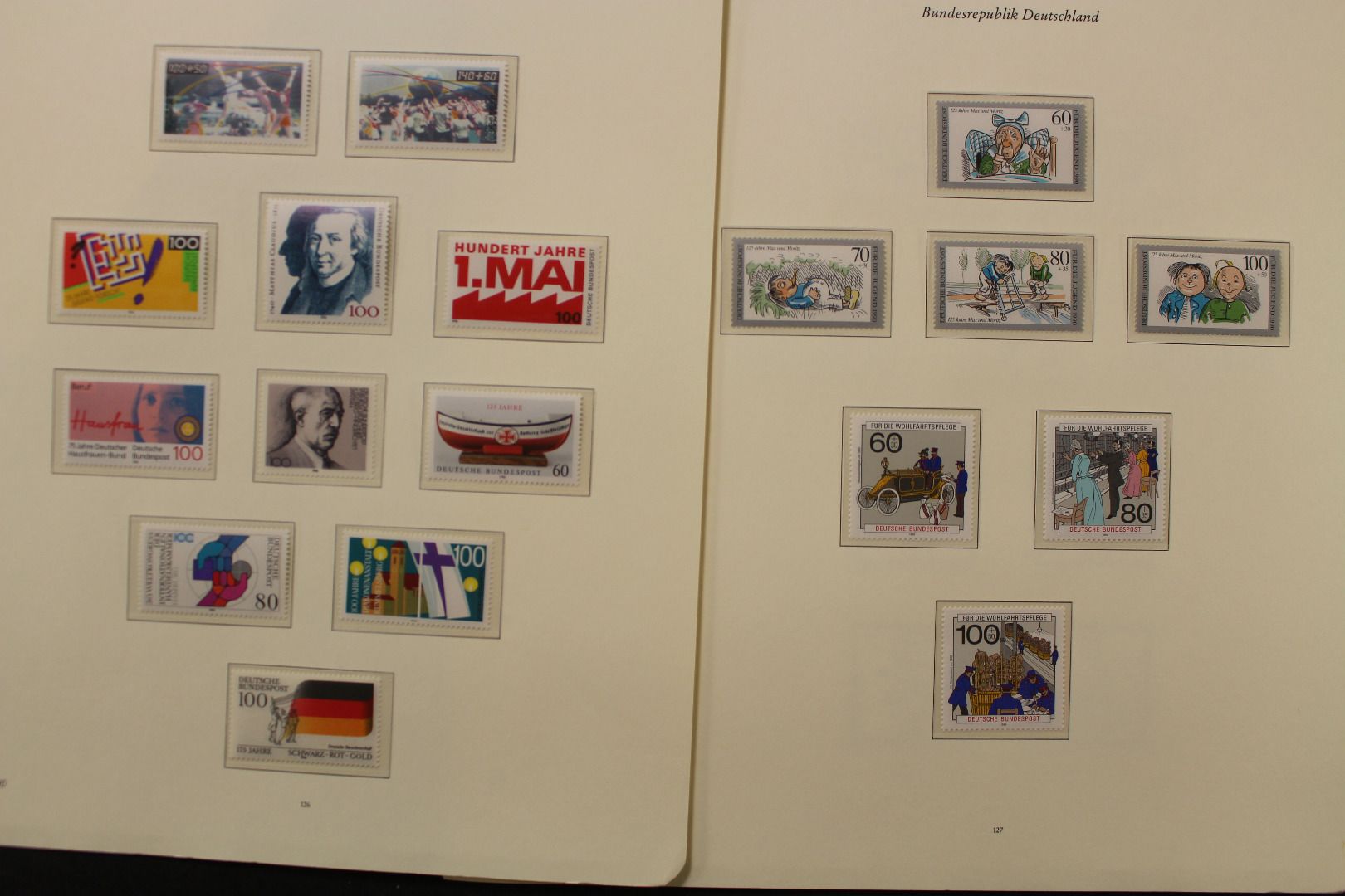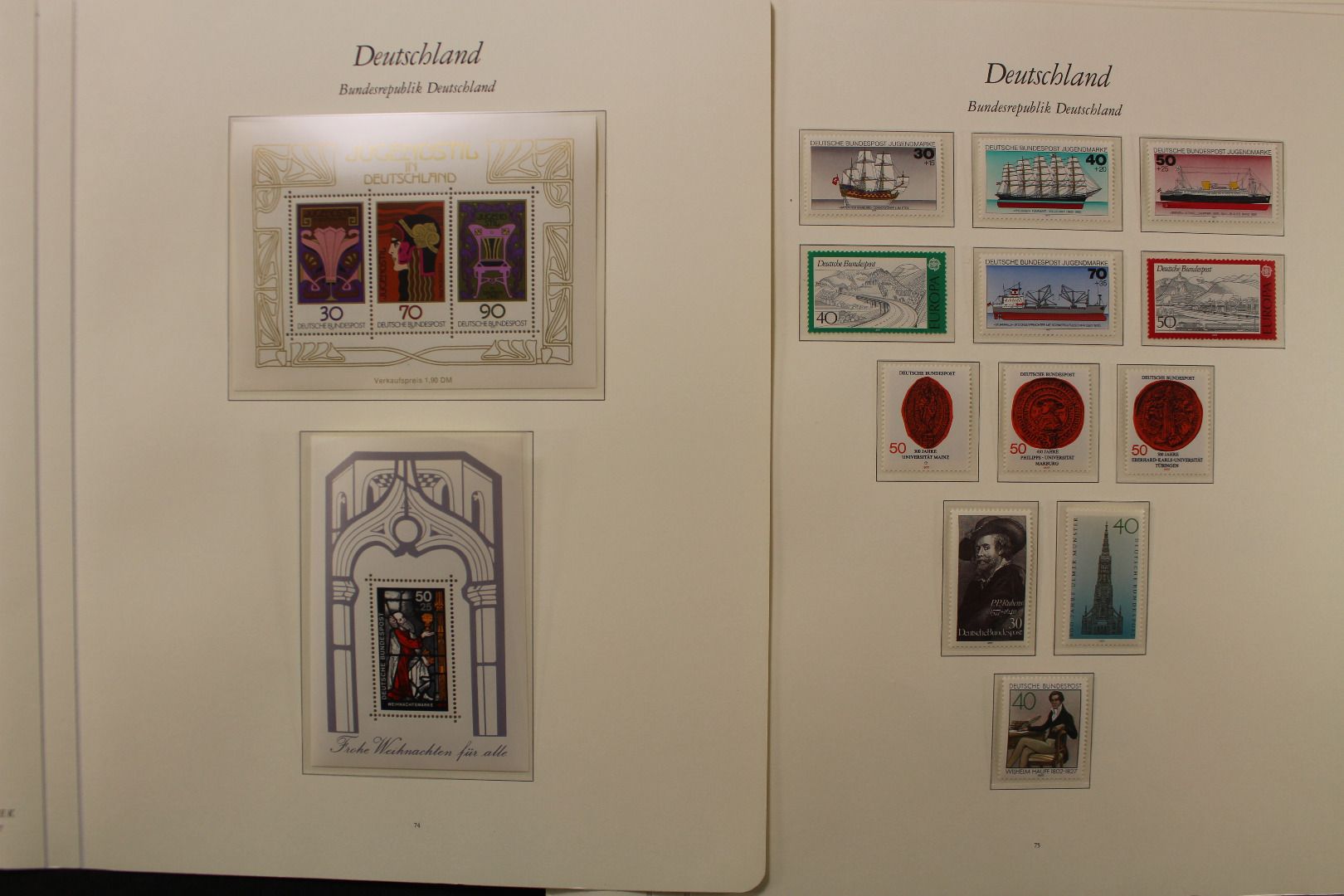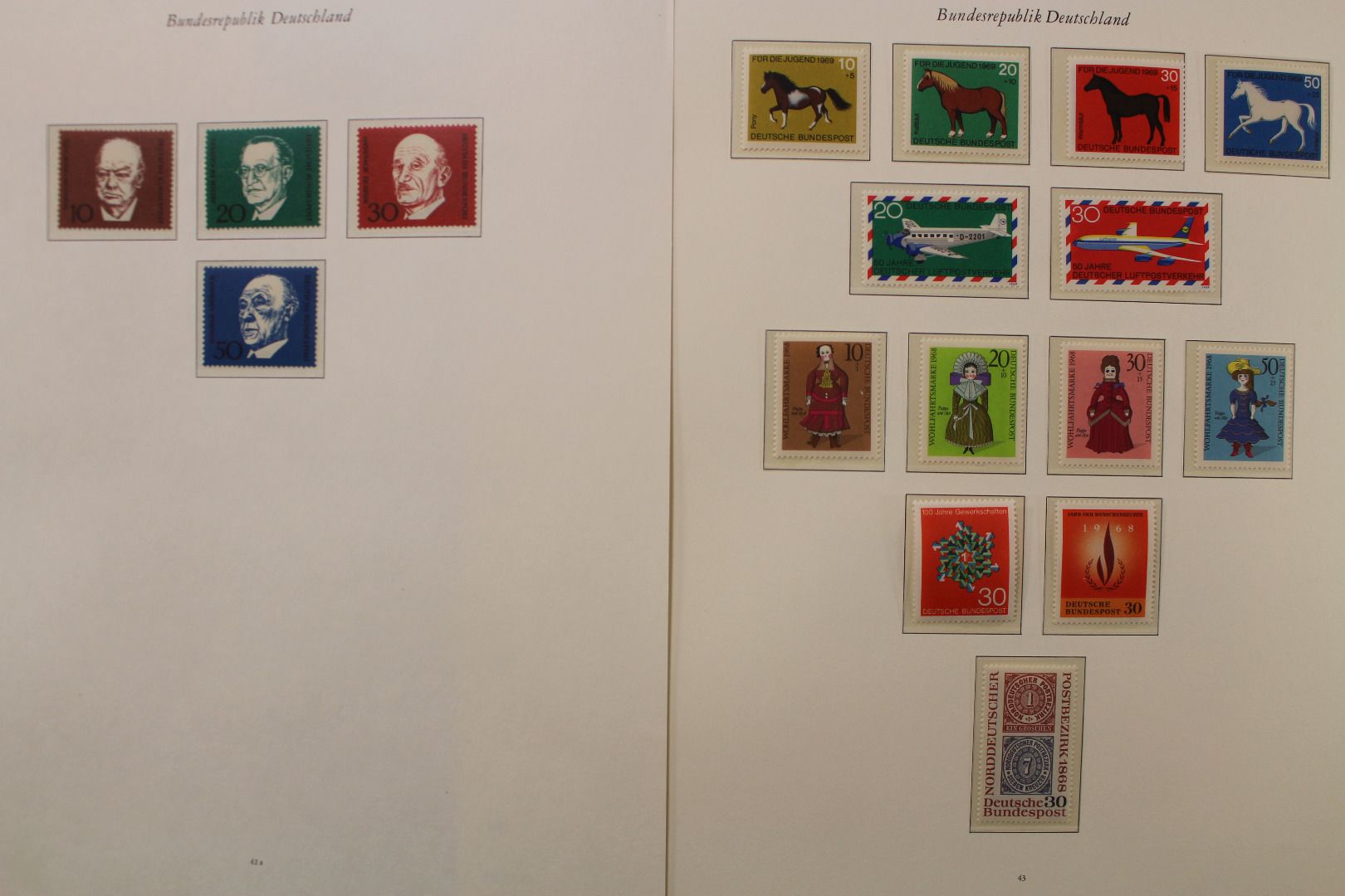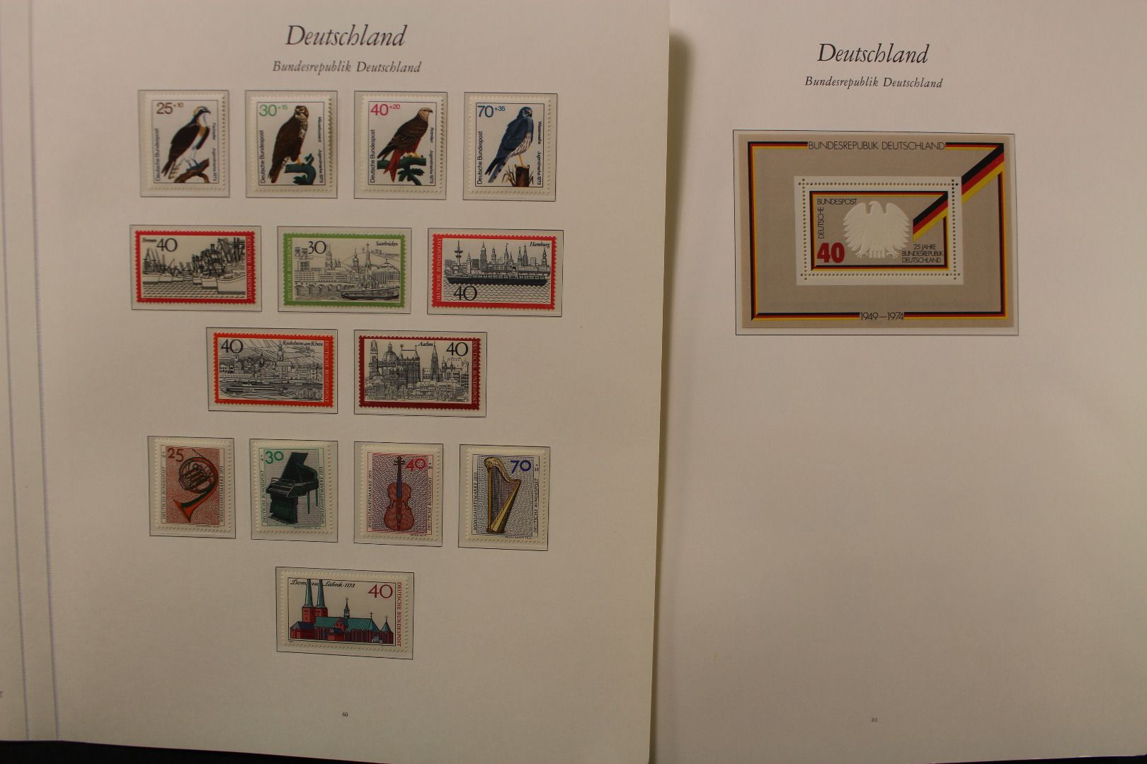 In den Hauptnummern ohne Posthorn und Heuss komplett. Bis 1955 unterschiedliche Qualität in ungebraucht bzw. postfrisch. Es sind auch einige nachgummierte bzw. entfalzte Marken enthalten, viel aber postfrisch. Nach 1960 wohl meist postfrische Sammlung mit etlichen Besonderheiten wie z.B. viele Blockeinzelmarken, C/D Werte aus Heftchen, Zusammendrucke ab 1977, Gummierungsbesonderheiten bei den Dauerserien, 5er Streifen mit Zählnummern usw. Untergebracht in 2 alten Borek Vordruckalben.