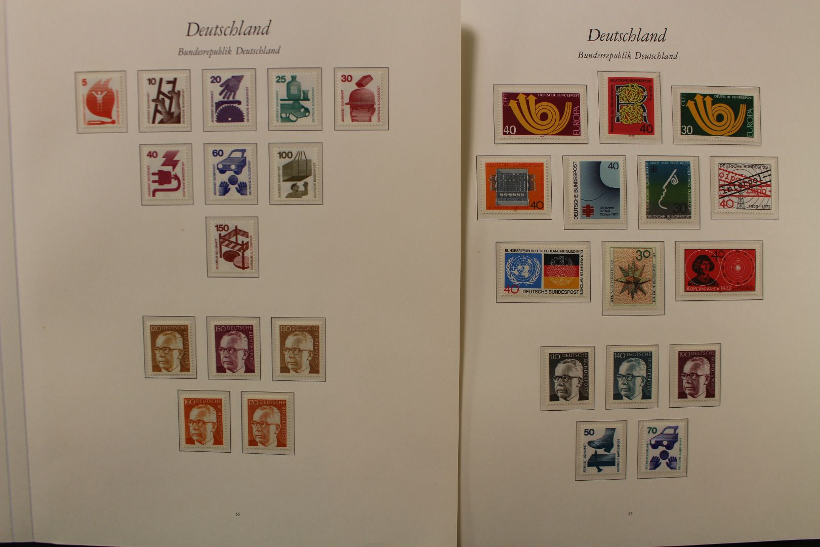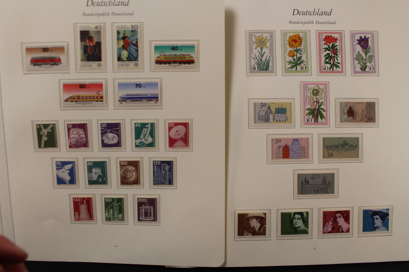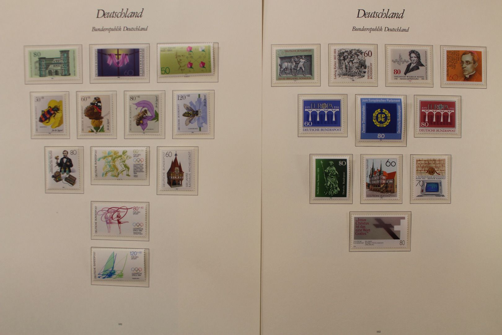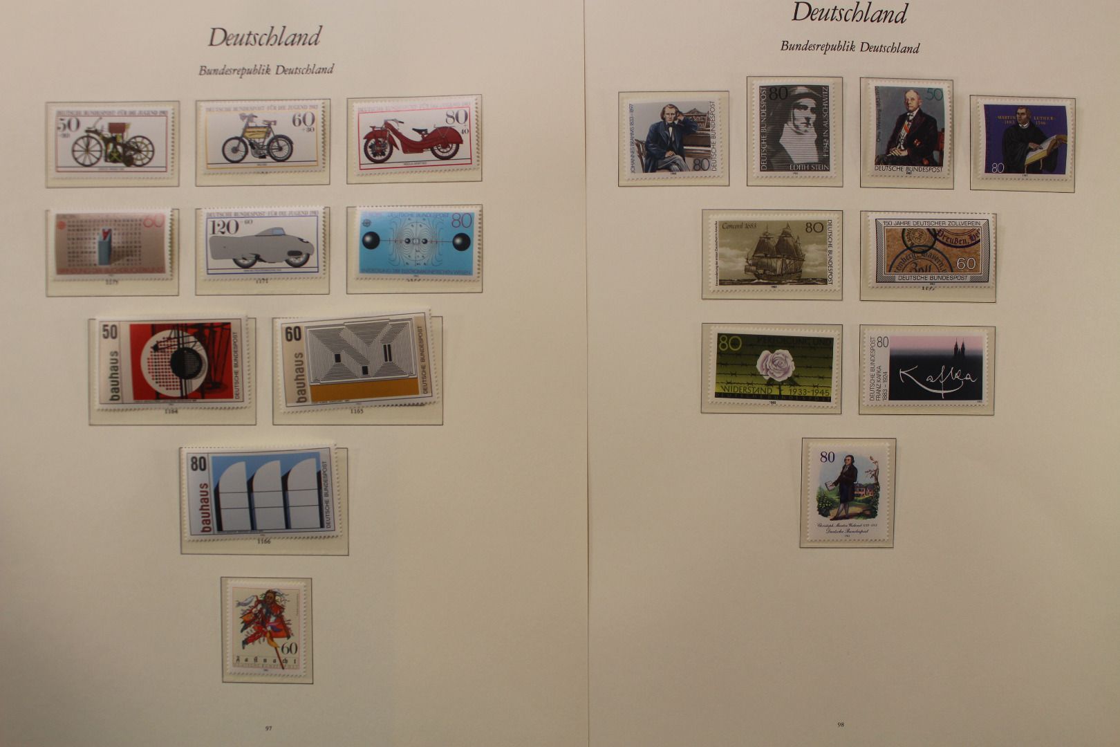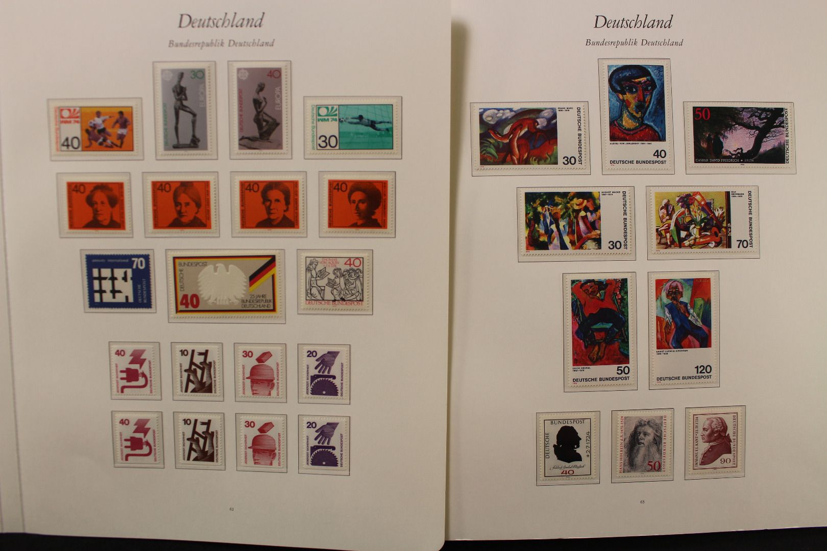 In den Hauptnummern ohne Posthorn und Heuss komplett. Bis 1955 unterschiedliche Qualität in ungebraucht bzw. postfrisch. Es sind auch einige nachgummierte bzw. entfalzte Marken enthalten, viel aber postfrisch. Nach 1960 wohl meist postfrische Sammlung mit etlichen Besonderheiten wie z.B. viele Blockeinzelmarken, C/D Werte aus Heftchen, Zusammendrucke ab 1977, Gummierungsbesonderheiten bei den Dauerserien, 5er Streifen mit Zählnummern usw. Untergebracht in 2 alten Borek Vordruckalben.