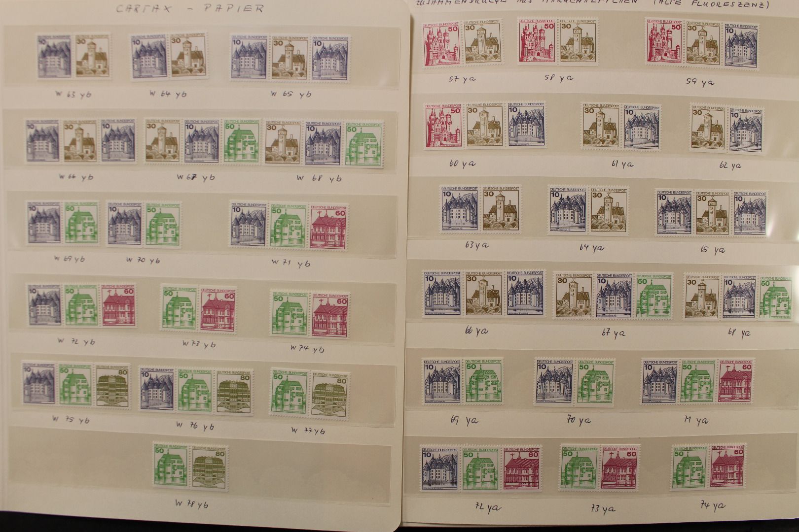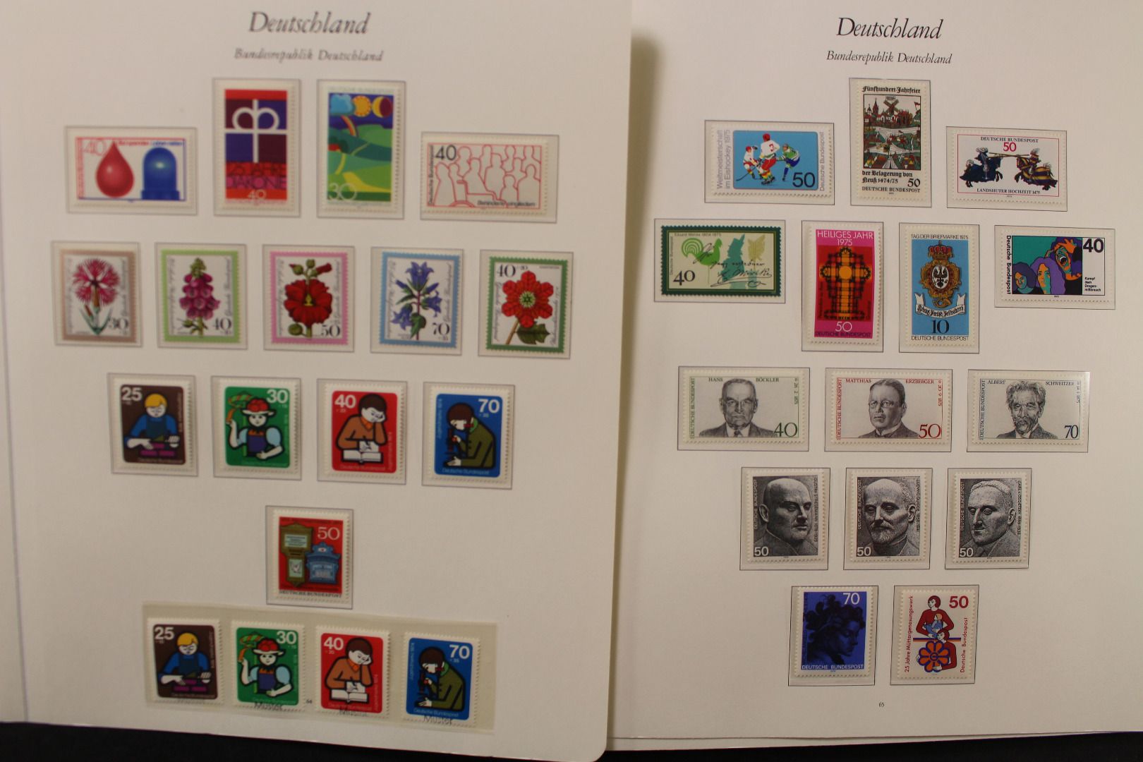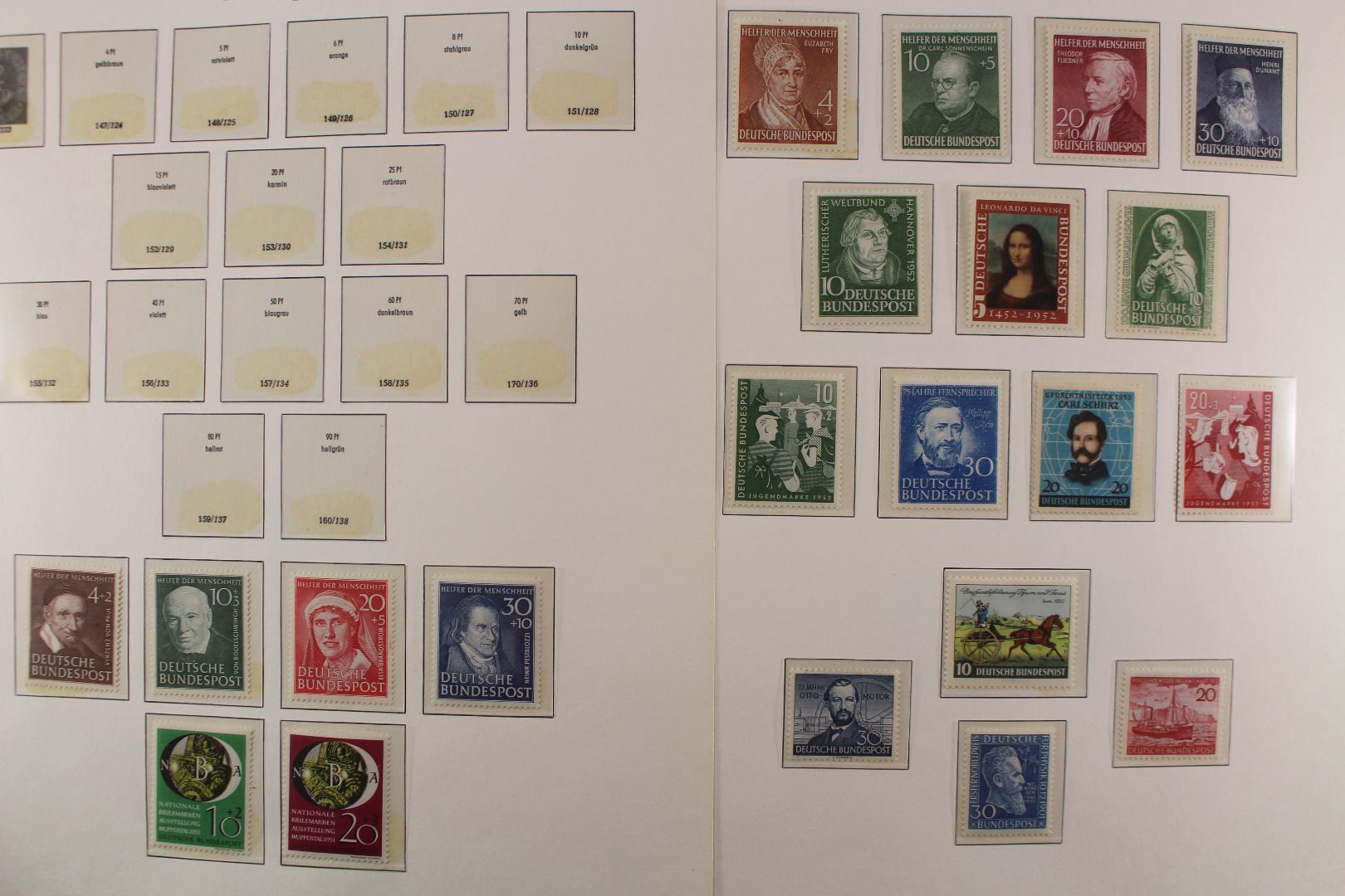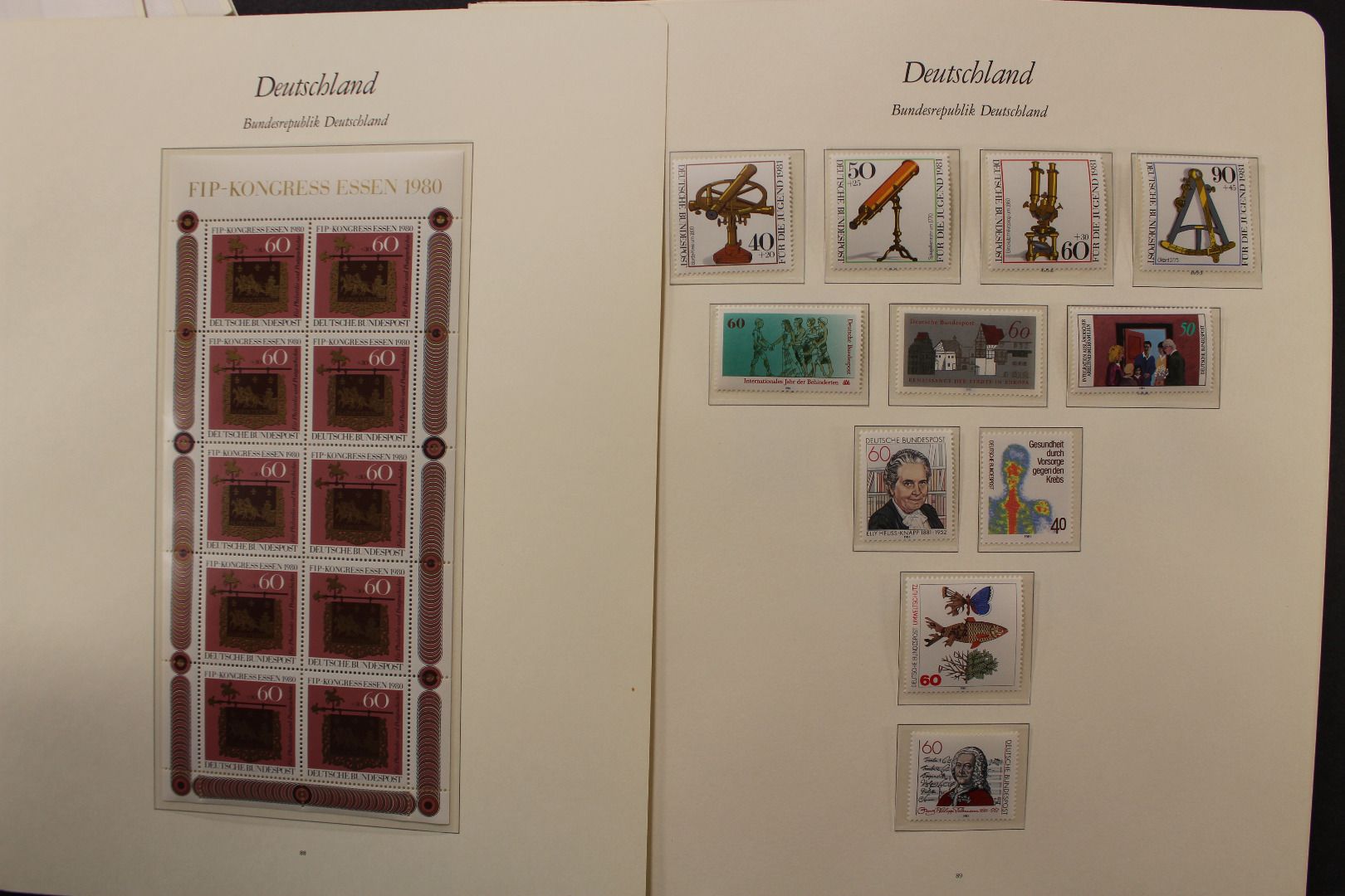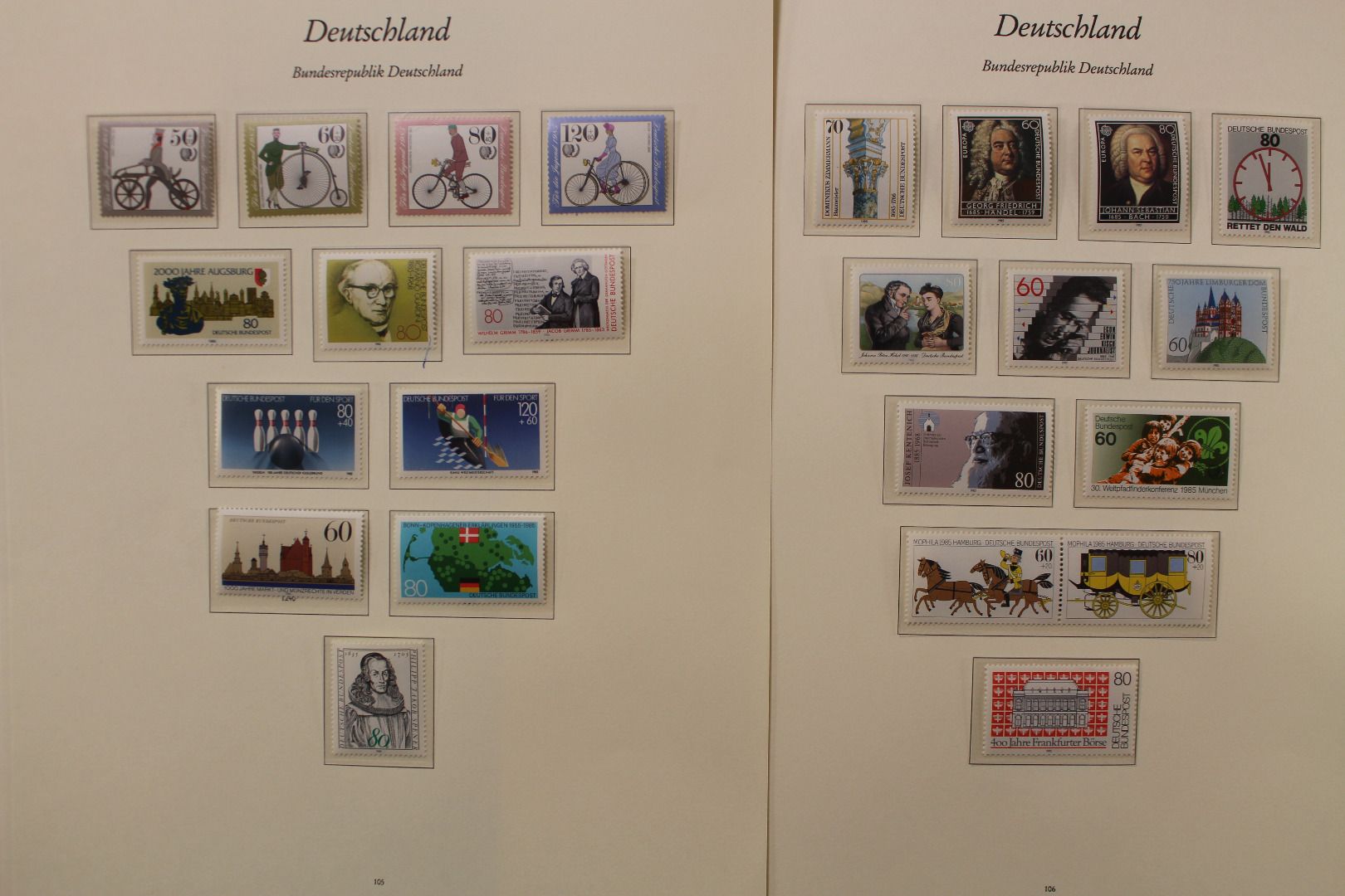 In den Hauptnummern ohne Posthorn und Heuss komplett. Bis 1955 unterschiedliche Qualität in ungebraucht bzw. postfrisch. Es sind auch einige nachgummierte bzw. entfalzte Marken enthalten, viel aber postfrisch. Nach 1960 wohl meist postfrische Sammlung mit etlichen Besonderheiten wie z.B. viele Blockeinzelmarken, C/D Werte aus Heftchen, Zusammendrucke ab 1977, Gummierungsbesonderheiten bei den Dauerserien, 5er Streifen mit Zählnummern usw. Untergebracht in 2 alten Borek Vordruckalben.