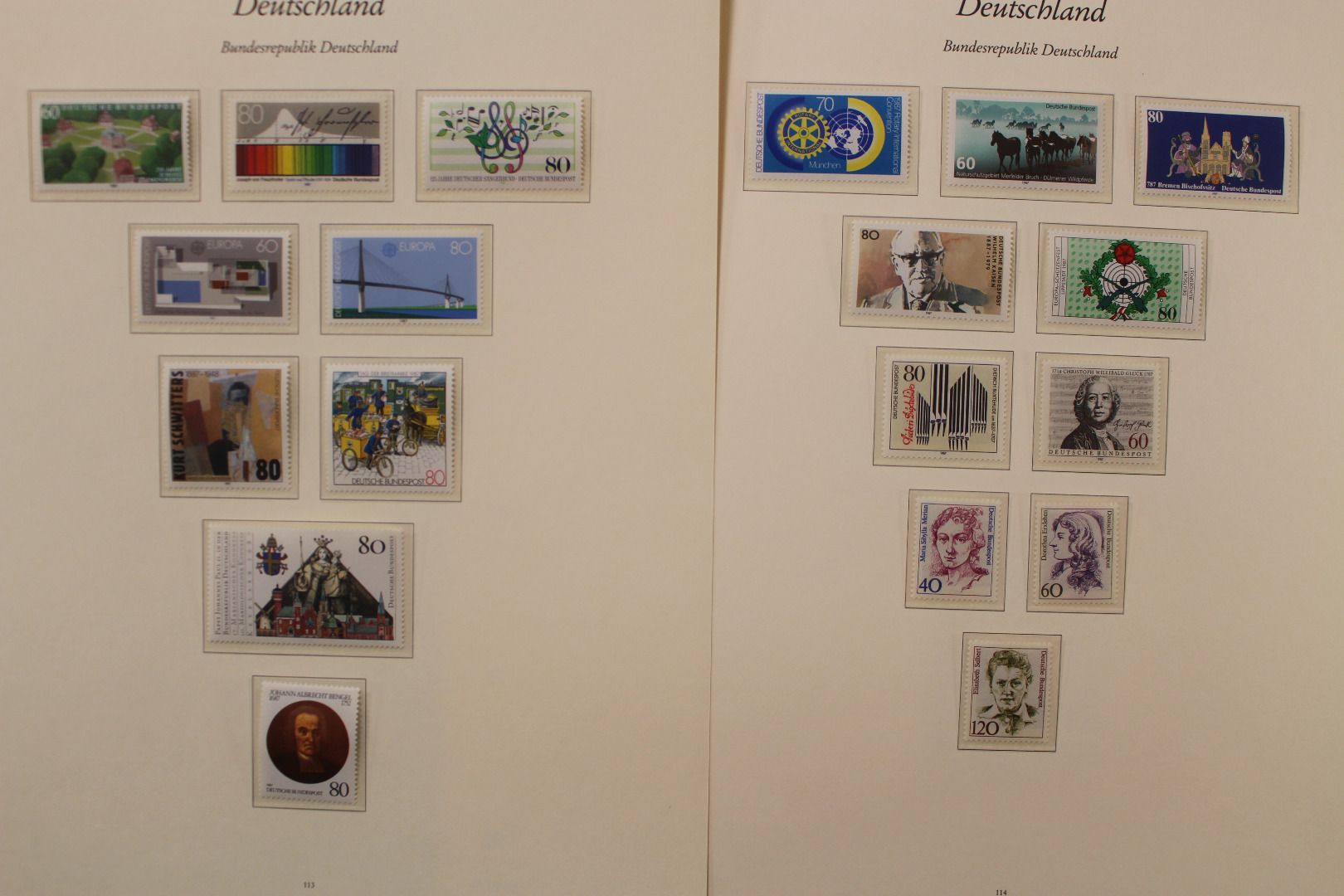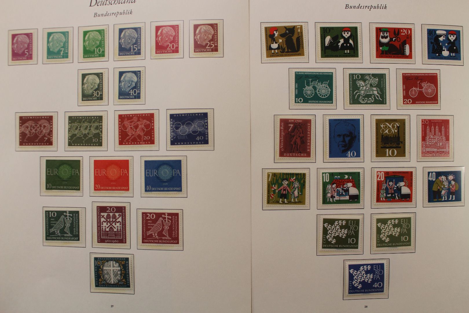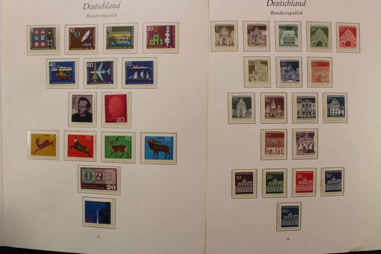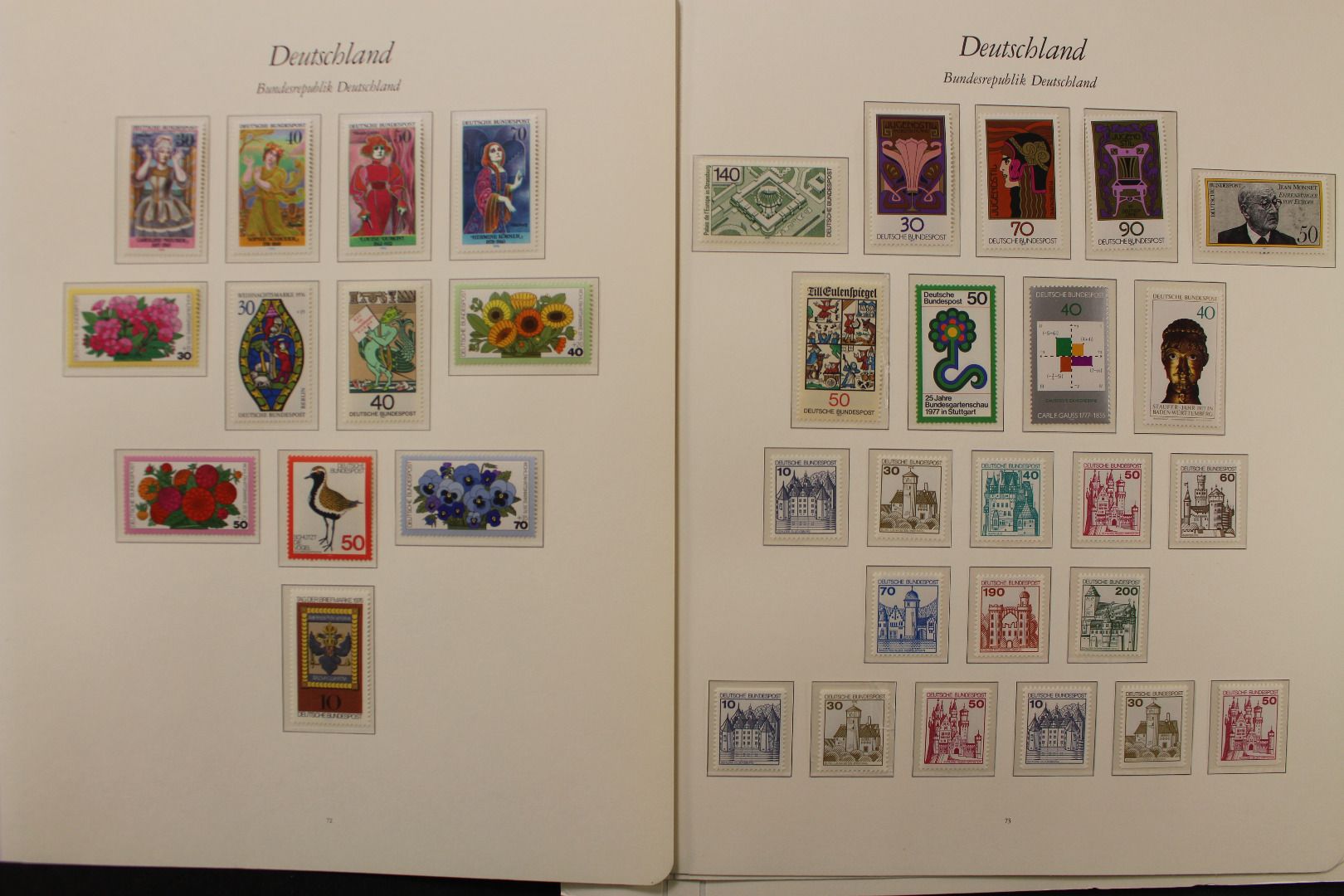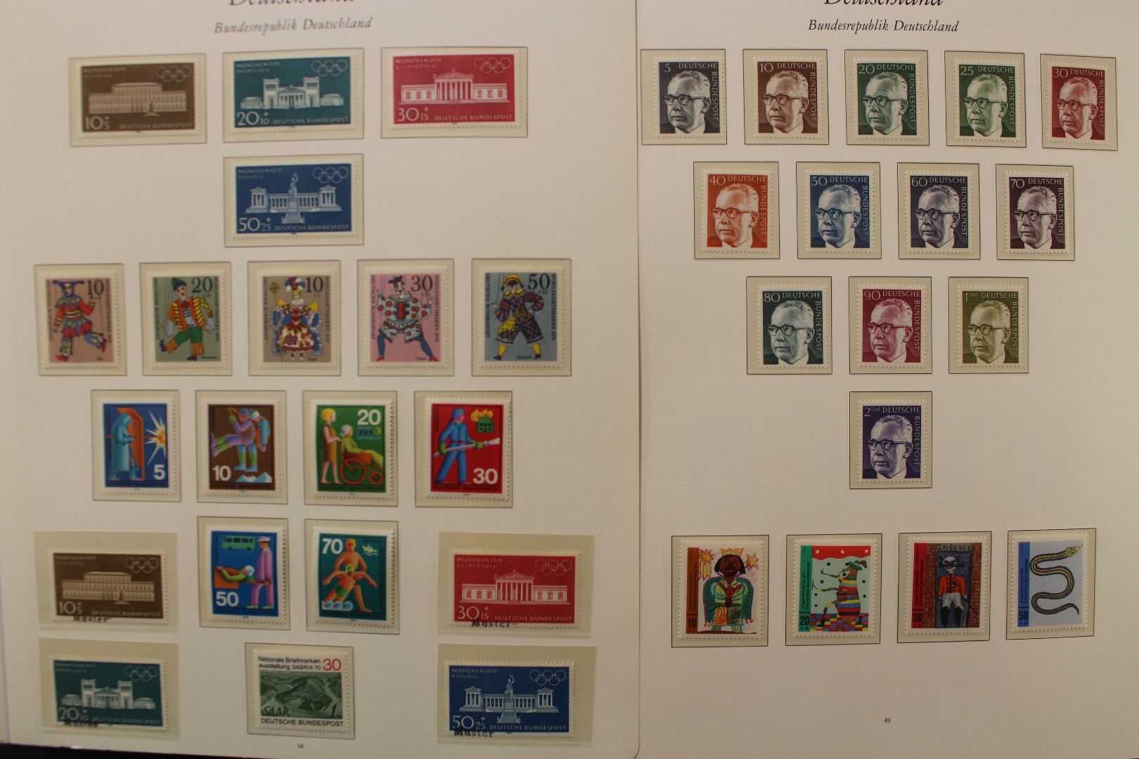 In den Hauptnummern ohne Posthorn und Heuss komplett. Bis 1955 unterschiedliche Qualität in ungebraucht bzw. postfrisch. Es sind auch einige nachgummierte bzw. entfalzte Marken enthalten, viel aber postfrisch. Nach 1960 wohl meist postfrische Sammlung mit etlichen Besonderheiten wie z.B. viele Blockeinzelmarken, C/D Werte aus Heftchen, Zusammendrucke ab 1977, Gummierungsbesonderheiten bei den Dauerserien, 5er Streifen mit Zählnummern usw. Untergebracht in 2 alten Borek Vordruckalben.