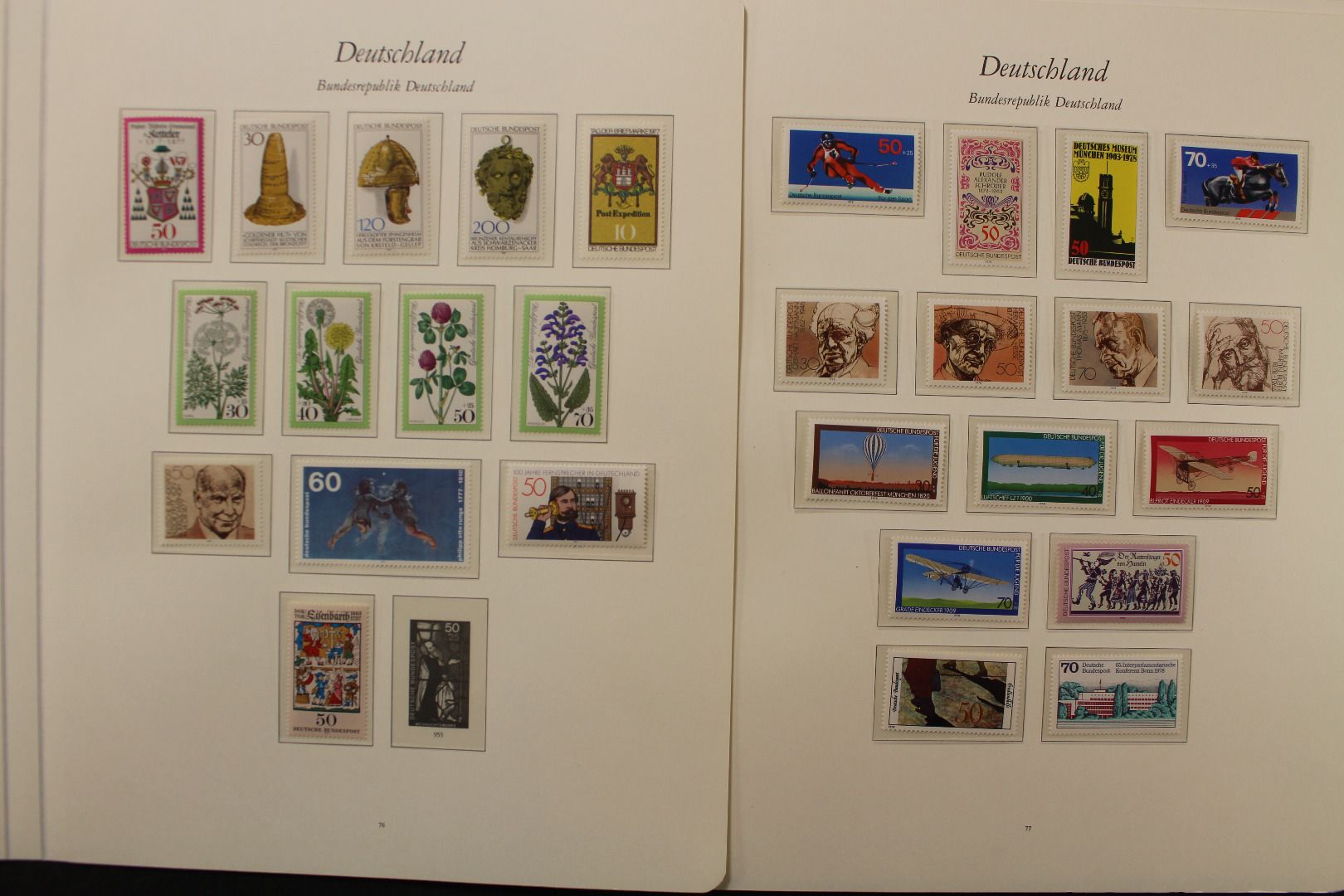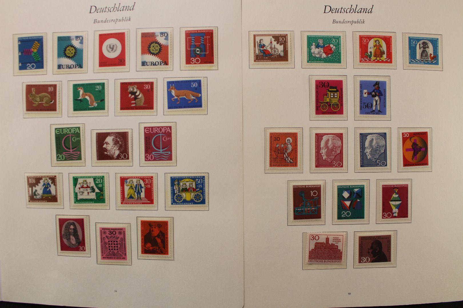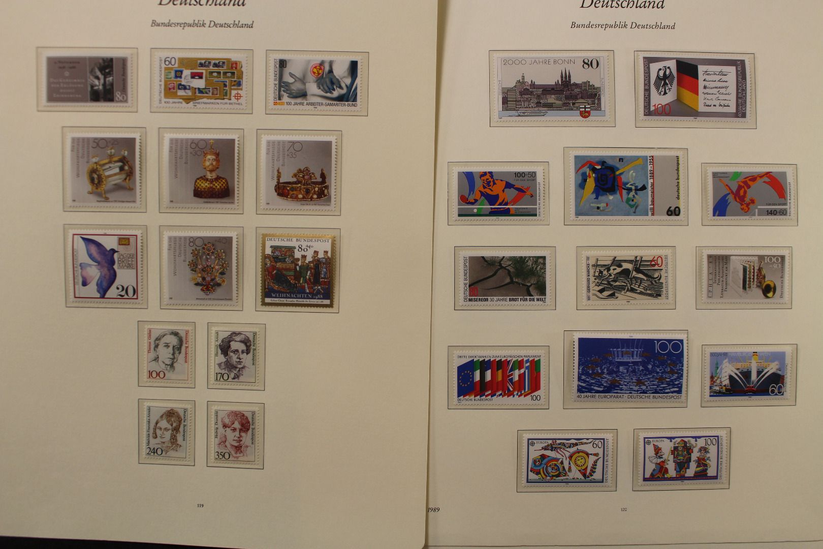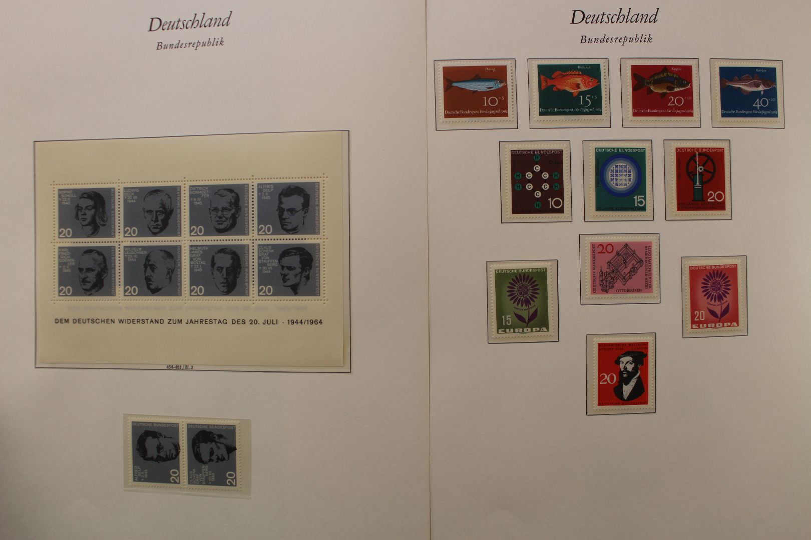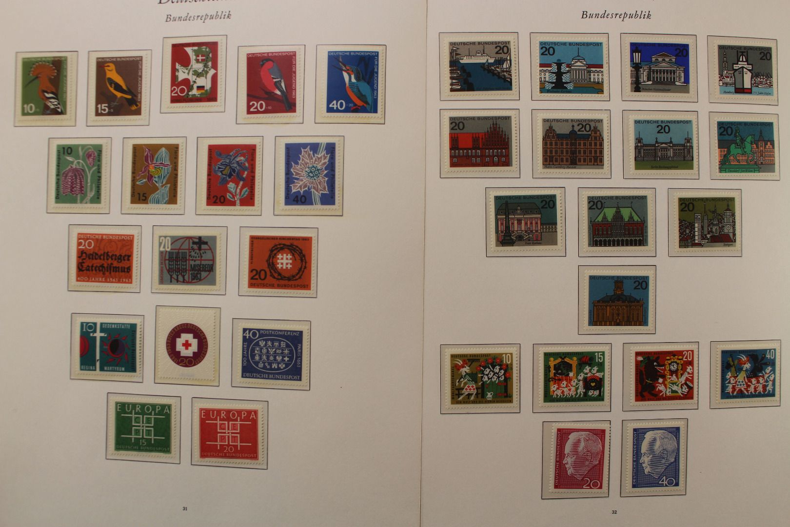 In den Hauptnummern ohne Posthorn und Heuss komplett. Bis 1955 unterschiedliche Qualität in ungebraucht bzw. postfrisch. Es sind auch einige nachgummierte bzw. entfalzte Marken enthalten, viel aber postfrisch. Nach 1960 wohl meist postfrische Sammlung mit etlichen Besonderheiten wie z.B. viele Blockeinzelmarken, C/D Werte aus Heftchen, Zusammendrucke ab 1977, Gummierungsbesonderheiten bei den Dauerserien, 5er Streifen mit Zählnummern usw. Untergebracht in 2 alten Borek Vordruckalben.
