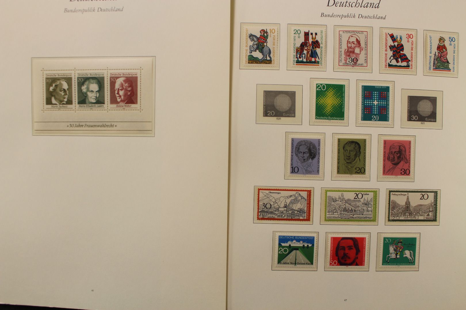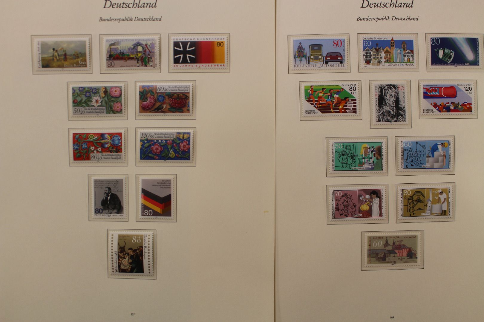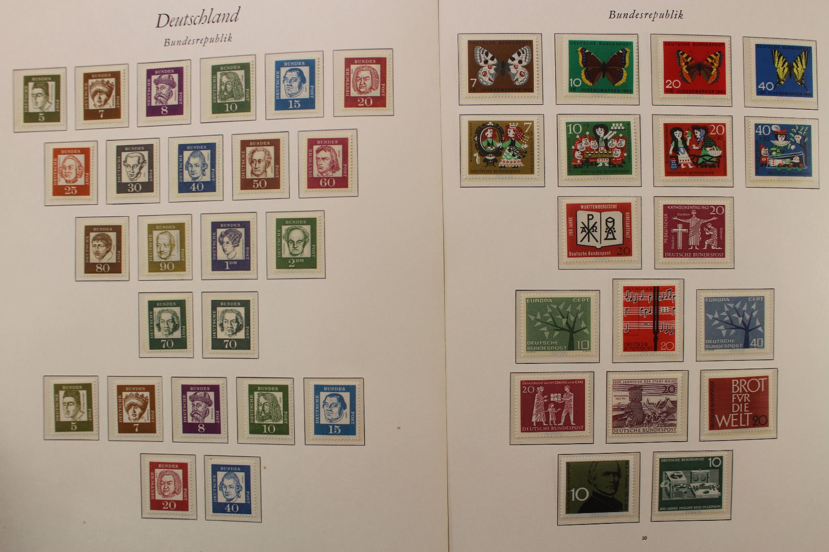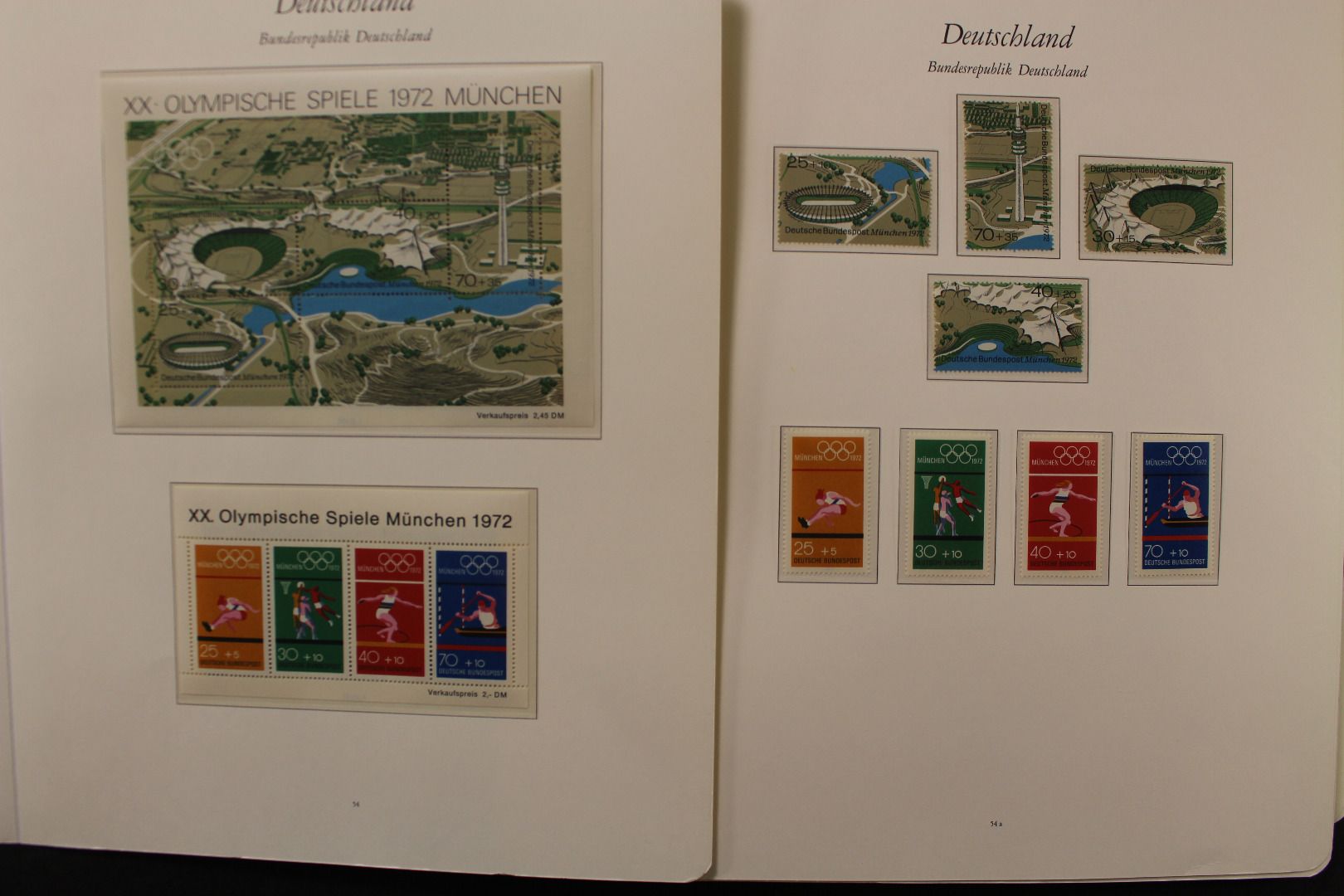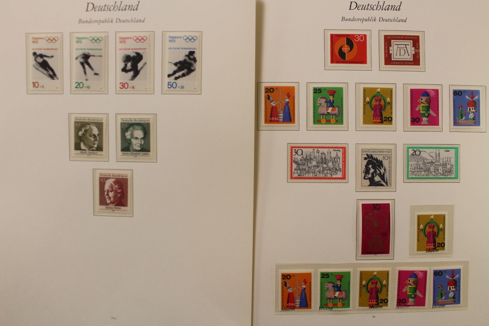 In den Hauptnummern ohne Posthorn und Heuss komplett. Bis 1955 unterschiedliche Qualität in ungebraucht bzw. postfrisch. Es sind auch einige nachgummierte bzw. entfalzte Marken enthalten, viel aber postfrisch. Nach 1960 wohl meist postfrische Sammlung mit etlichen Besonderheiten wie z.B. viele Blockeinzelmarken, C/D Werte aus Heftchen, Zusammendrucke ab 1977, Gummierungsbesonderheiten bei den Dauerserien, 5er Streifen mit Zählnummern usw. Untergebracht in 2 alten Borek Vordruckalben.