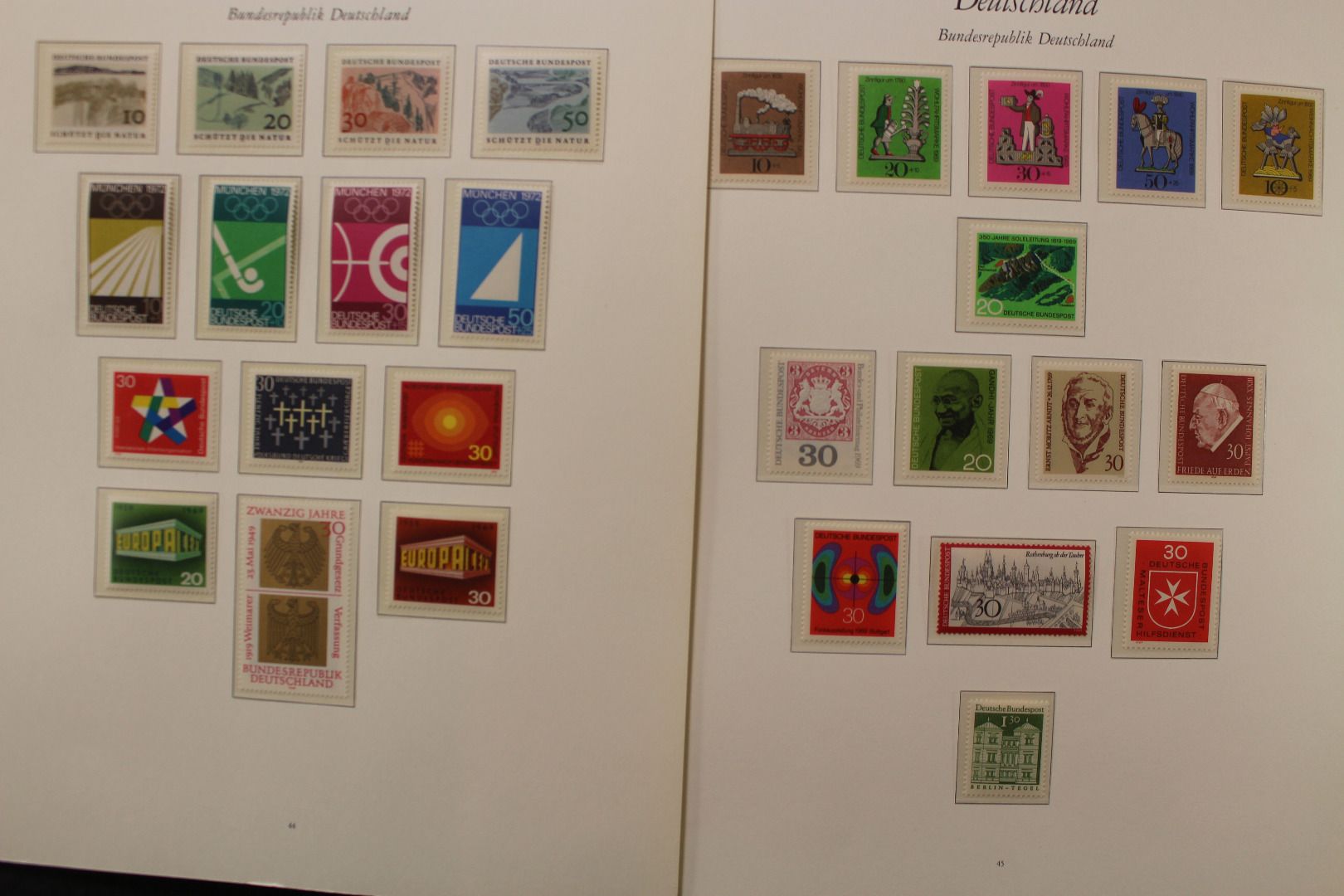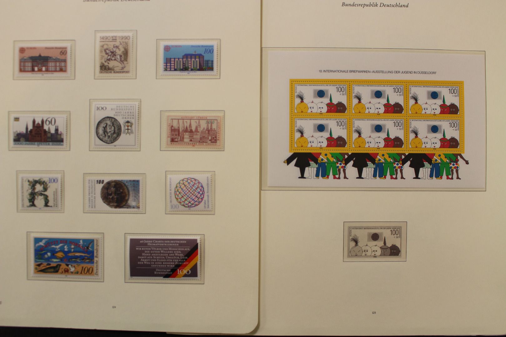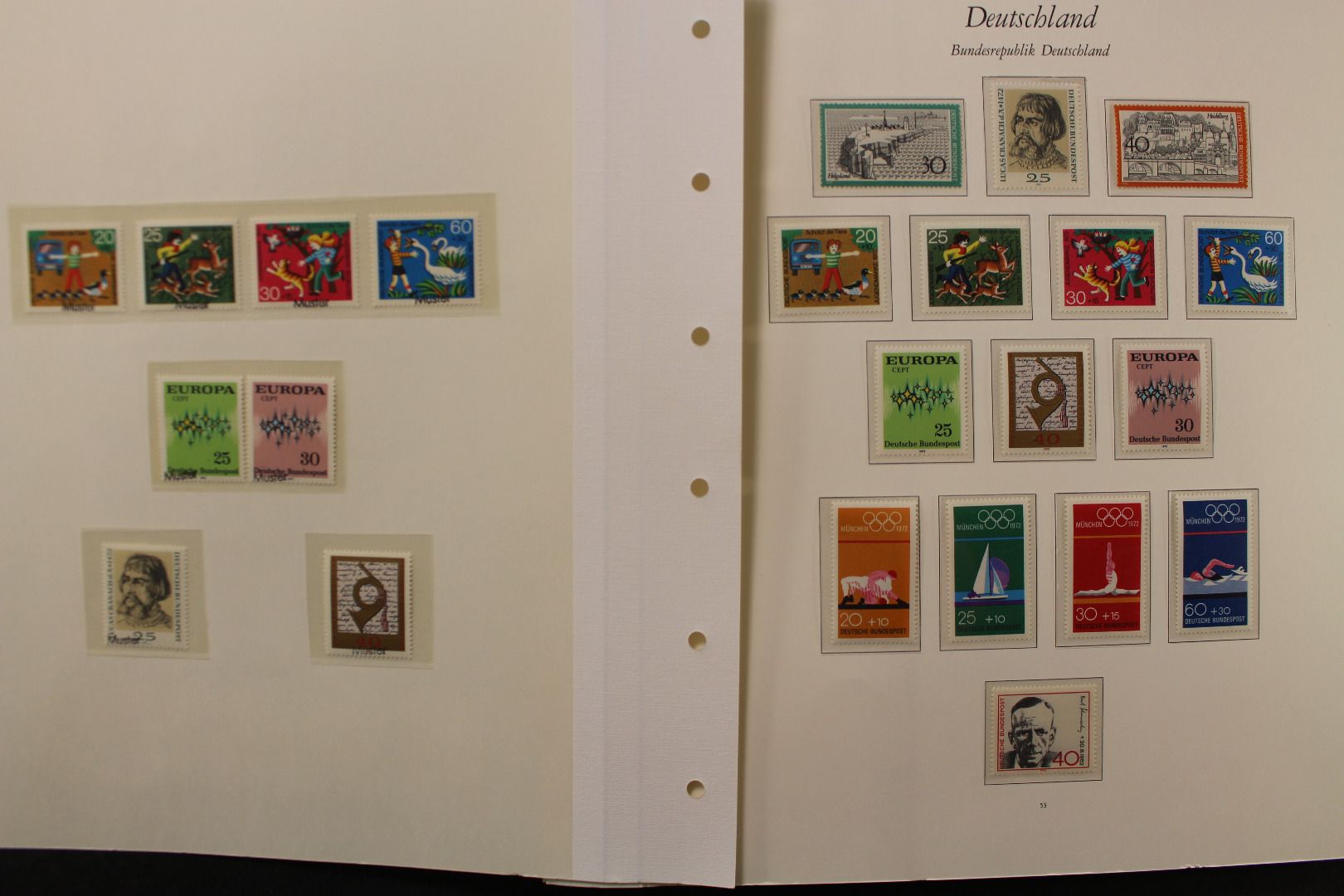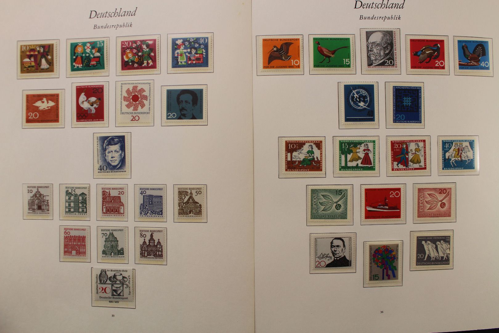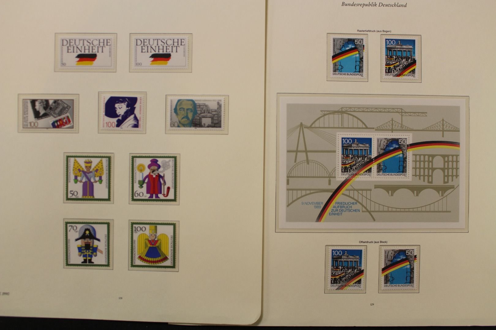 In den Hauptnummern ohne Posthorn und Heuss komplett. Bis 1955 unterschiedliche Qualität in ungebraucht bzw. postfrisch. Es sind auch einige nachgummierte bzw. entfalzte Marken enthalten, viel aber postfrisch. Nach 1960 wohl meist postfrische Sammlung mit etlichen Besonderheiten wie z.B. viele Blockeinzelmarken, C/D Werte aus Heftchen, Zusammendrucke ab 1977, Gummierungsbesonderheiten bei den Dauerserien, 5er Streifen mit Zählnummern usw. Untergebracht in 2 alten Borek Vordruckalben.