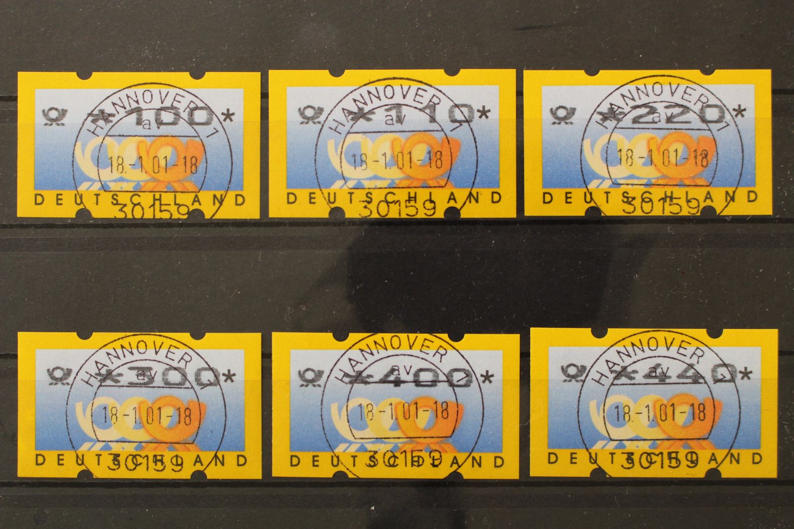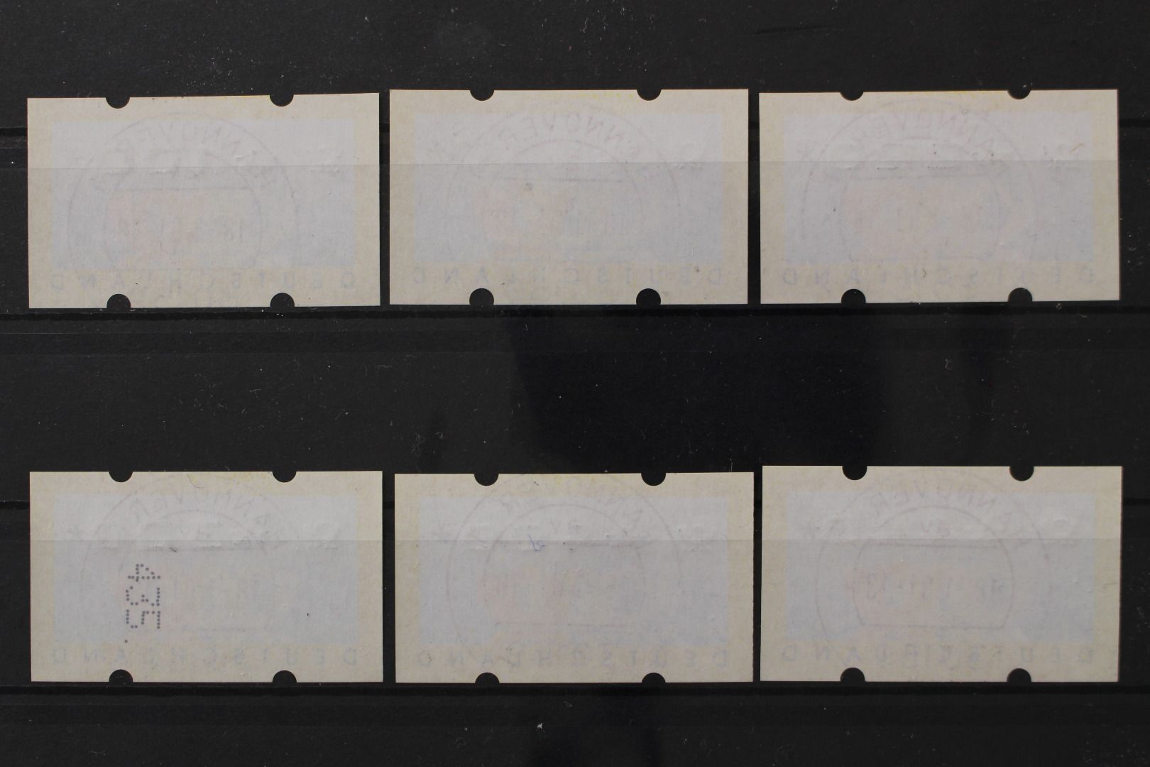 100, 110, 220, 300, 400 und 440 Pf. Postemblem, 6 Werte, gummiert, 300 Pf. mit Zählnummer