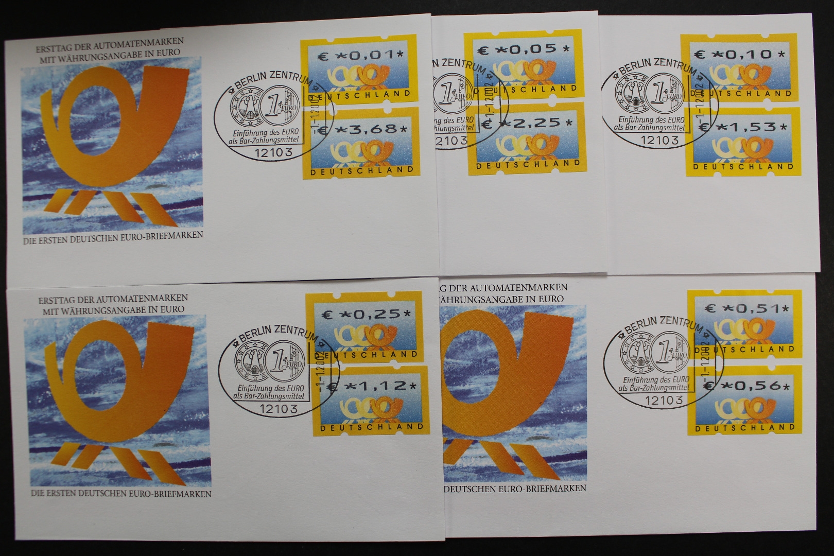 Postemblem, Tastensatz mit 10 Werten von 0,11 bis 3,68 € auf 5 Umschlägen.