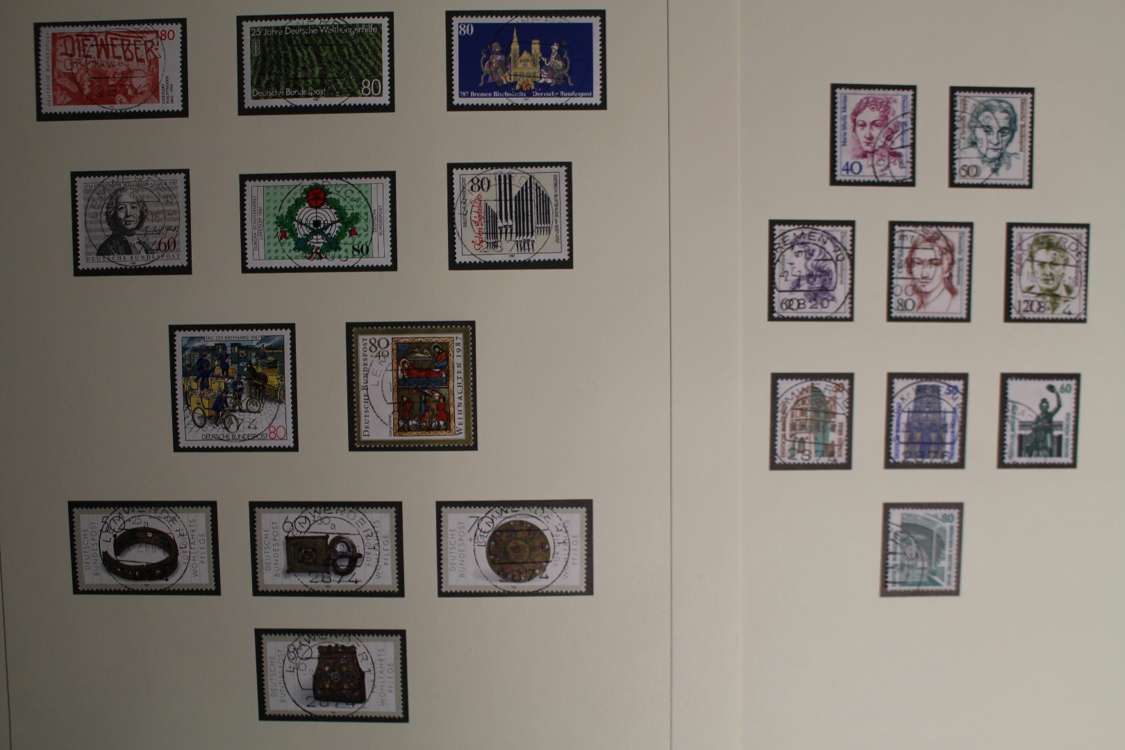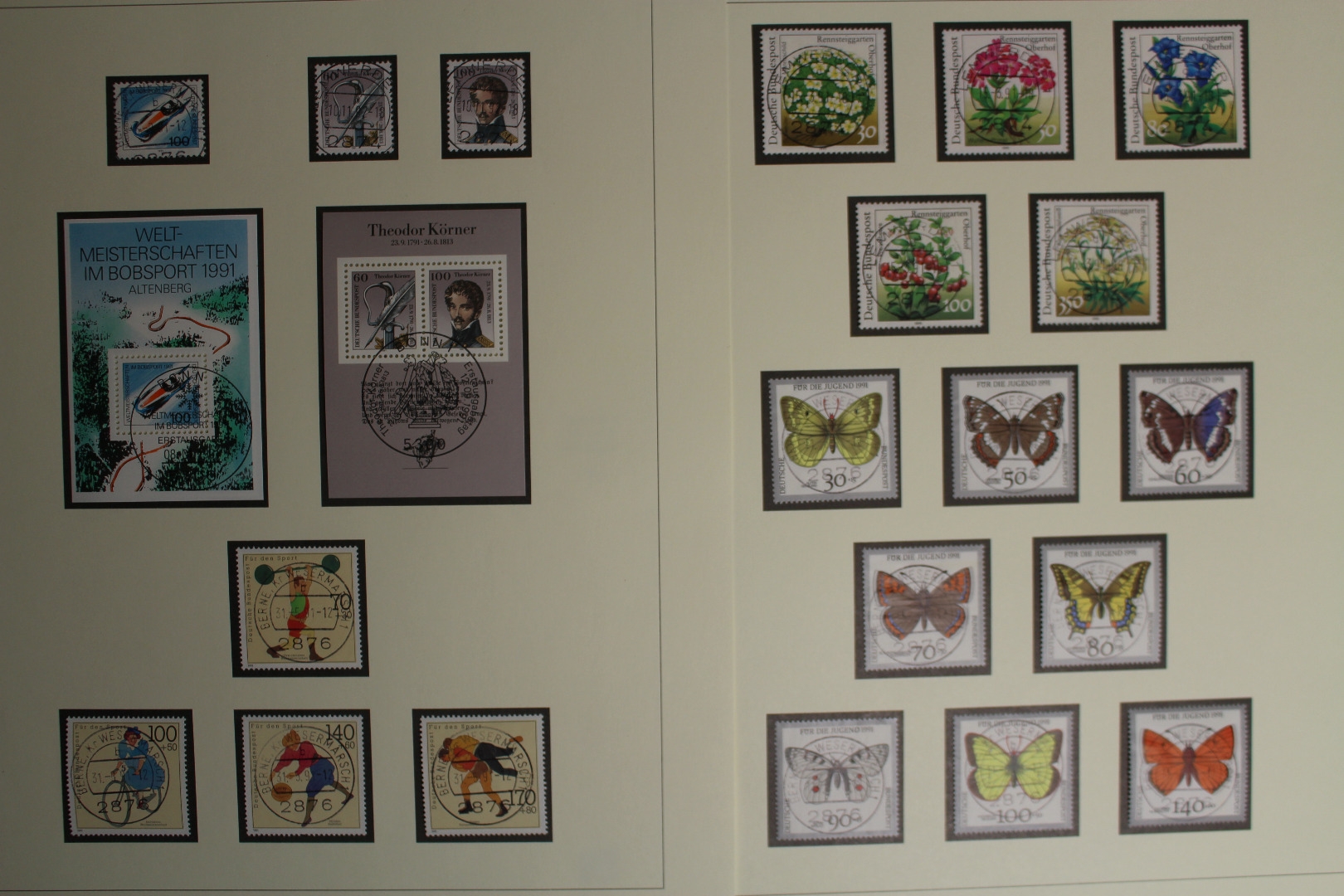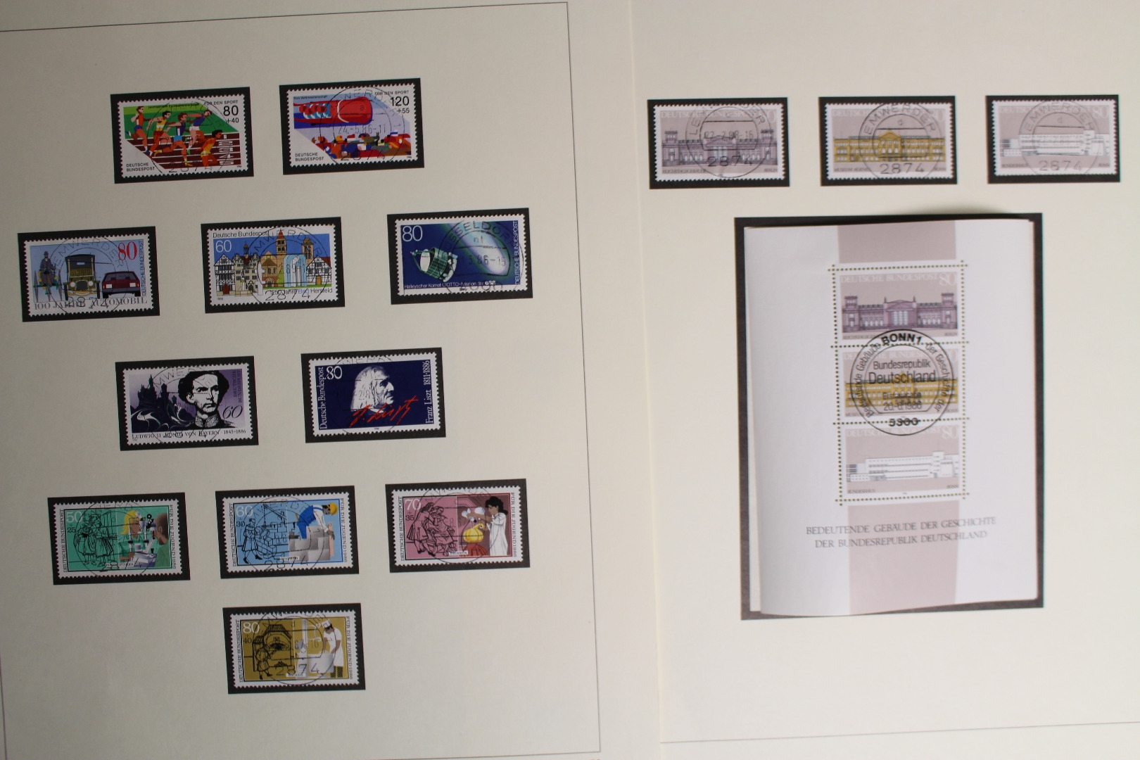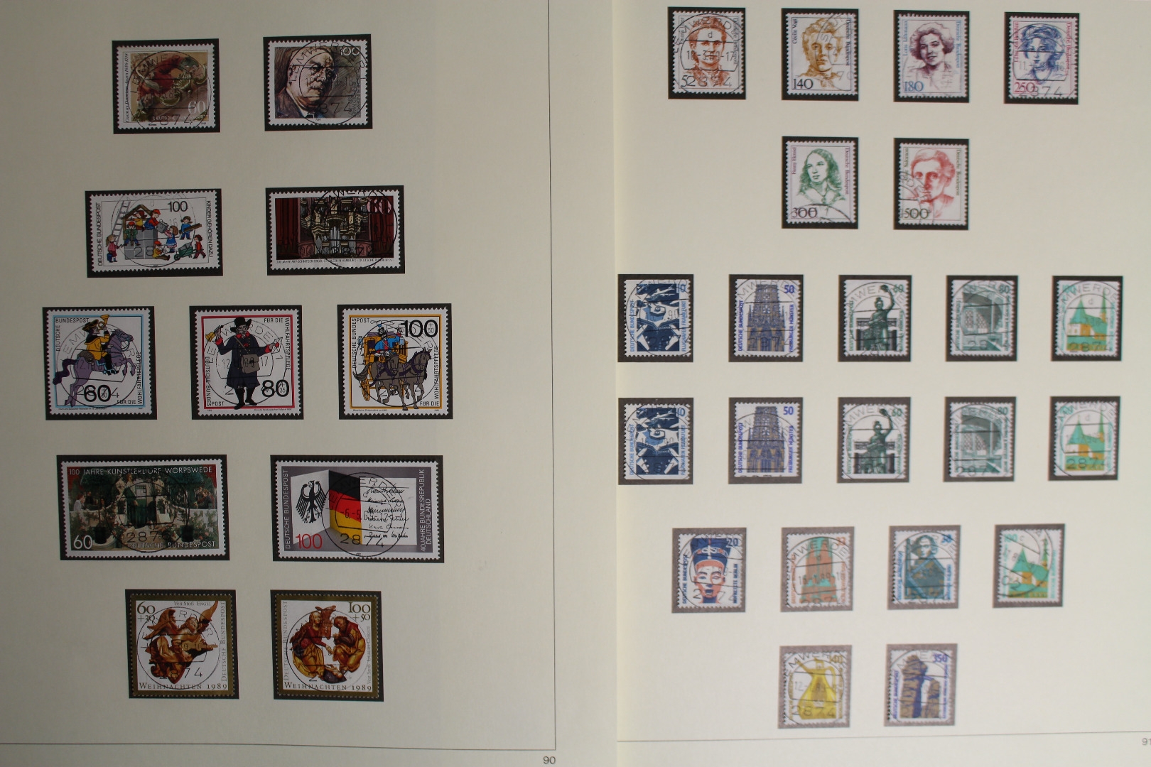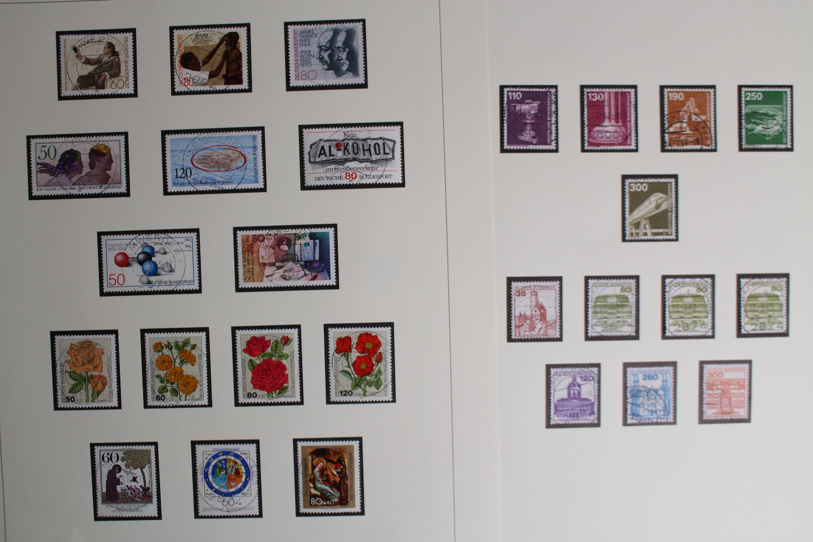 Sehr umfangreiche Sammlung, überwiegend wurden die Briefmarken mit sauberen zentrischen Tagesstempeln gesammelt. Die Briefmarken sind meist ohne Gummierung und wurden sauber auf SAFE Vordruckblättern eingefalzt. Die Folien sind nicht enthalten. Die Blöcke sind meist mit ESST. Auch sind viele Besonderheiten wie z.B. C/D Werte der Dauerserien und Blockeinzelmarken enthalten. Die Qualität ist überwiegend gut.