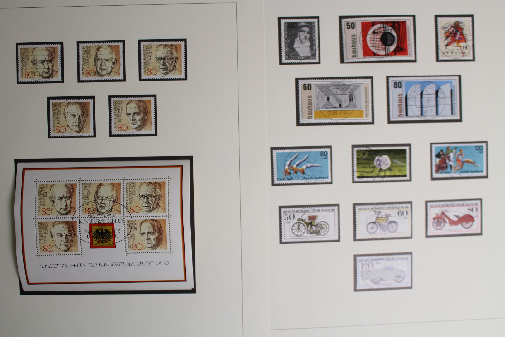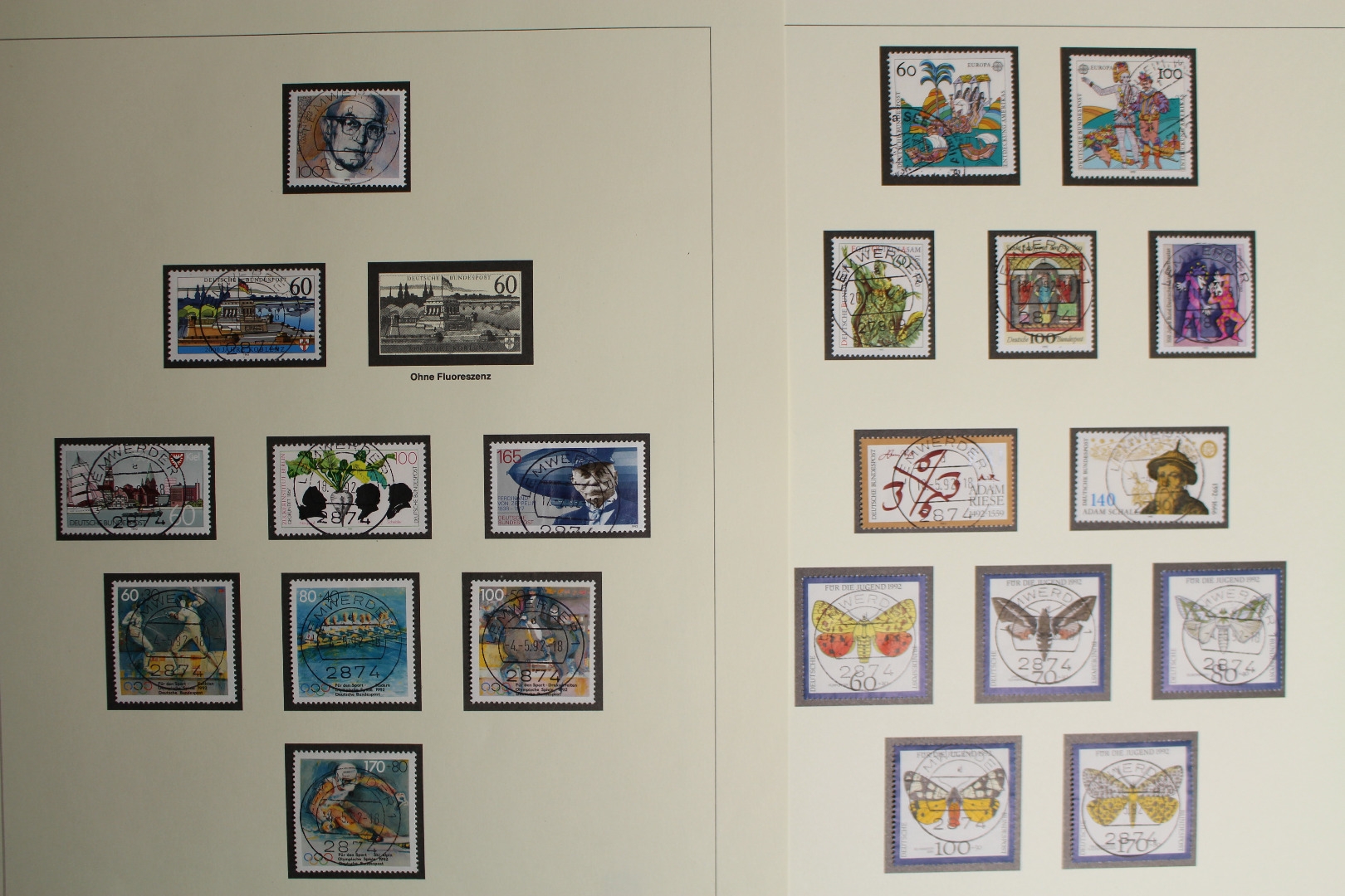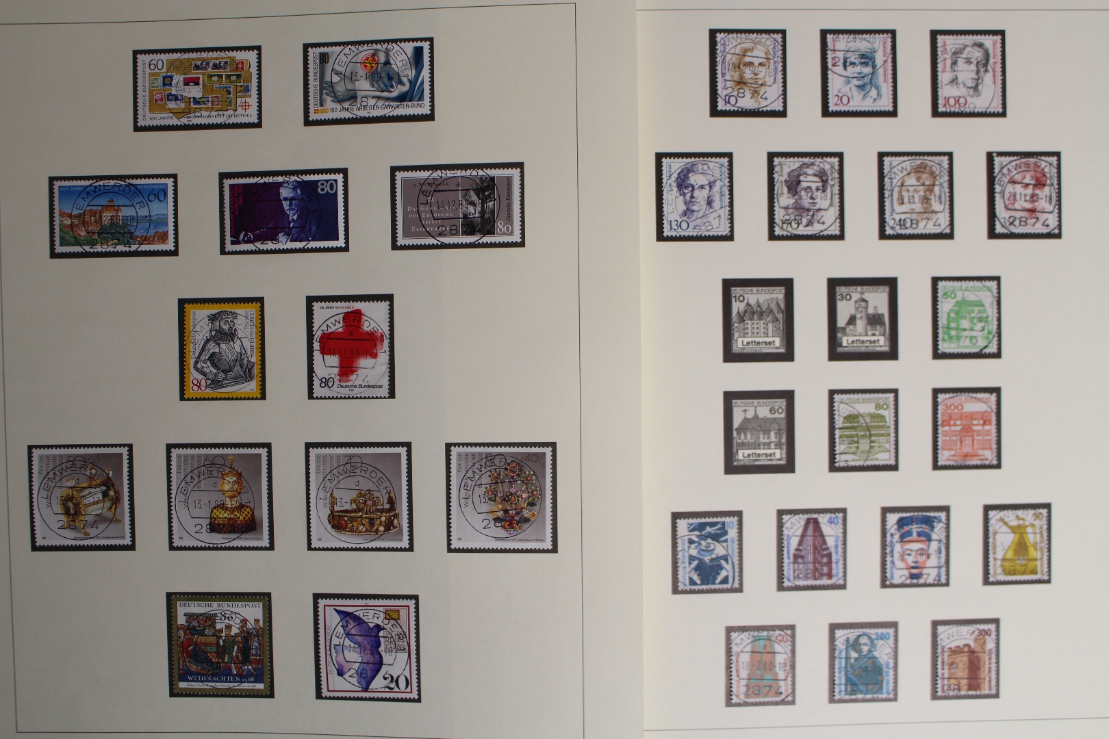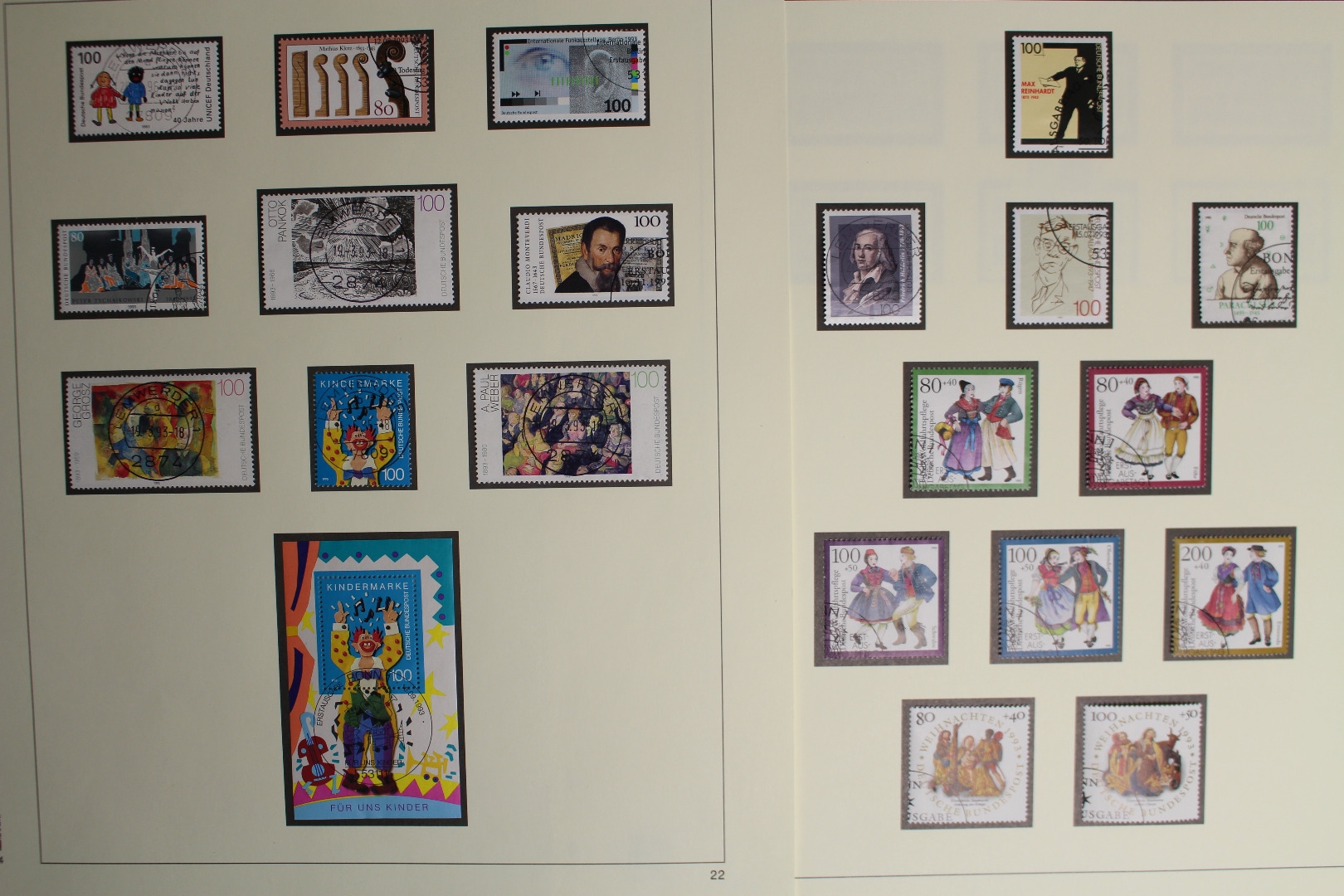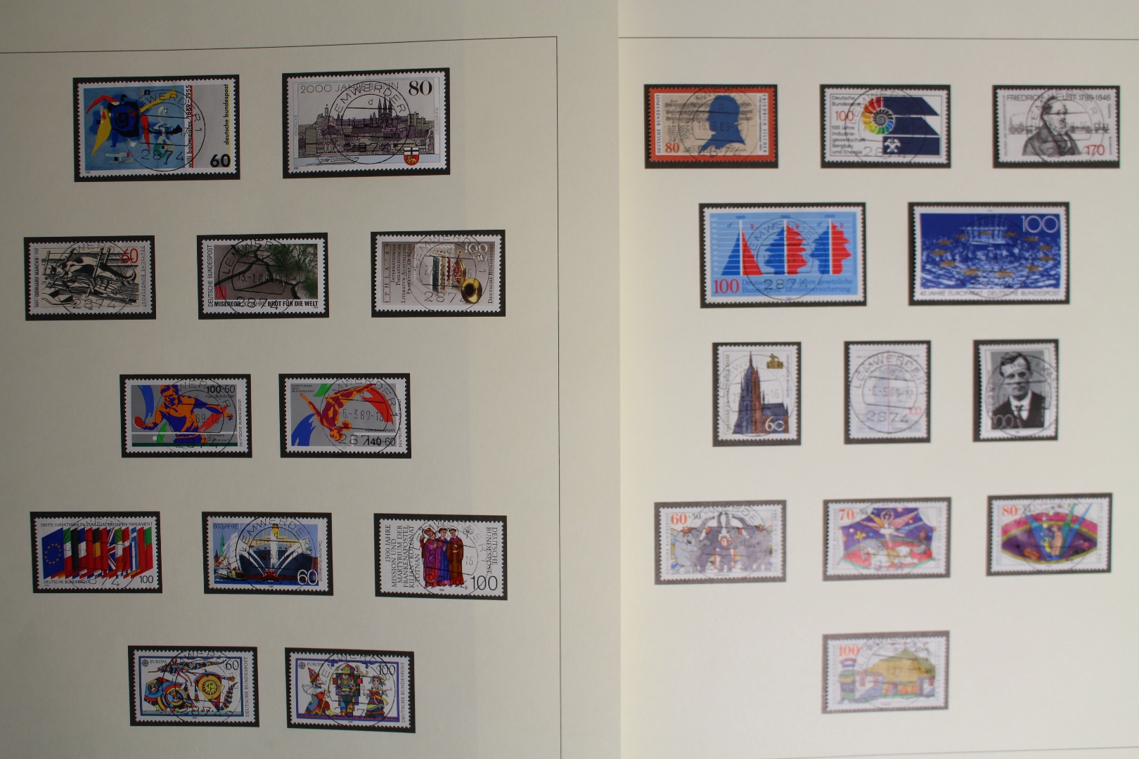 Sehr umfangreiche Sammlung, überwiegend wurden die Briefmarken mit sauberen zentrischen Tagesstempeln gesammelt. Die Briefmarken sind meist ohne Gummierung und wurden sauber auf SAFE Vordruckblättern eingefalzt. Die Folien sind nicht enthalten. Die Blöcke sind meist mit ESST. Auch sind viele Besonderheiten wie z.B. C/D Werte der Dauerserien und Blockeinzelmarken enthalten. Die Qualität ist überwiegend gut.