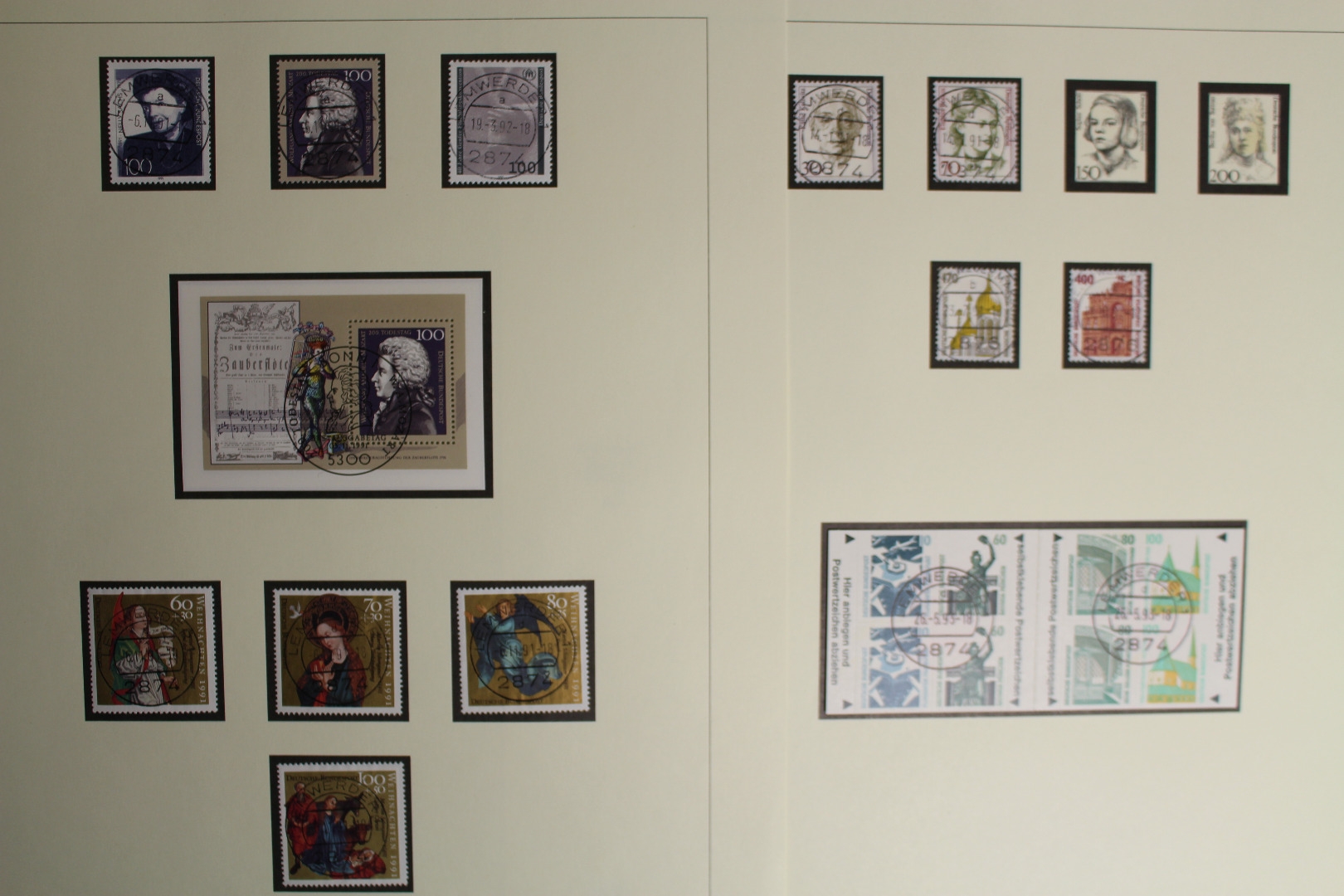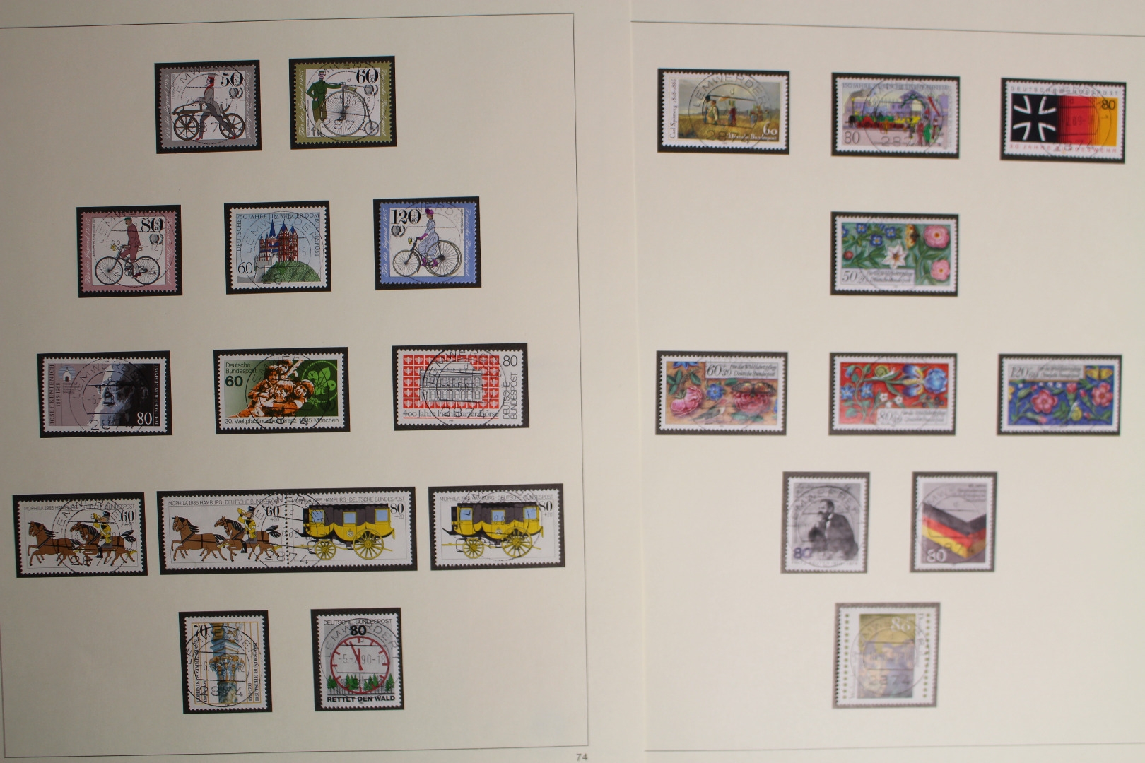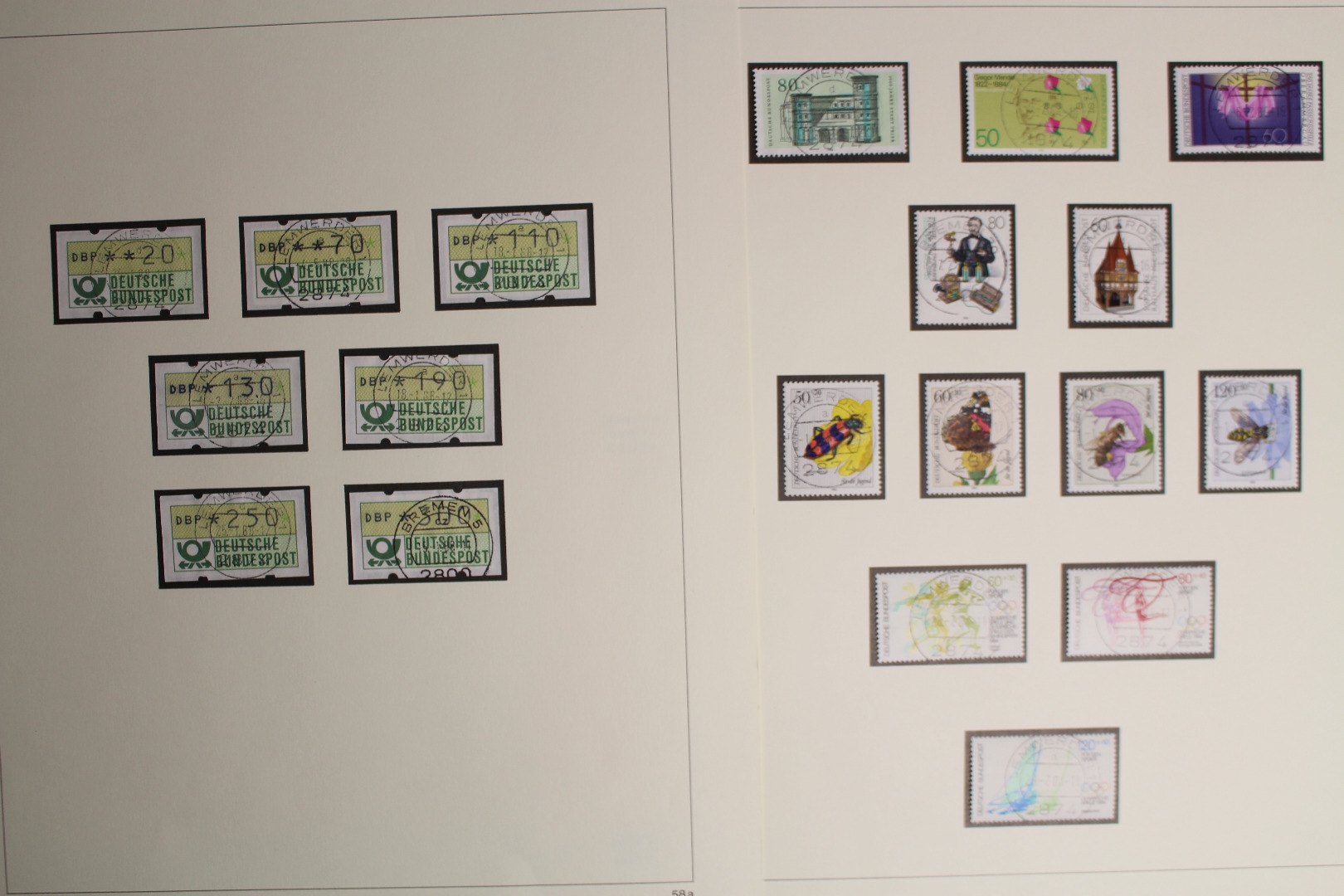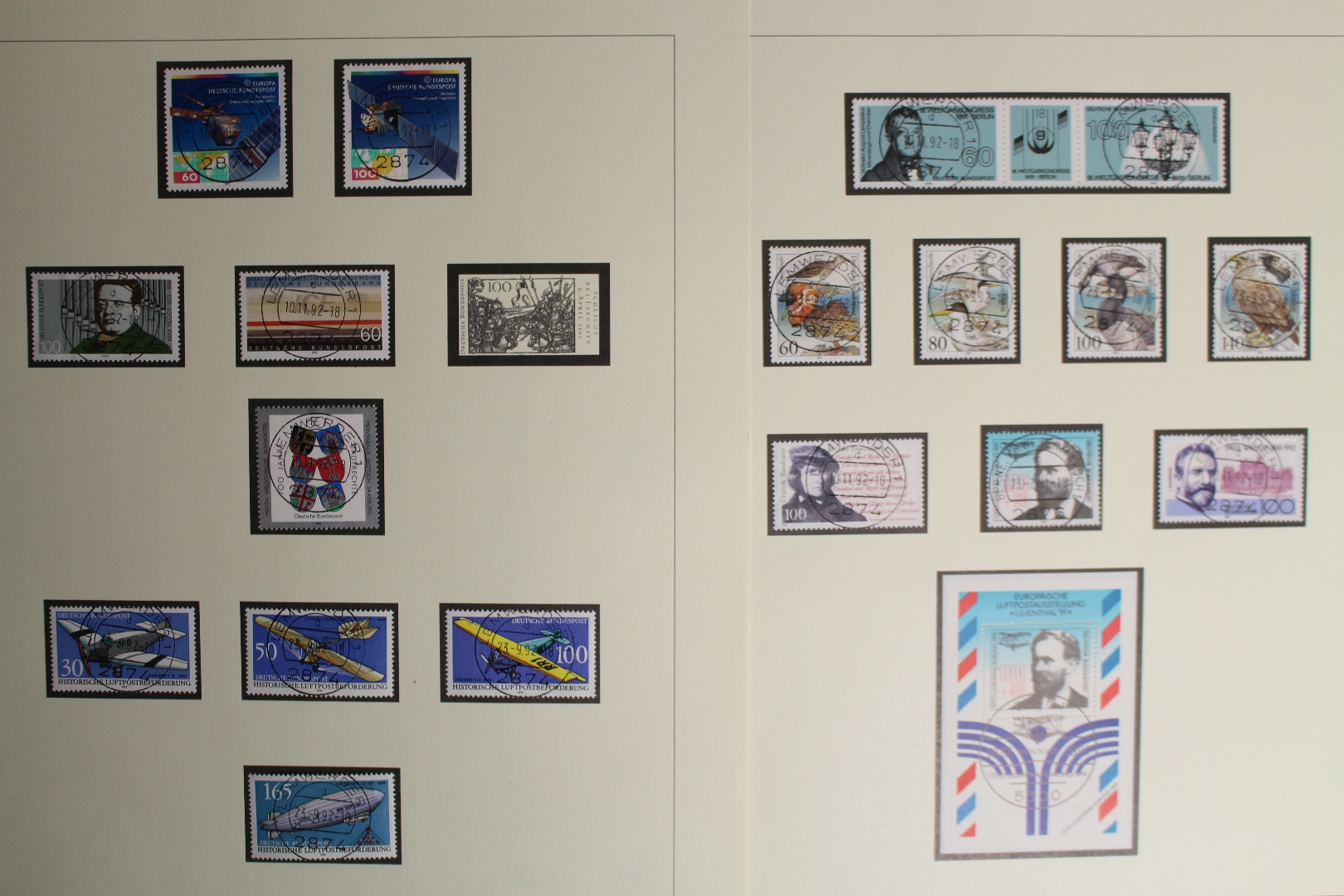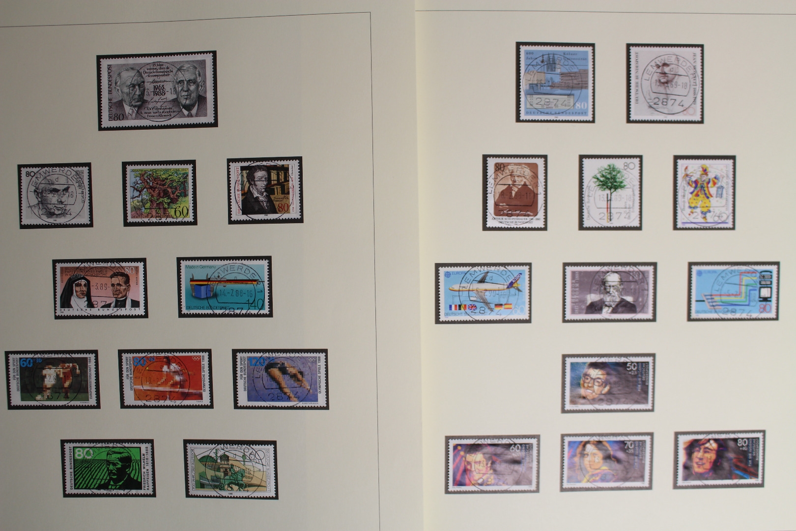 Sehr umfangreiche Sammlung, überwiegend wurden die Briefmarken mit sauberen zentrischen Tagesstempeln gesammelt. Die Briefmarken sind meist ohne Gummierung und wurden sauber auf SAFE Vordruckblättern eingefalzt. Die Folien sind nicht enthalten. Die Blöcke sind meist mit ESST. Auch sind viele Besonderheiten wie z.B. C/D Werte der Dauerserien und Blockeinzelmarken enthalten. Die Qualität ist überwiegend gut.