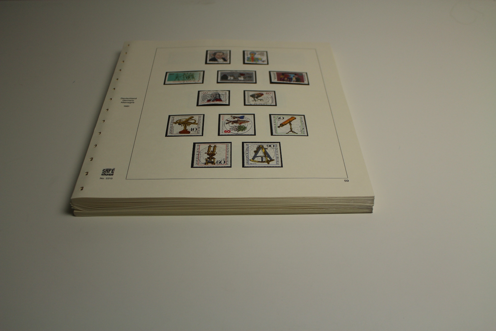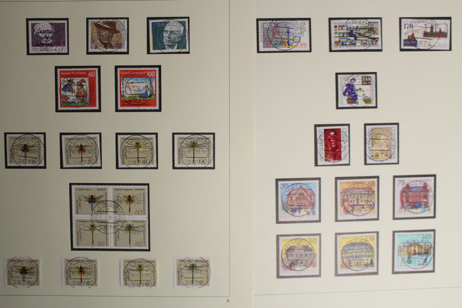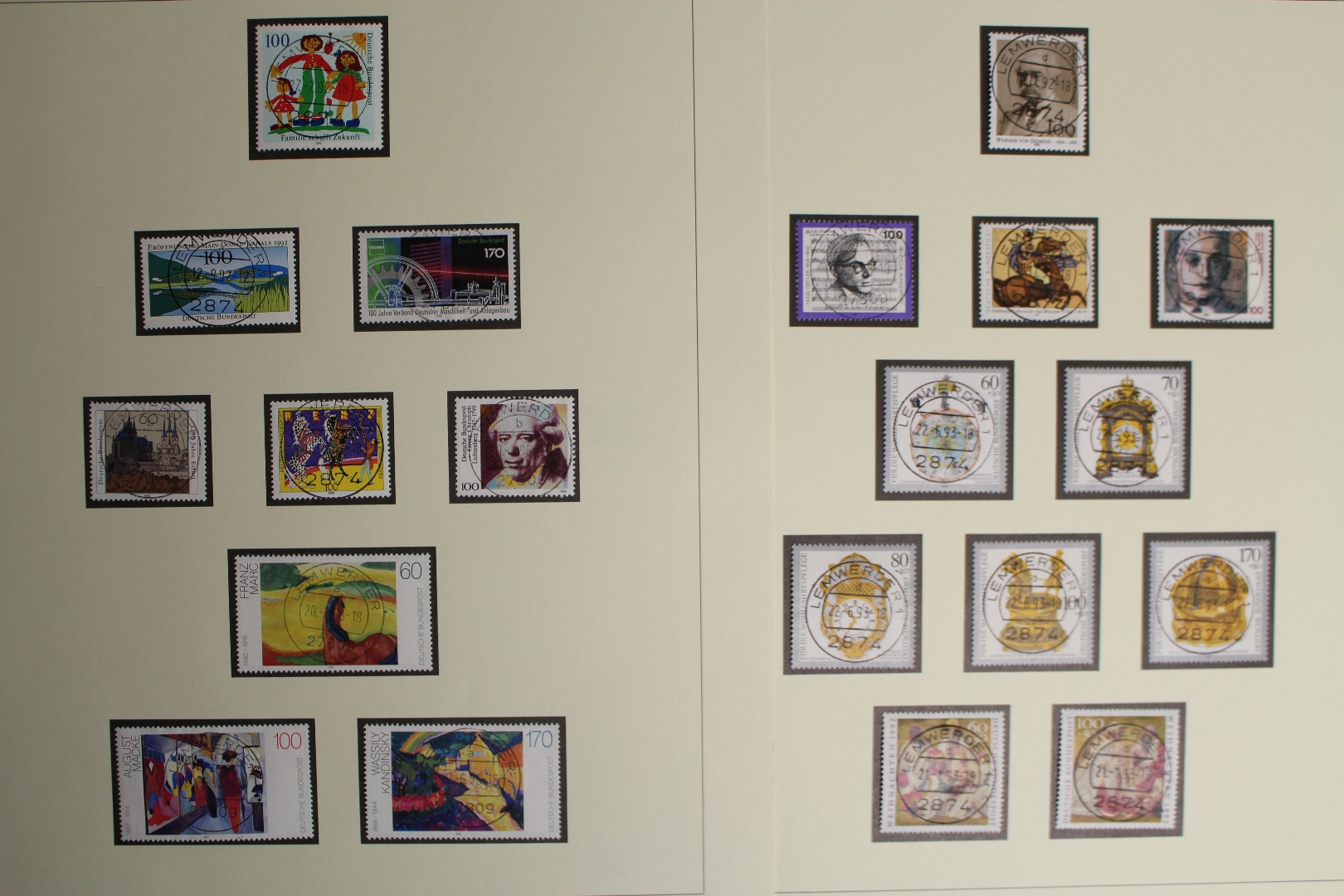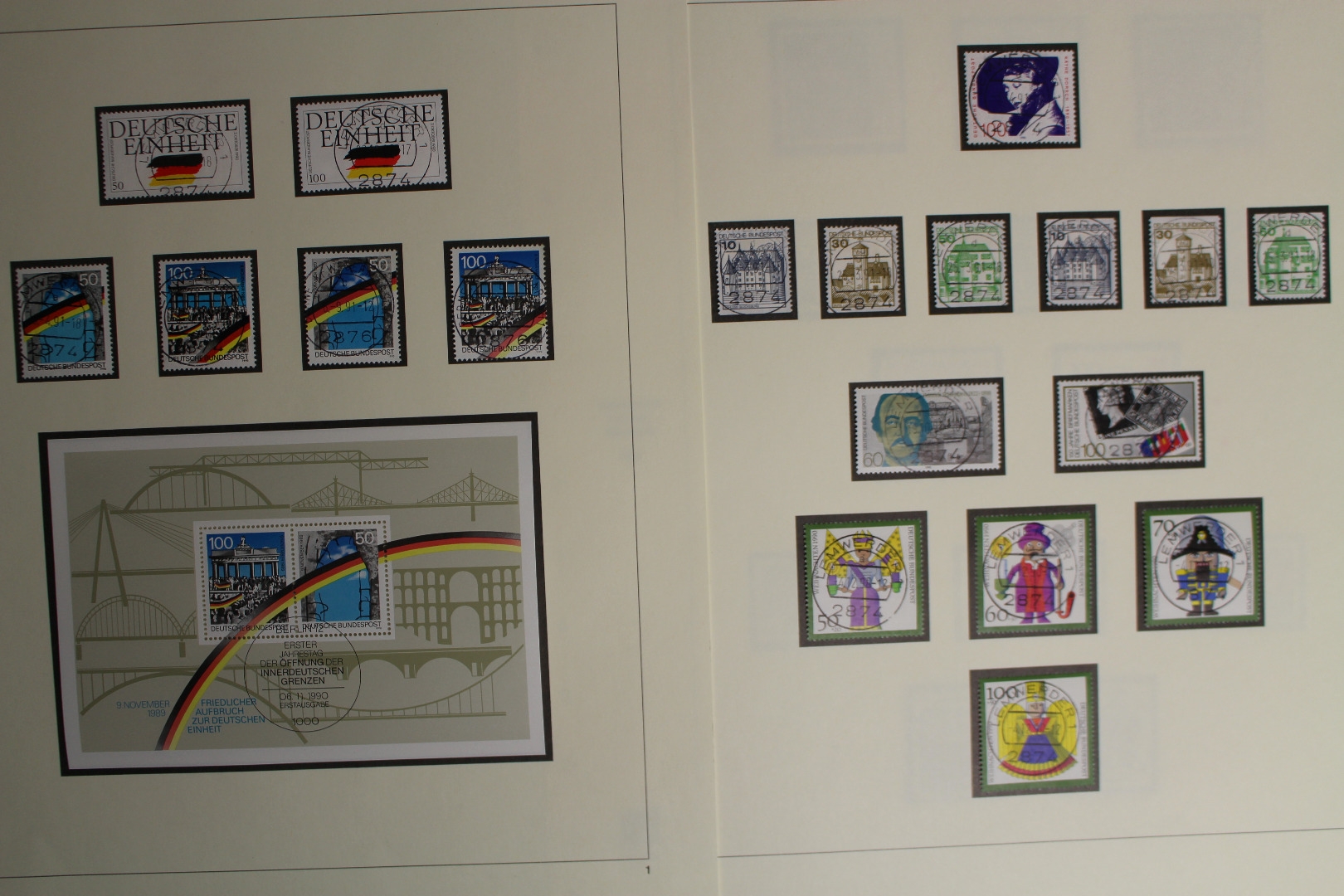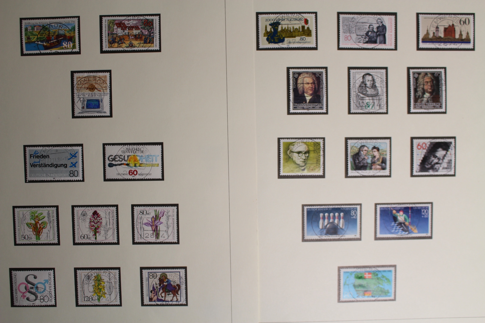 Sehr umfangreiche Sammlung, überwiegend wurden die Briefmarken mit sauberen zentrischen Tagesstempeln gesammelt. Die Briefmarken sind meist ohne Gummierung und wurden sauber auf SAFE Vordruckblättern eingefalzt. Die Folien sind nicht enthalten. Die Blöcke sind meist mit ESST. Auch sind viele Besonderheiten wie z.B. C/D Werte der Dauerserien und Blockeinzelmarken enthalten. Die Qualität ist überwiegend gut.
