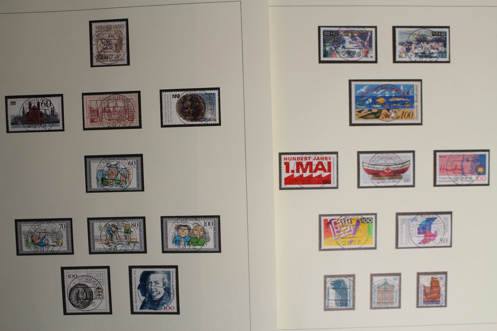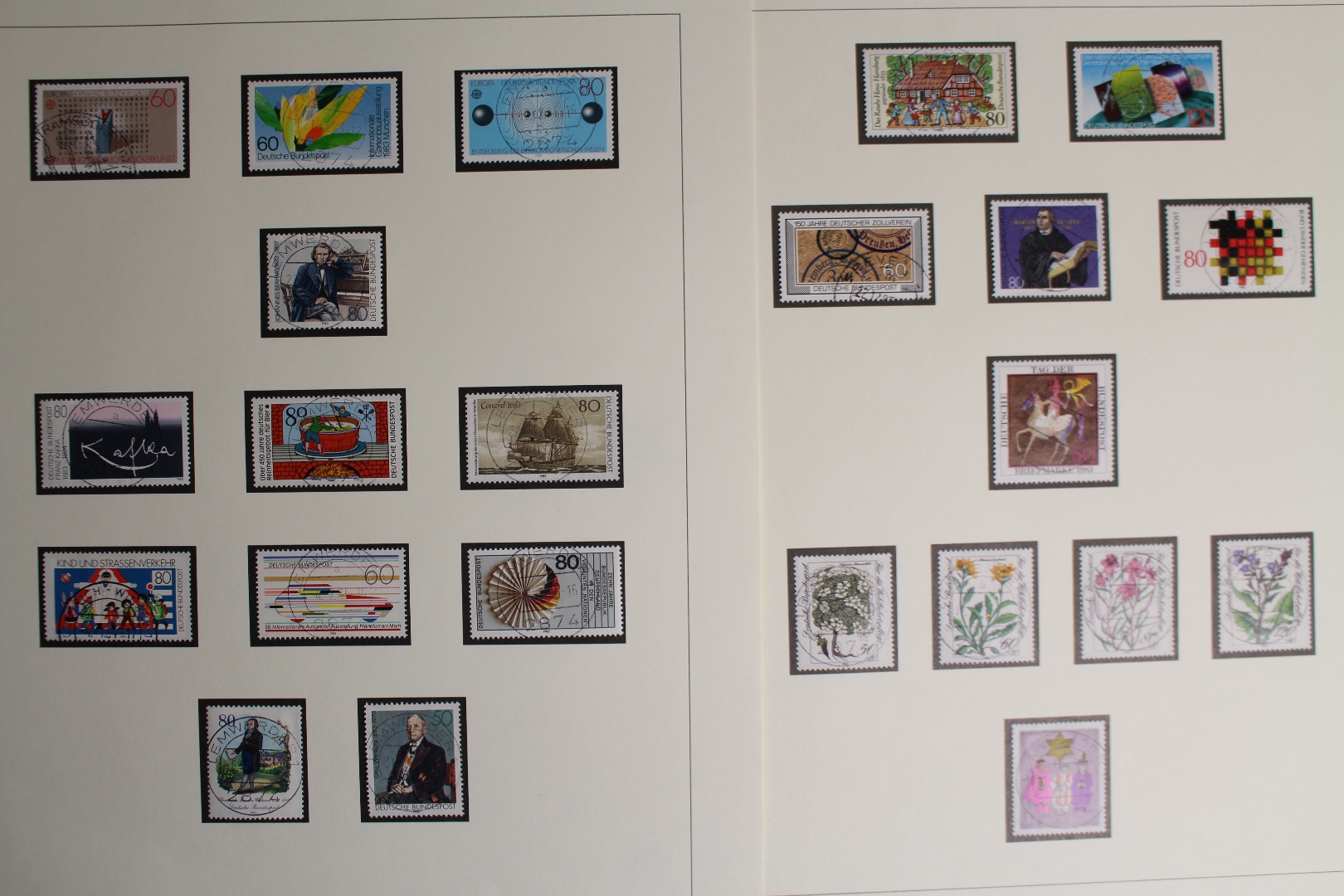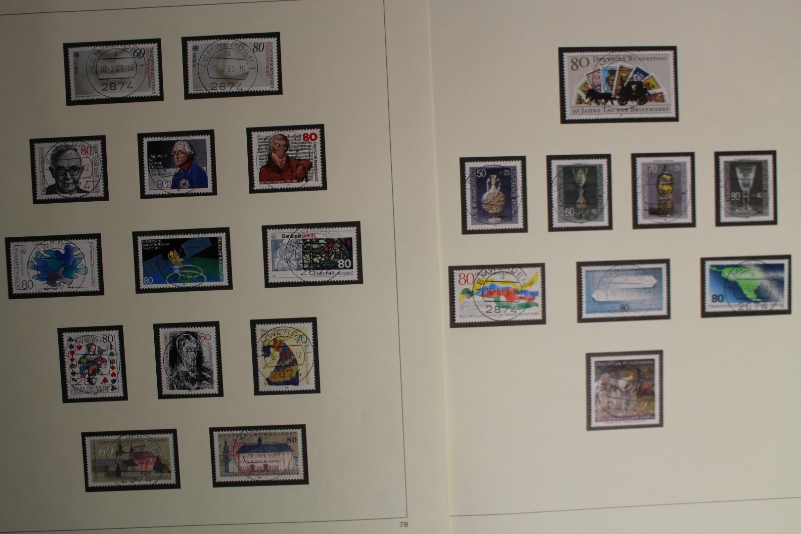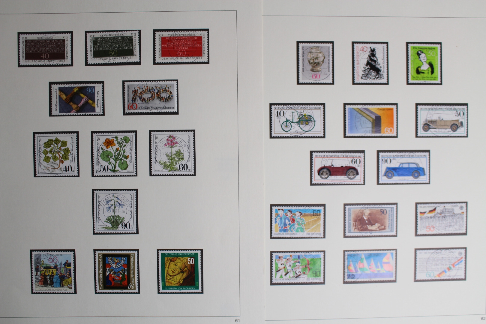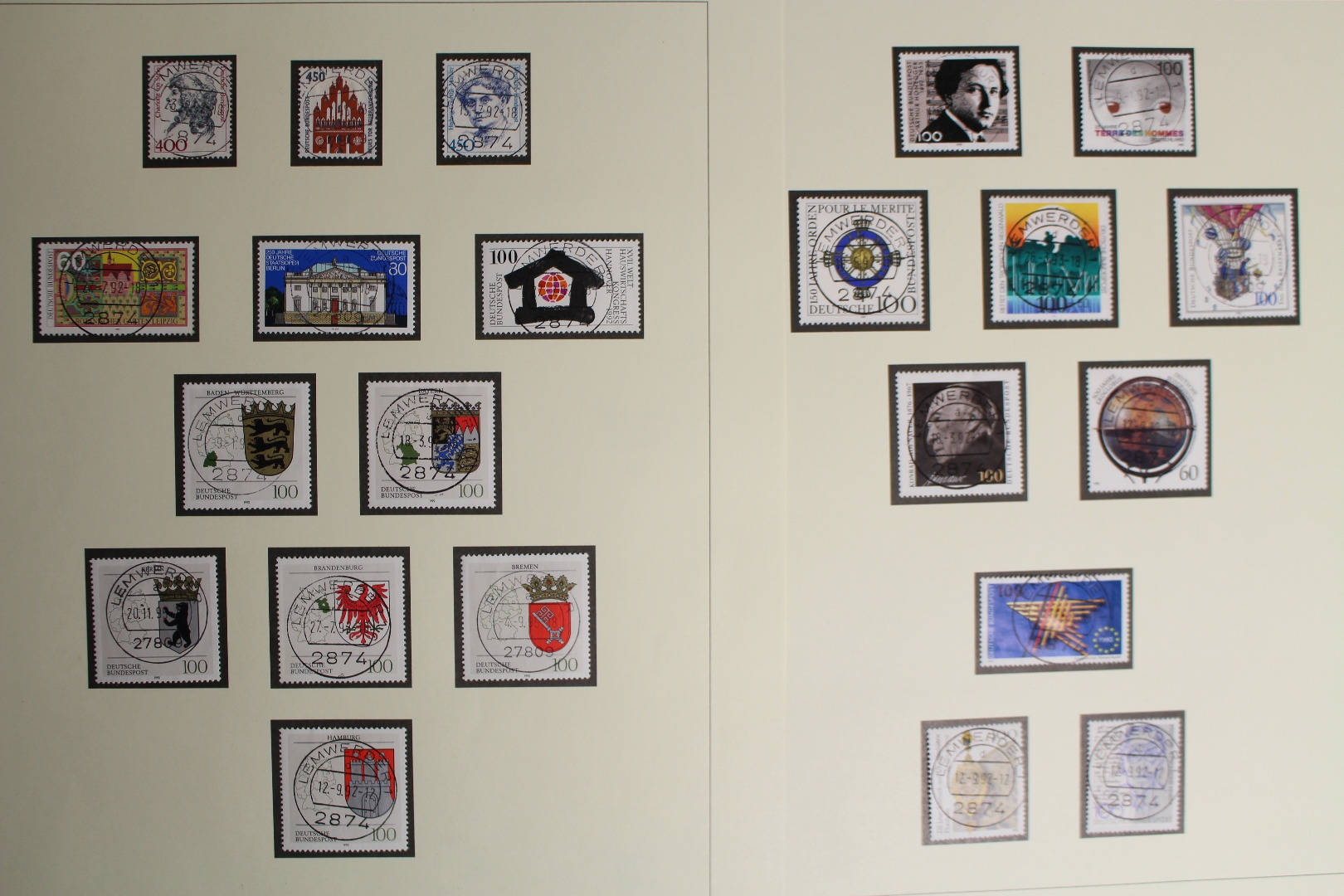 Sehr umfangreiche Sammlung, überwiegend wurden die Briefmarken mit sauberen zentrischen Tagesstempeln gesammelt. Die Briefmarken sind meist ohne Gummierung und wurden sauber auf SAFE Vordruckblättern eingefalzt. Die Folien sind nicht enthalten. Die Blöcke sind meist mit ESST. Auch sind viele Besonderheiten wie z.B. C/D Werte der Dauerserien und Blockeinzelmarken enthalten. Die Qualität ist überwiegend gut.