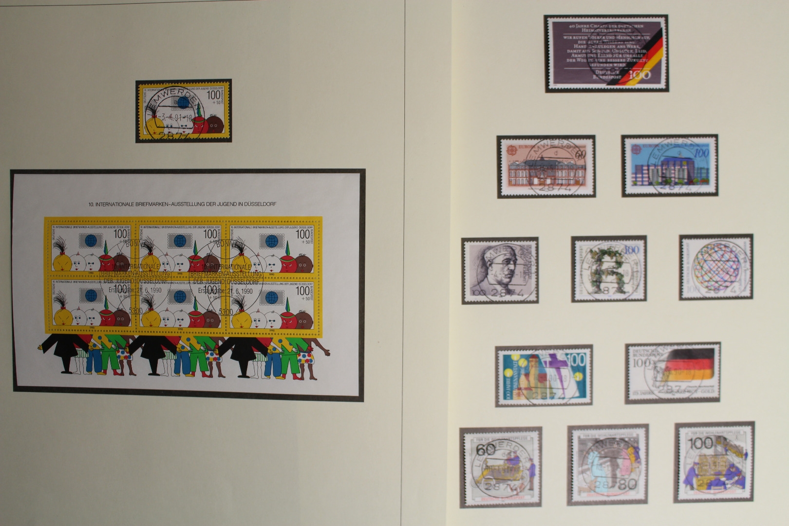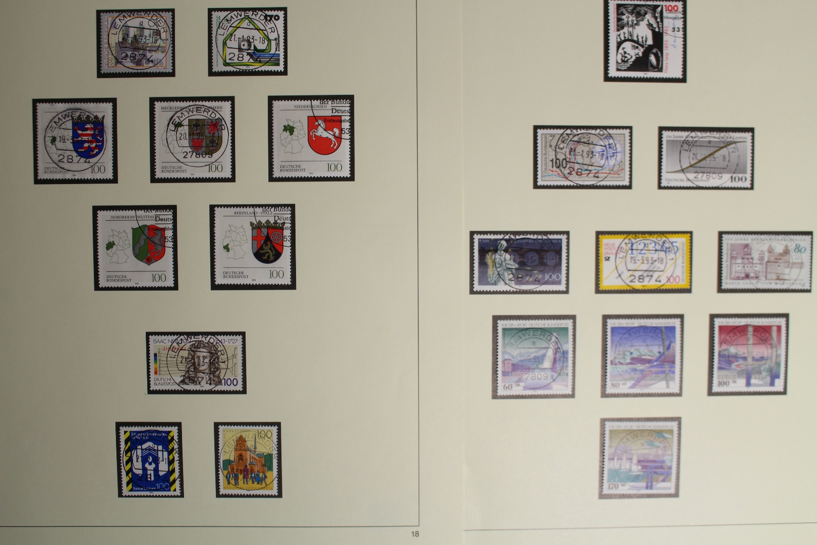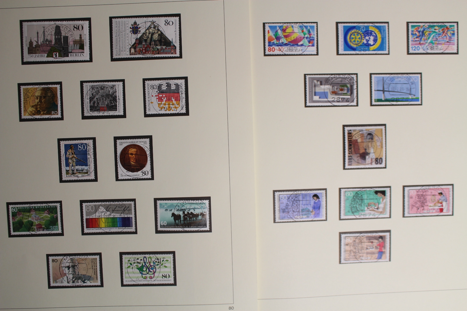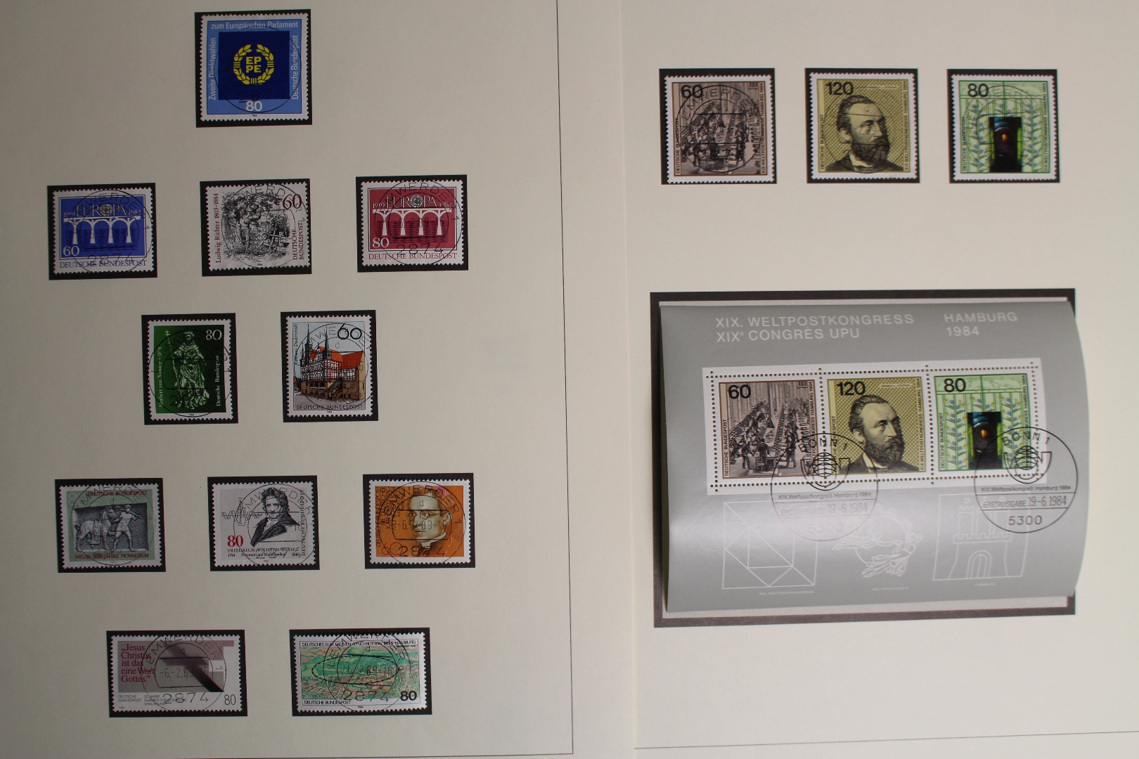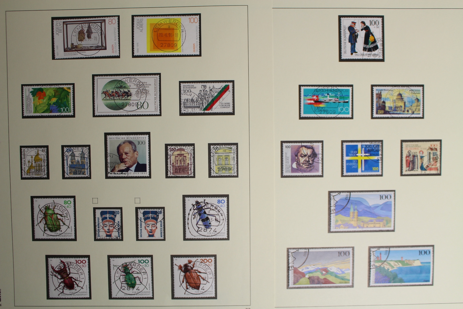 Sehr umfangreiche Sammlung, überwiegend wurden die Briefmarken mit sauberen zentrischen Tagesstempeln gesammelt. Die Briefmarken sind meist ohne Gummierung und wurden sauber auf SAFE Vordruckblättern eingefalzt. Die Folien sind nicht enthalten. Die Blöcke sind meist mit ESST. Auch sind viele Besonderheiten wie z.B. C/D Werte der Dauerserien und Blockeinzelmarken enthalten. Die Qualität ist überwiegend gut.