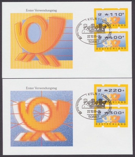 100, 110, 220, 300, 400 und 440 Pf. Postemblem, 6 Werte auf 3 illustrierten Umschlägen mit Ersttagssonderstempel Köln