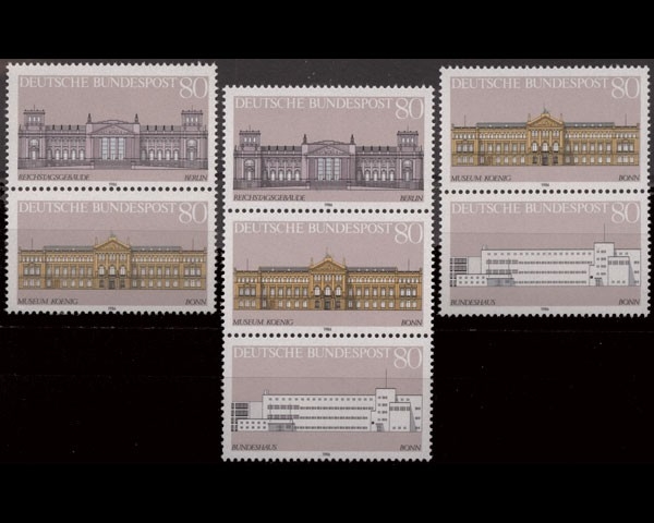 Bedeutende Gebäude der BRD, Blockeinzelmarken, 3 verschiedene Zusammendruck - Kombinationen