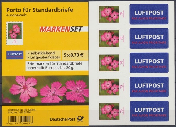 5 x 70 Cent Kartäusernelke, mit Luftpostaufkleber, Folienblatt.