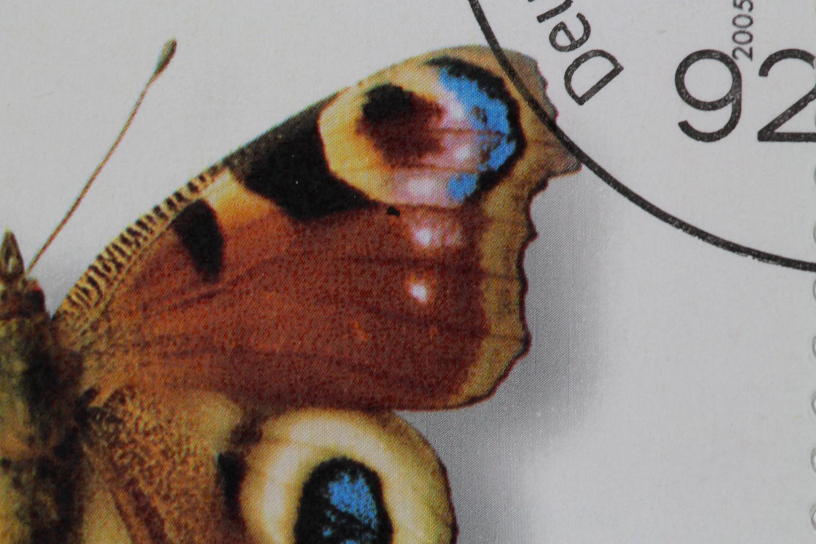 Schmetterling, Plattenfehler: Fleck unter dem Auge des rechten Flügels (Feld 6)